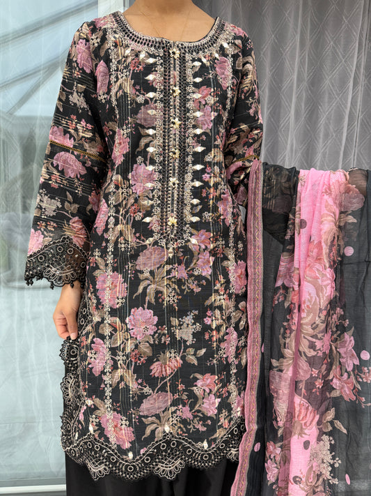 GULNAZ - Emroidered floral monar outfit with plazo (pink flower)