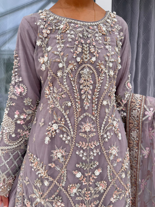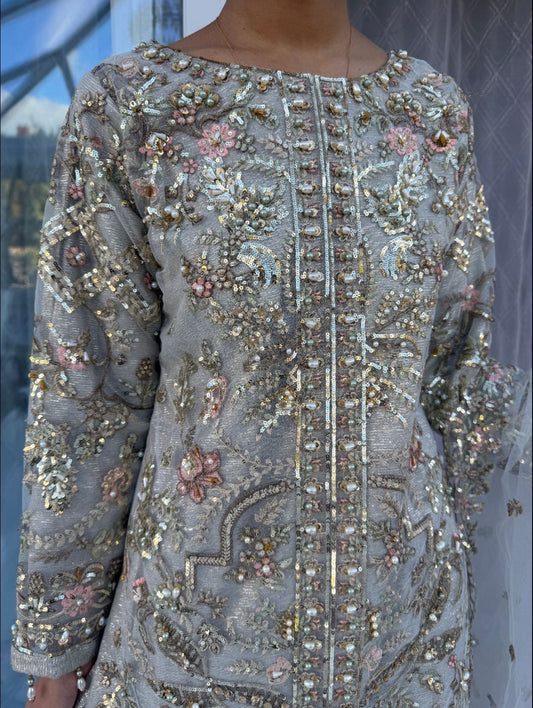 ALAIRA LIGHT GREY - Handwork embellished net outfit with Sharara