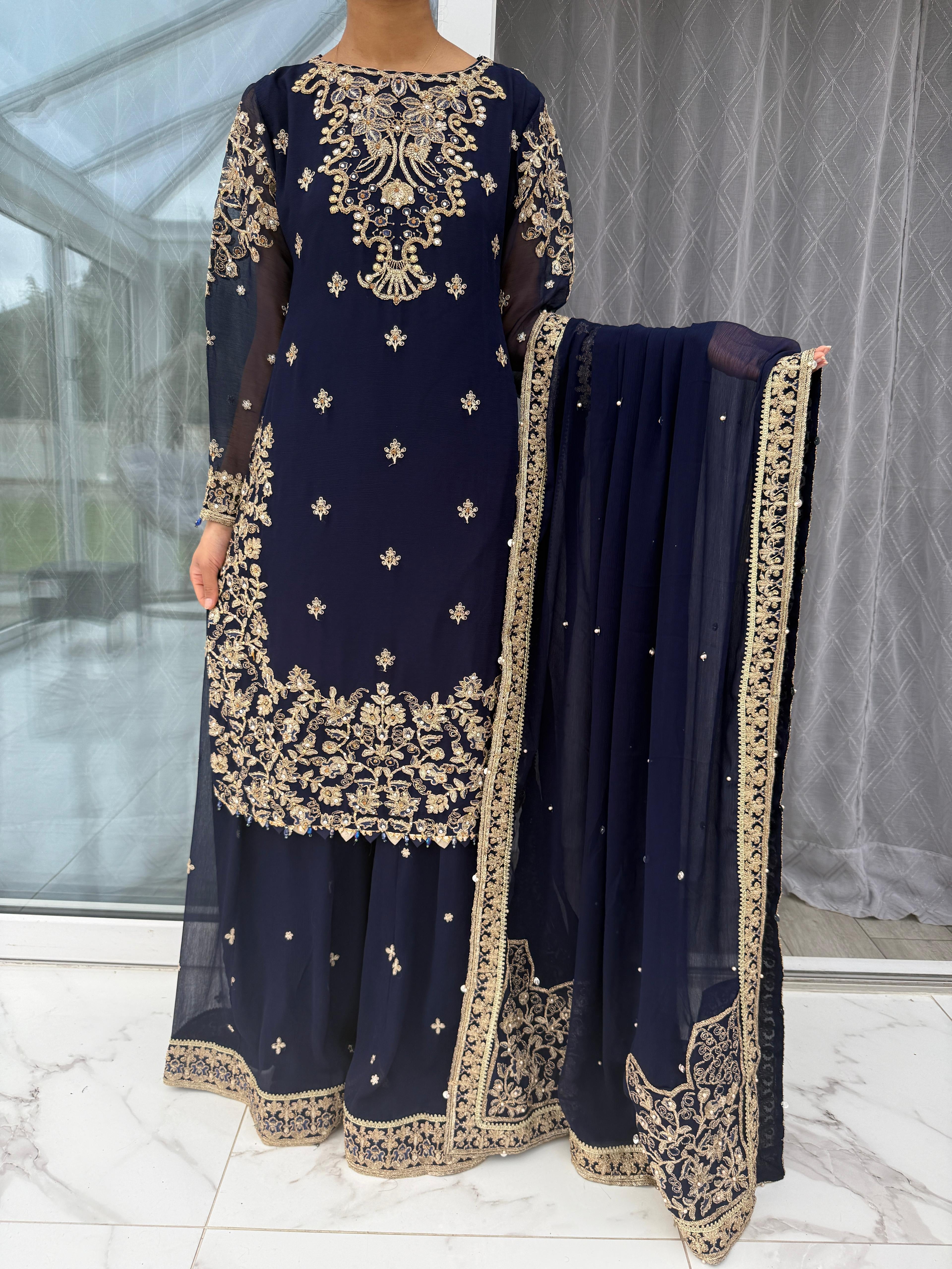 SAPNA - Embroidered net kameez with sharara and chiffon dupatta