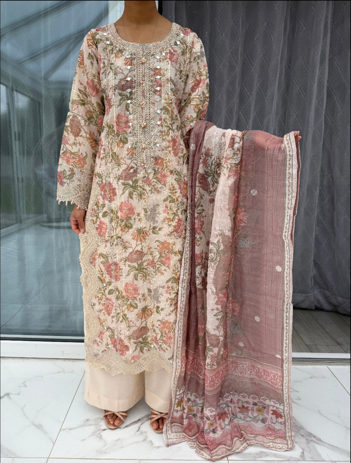 AYNAZ - Embroidered floral printed monar outfit with Kali Sharara (pink flowers)