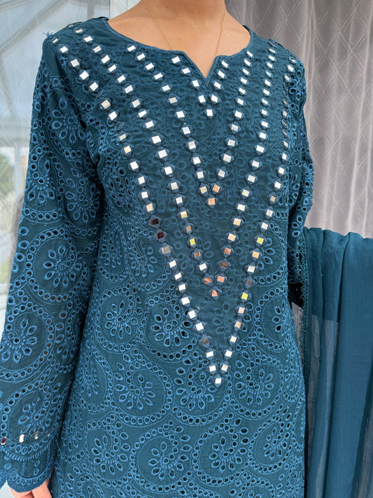 FAYZA - EMBROIDERED LINEN CHIKAN KARI KAMEEZ WITH PLAZO NAVY BLUE