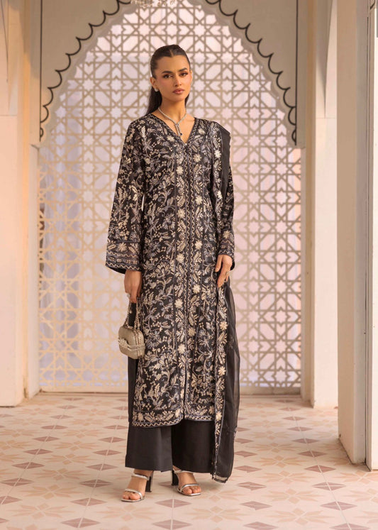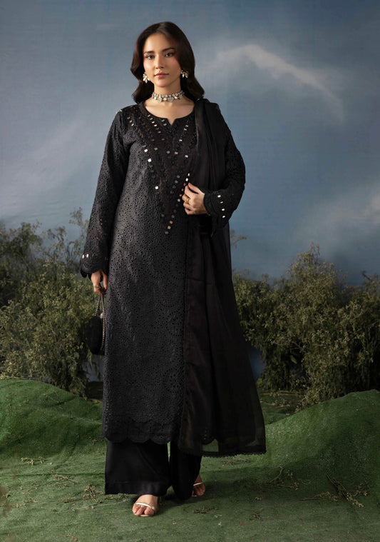 FAYZA - EMBROIDERED LINEN CHIKAN KARI KAMEEZ WITH PLAZO BLACK