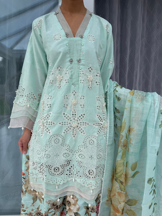 UMAYRA - Embroidered linen kameez with chiffon dupatta/plazo