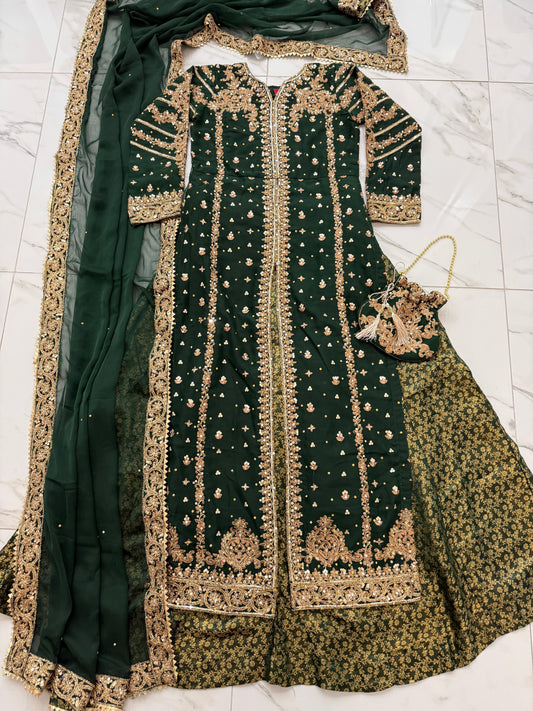 JANNAT - Embroidered chiffon kameez with brocade lengha green
