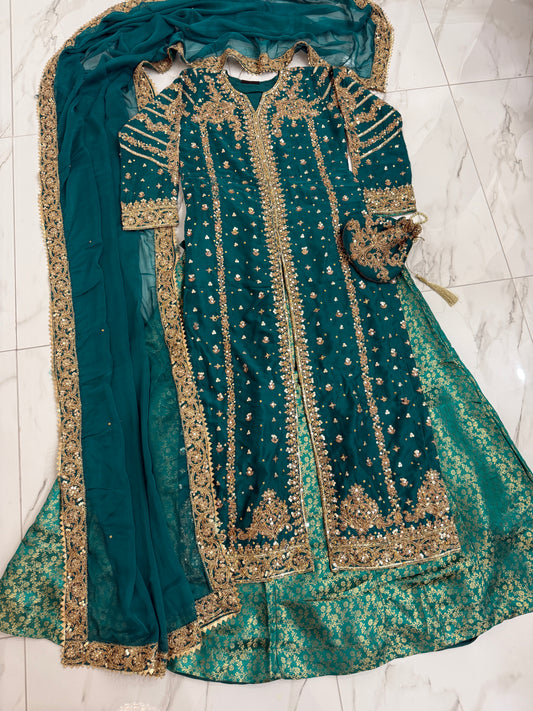 JANNAT TEAL - Embroidered chiffon kameez with brocade lengha