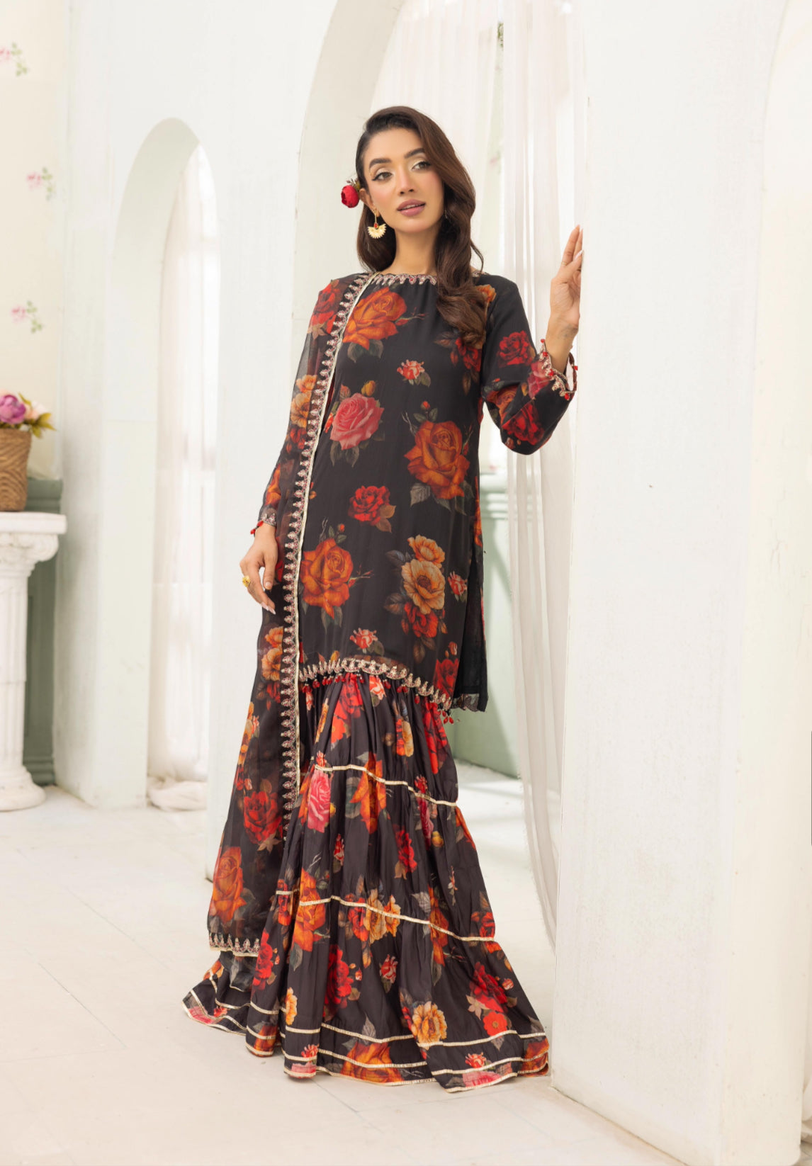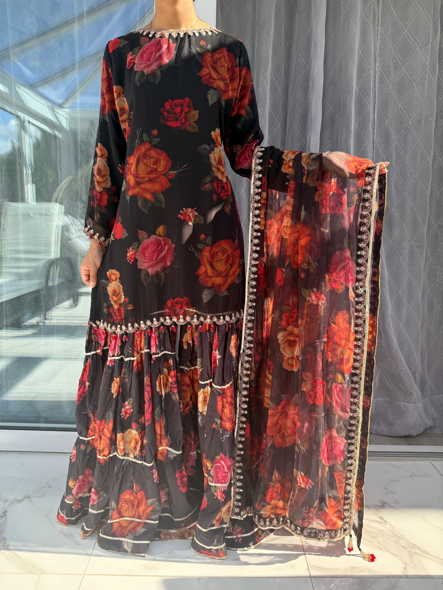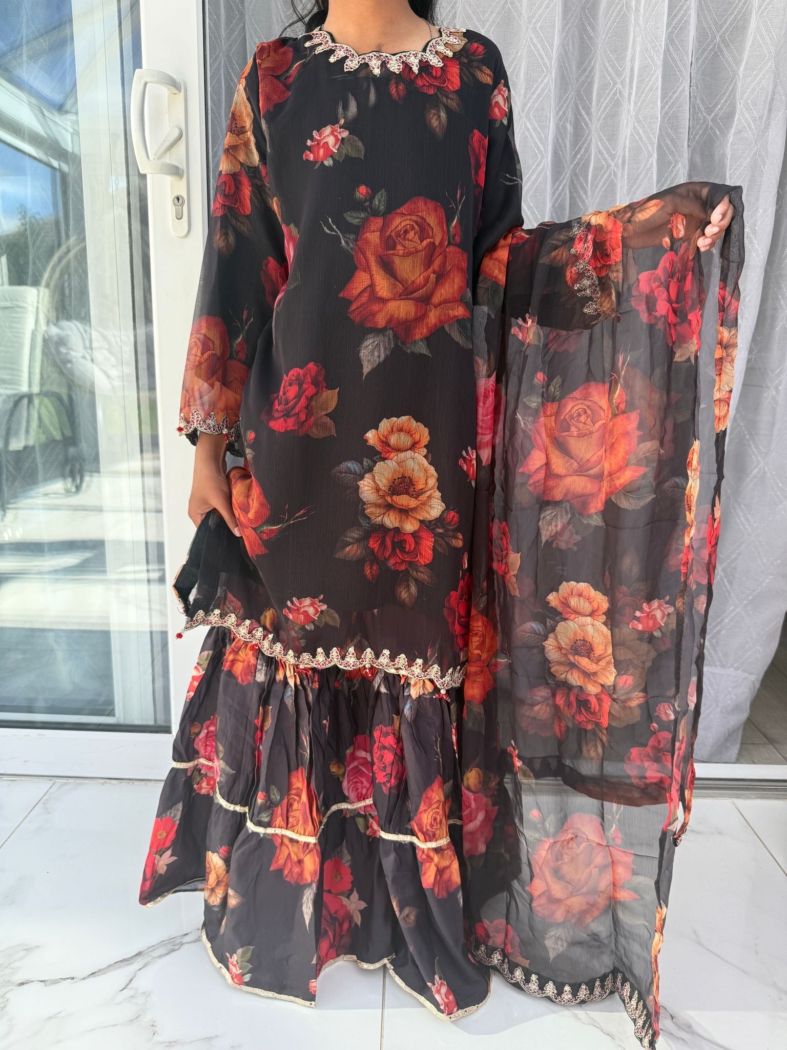 • Printed floral chiffon kameez with embroidery, sequins and embellishments