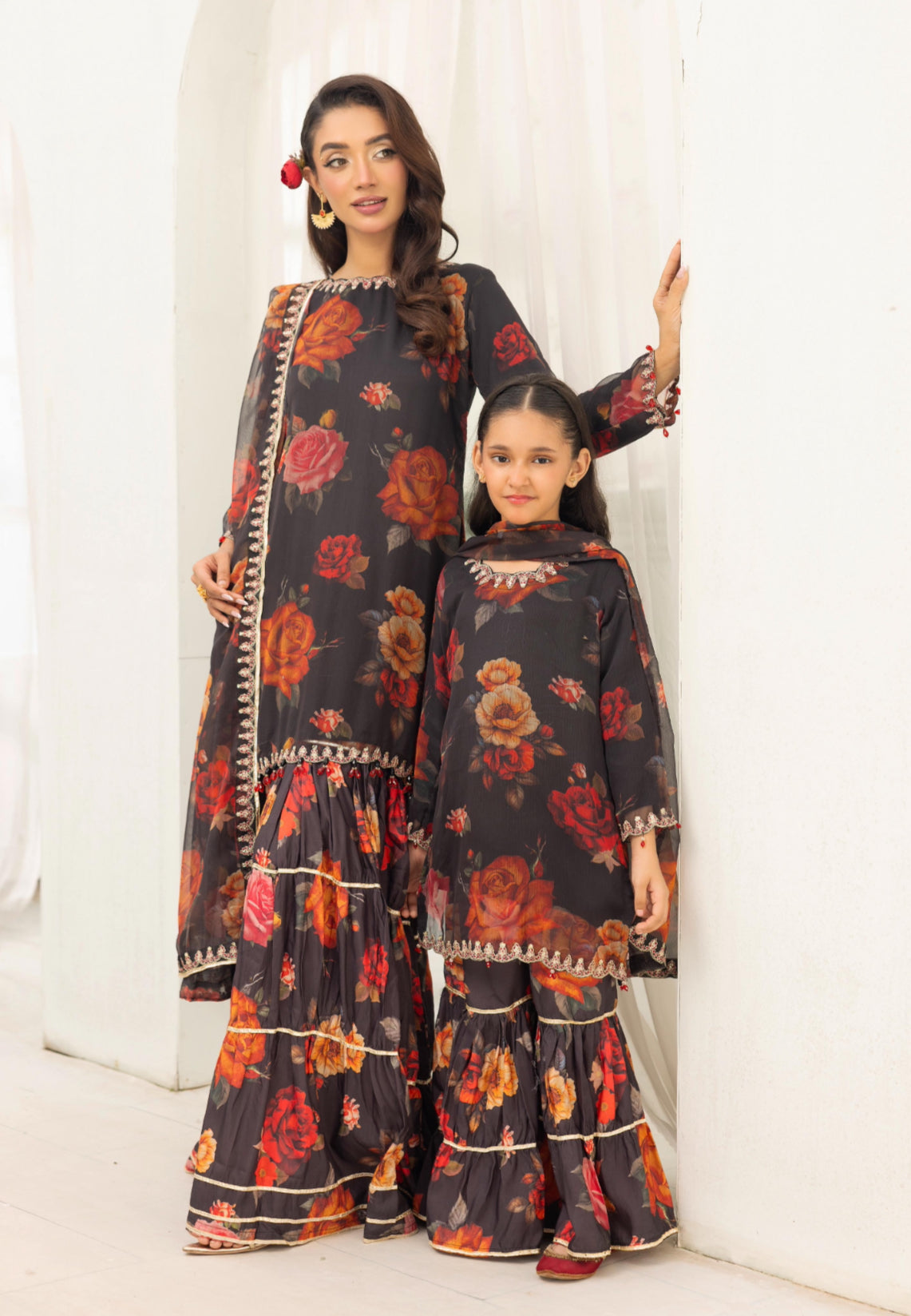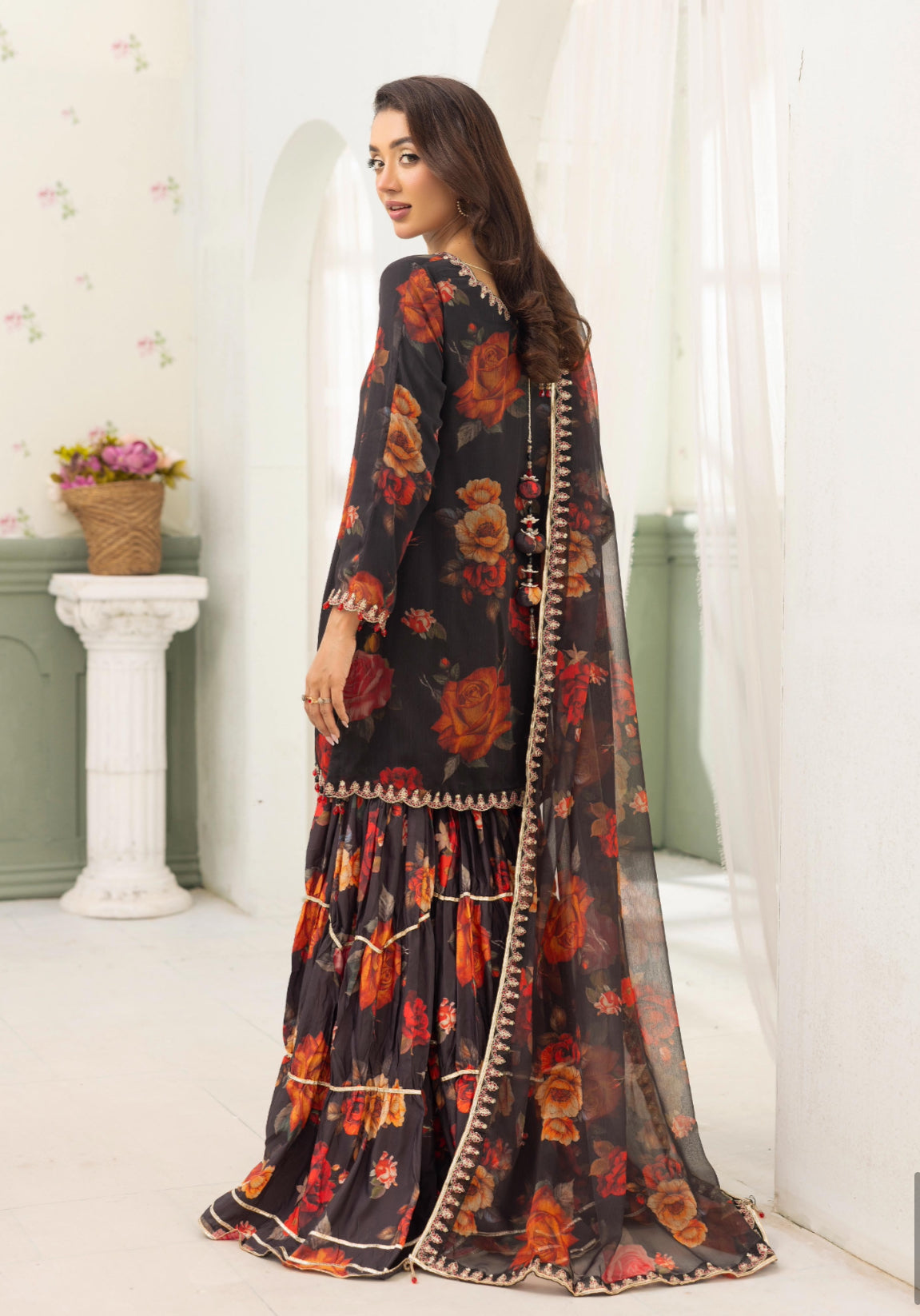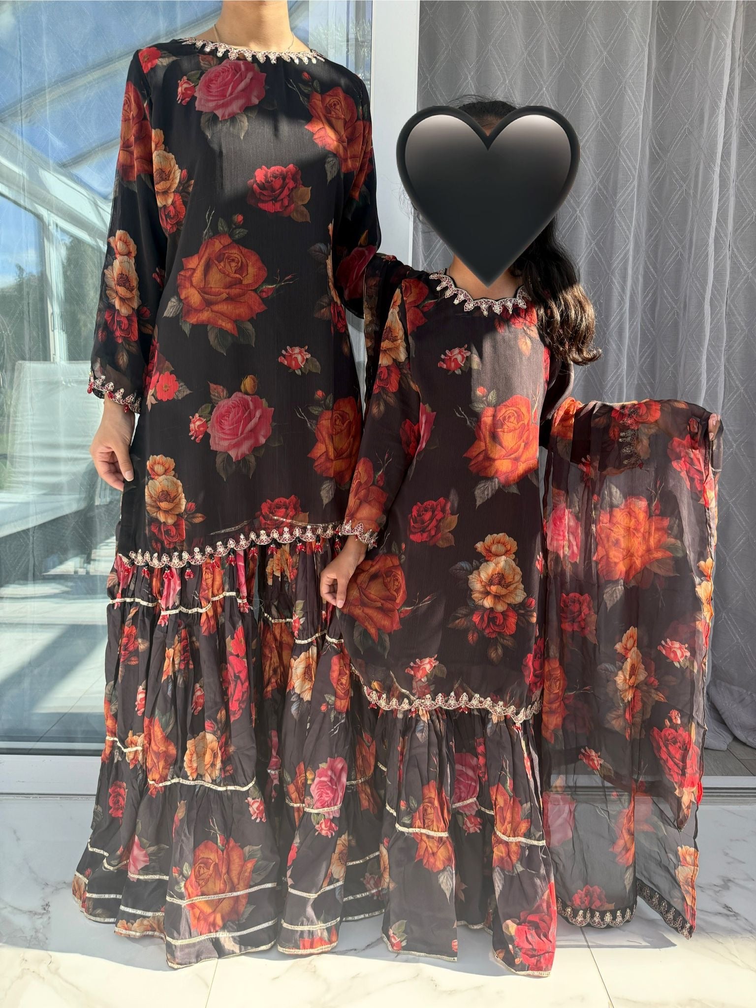• Printed floral chiffon kameez with embroidery, sequins and embellishments