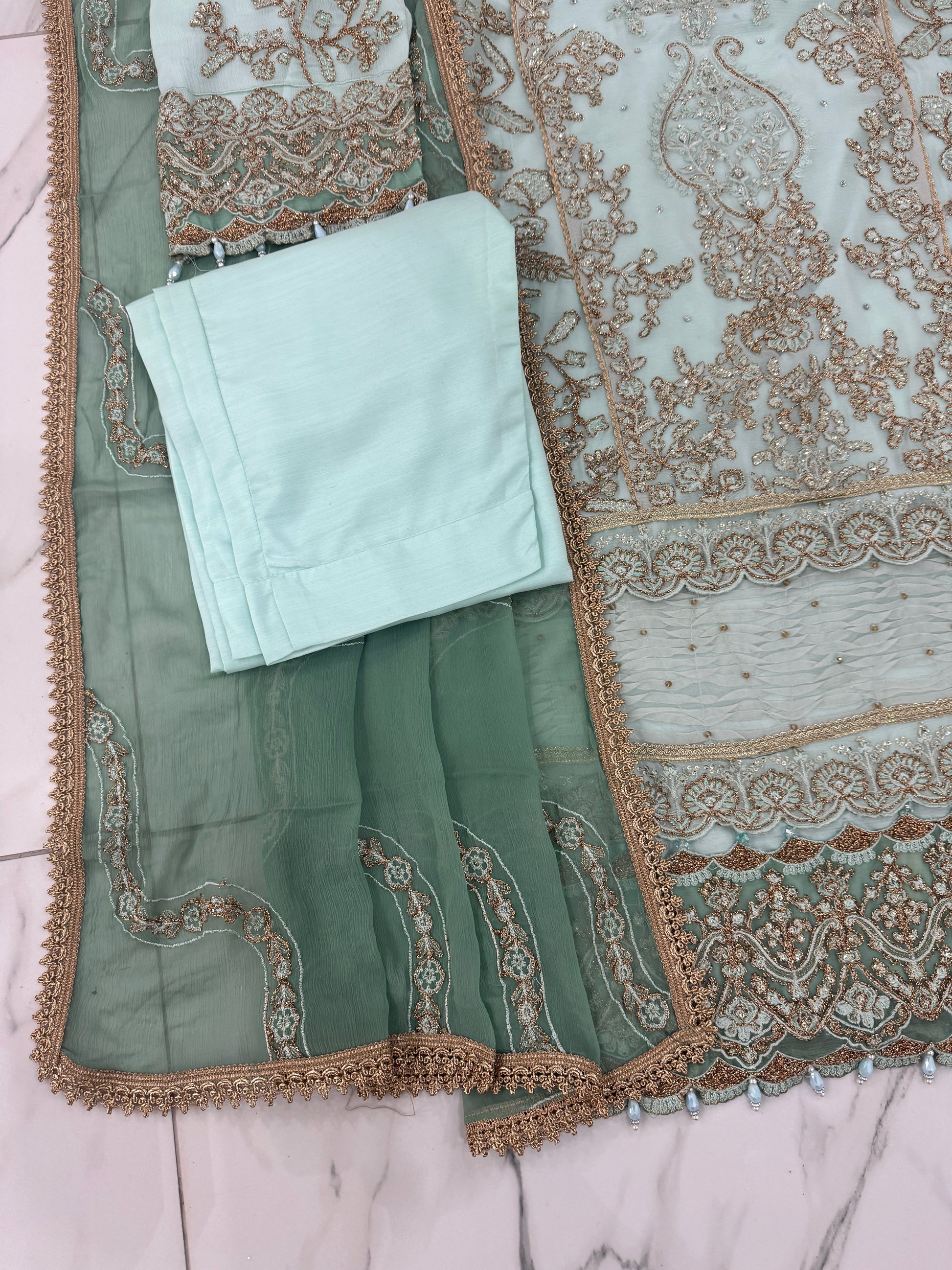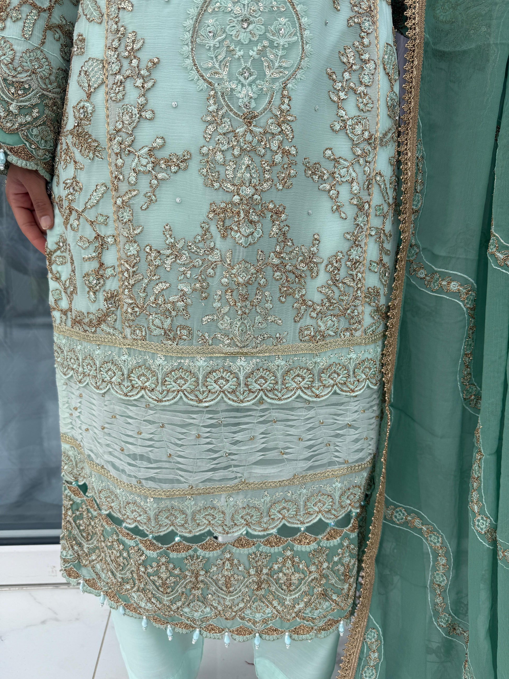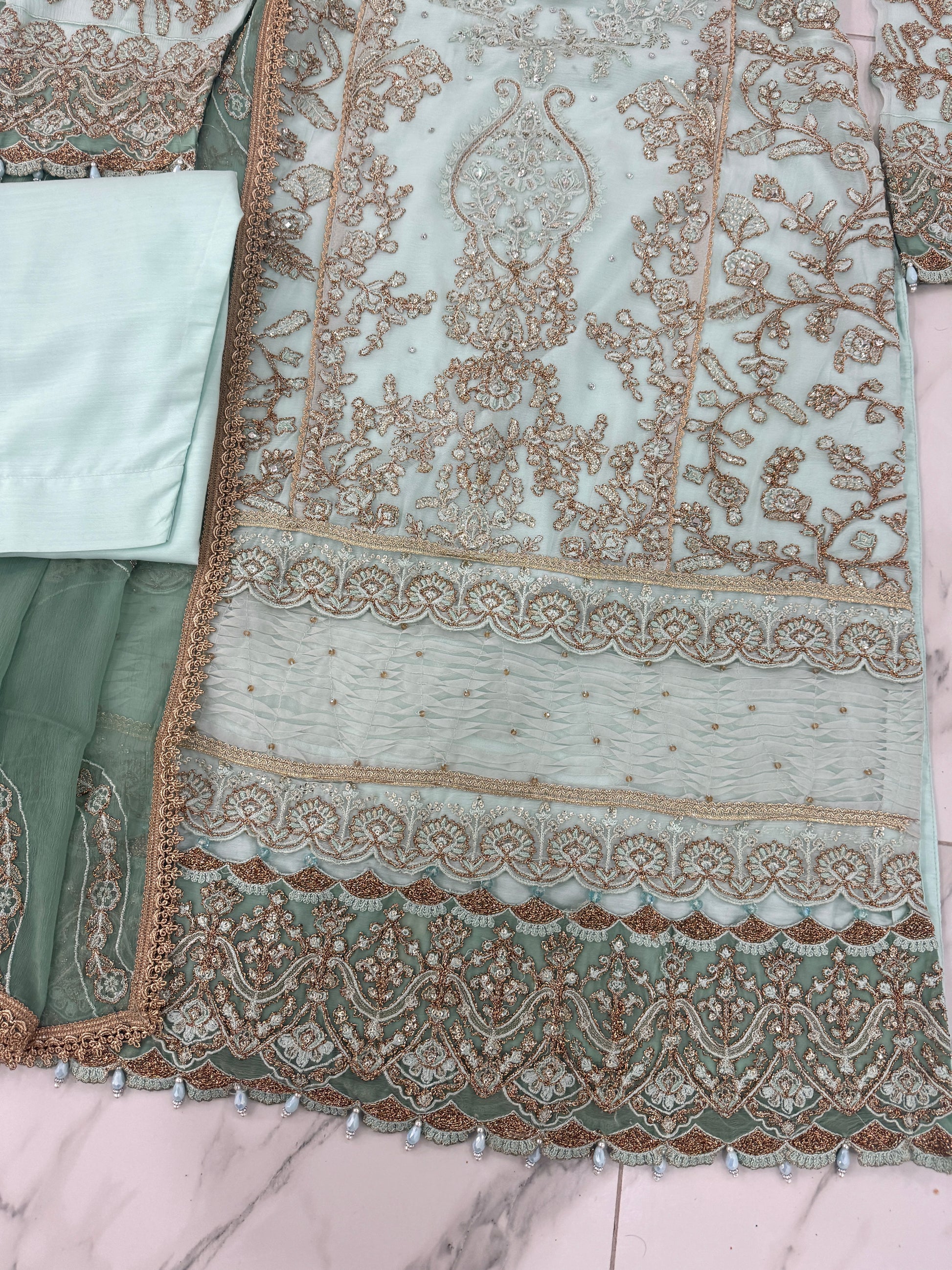 • Intricately embroidered chiffon kameez with sequins and tassels