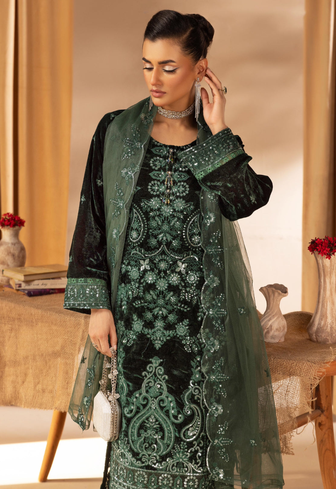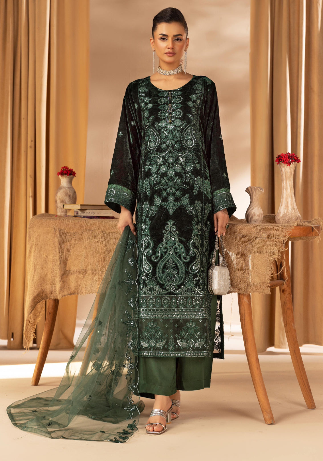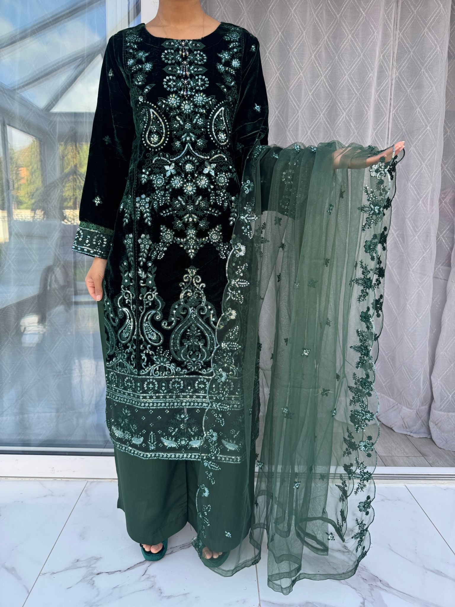 • Intricately embroidered velvet kameez with sequins and neckline embellishments
