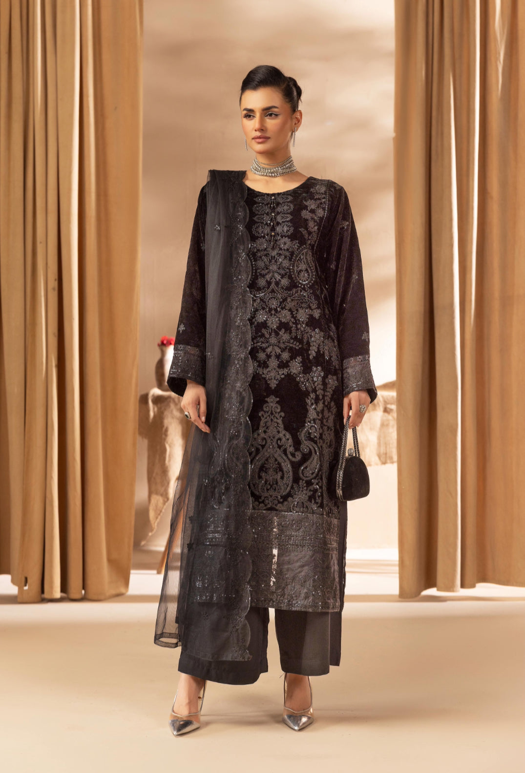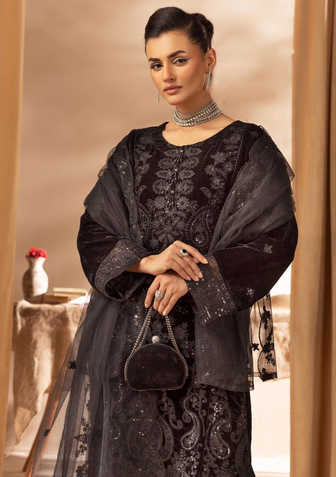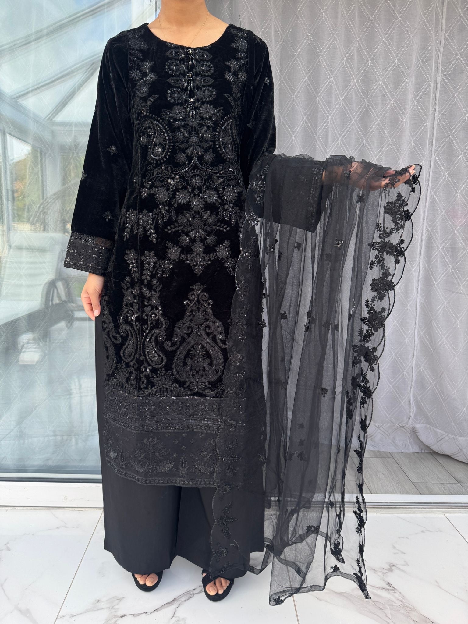 • Intricately embroidered velvet kameez with sequins and neckline embellishments