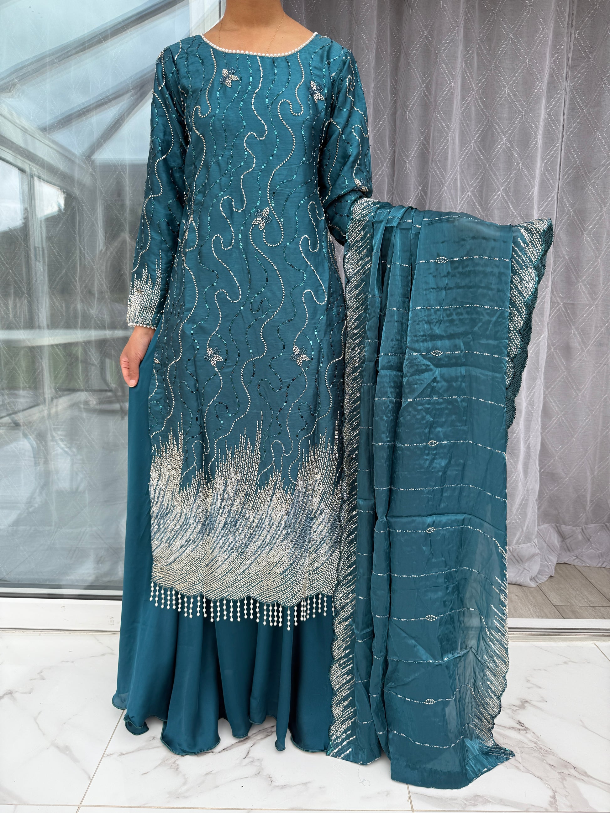 • Front and back Intricately embroidered silk gradient organza kameez with cutdana sequins, pearl embellishments and beads
