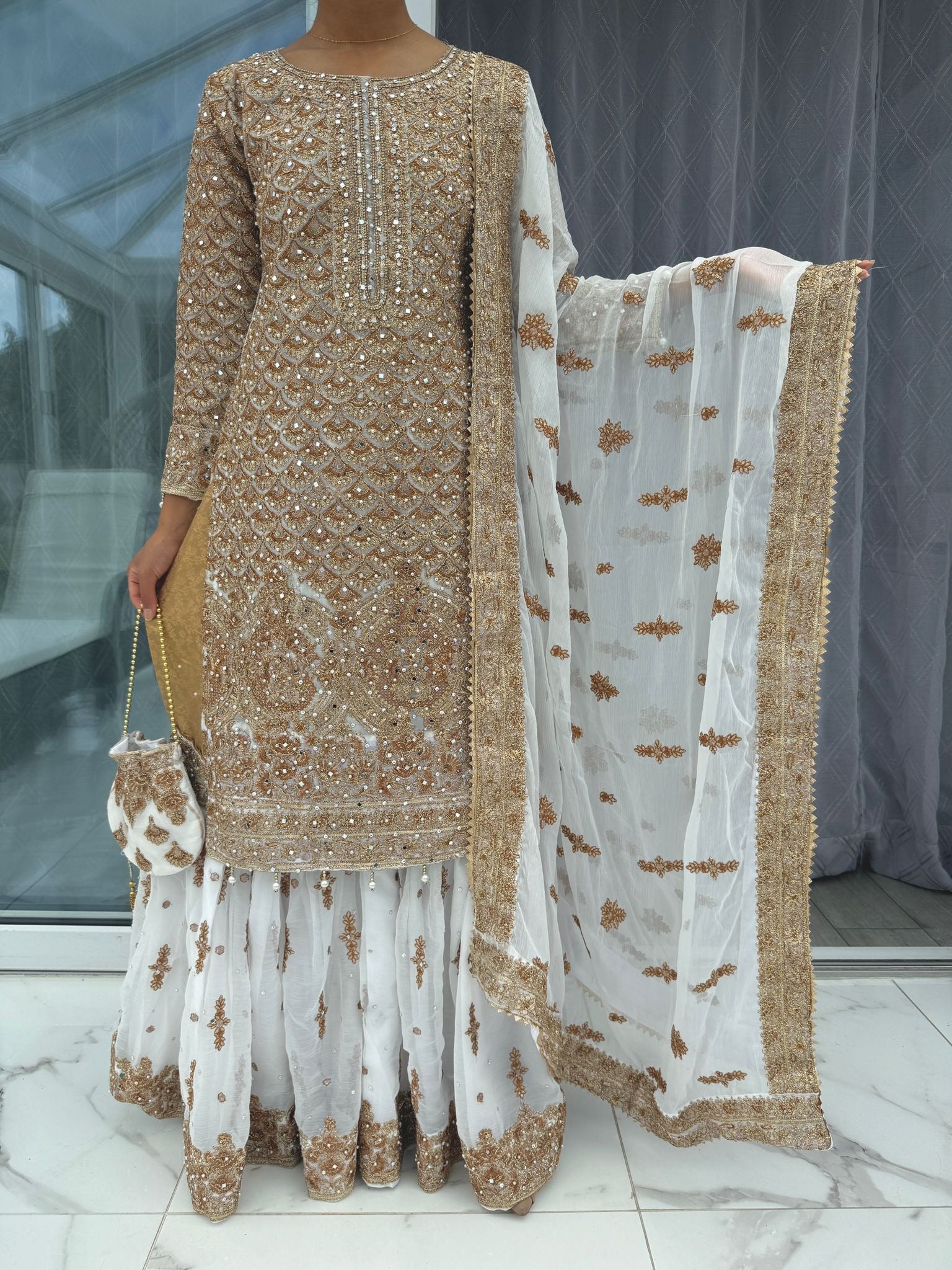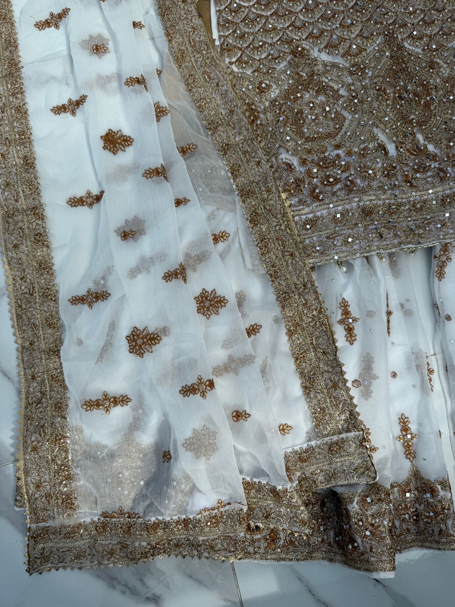 • Embroidered brocade and chiffon Gharara