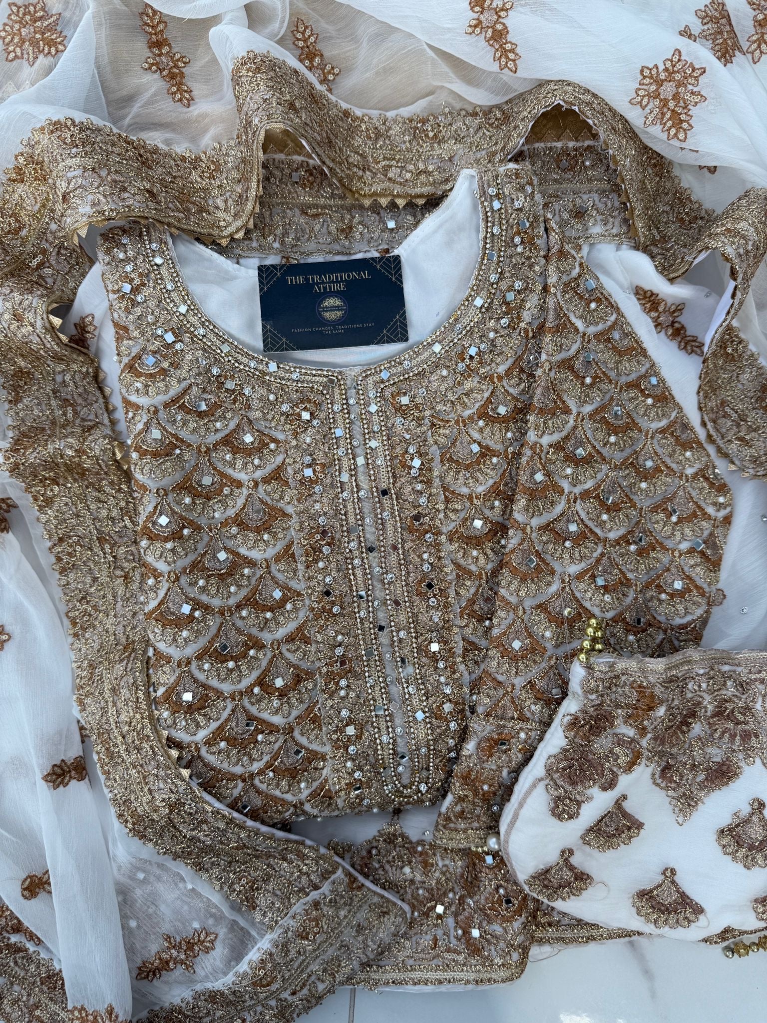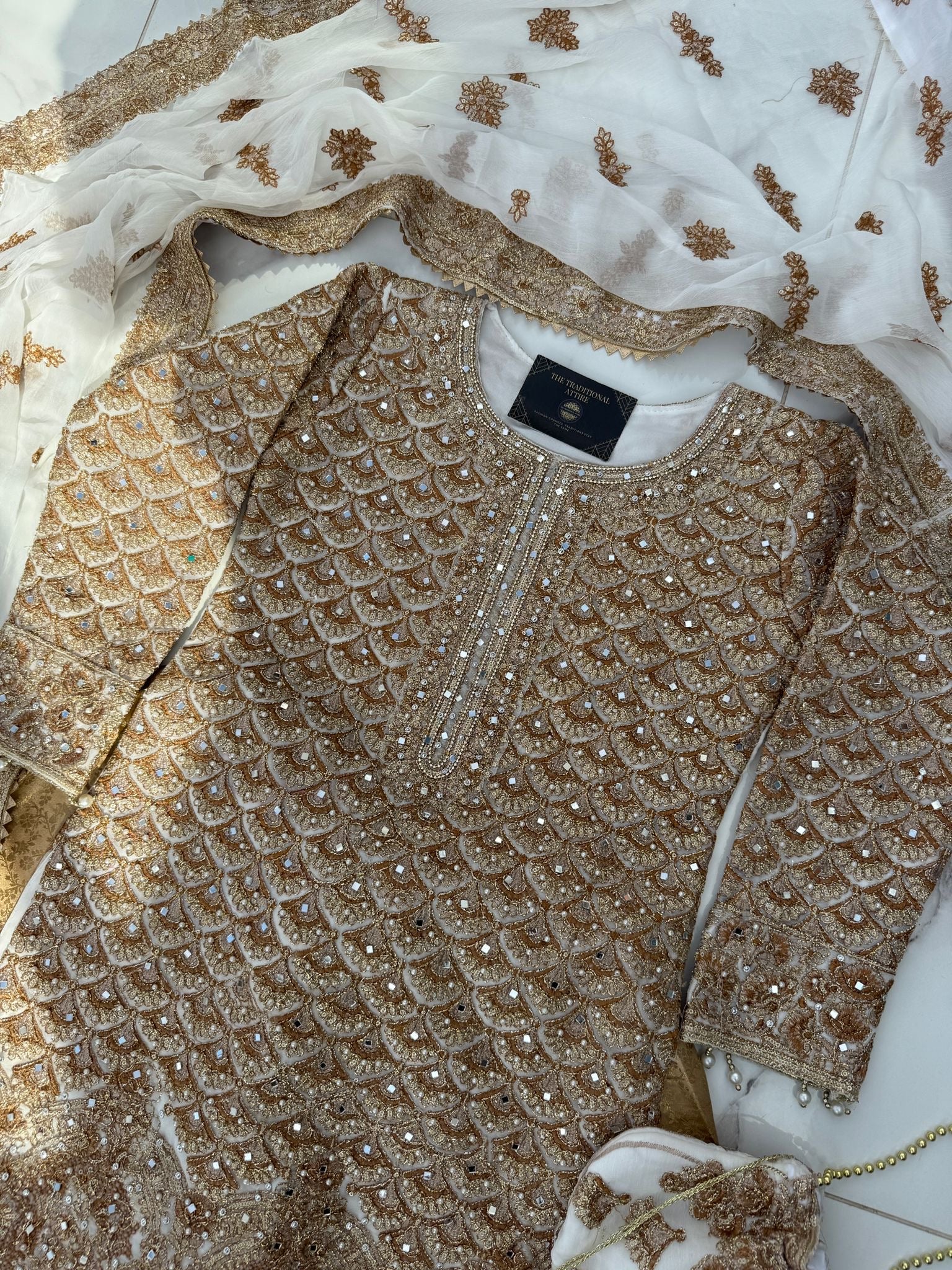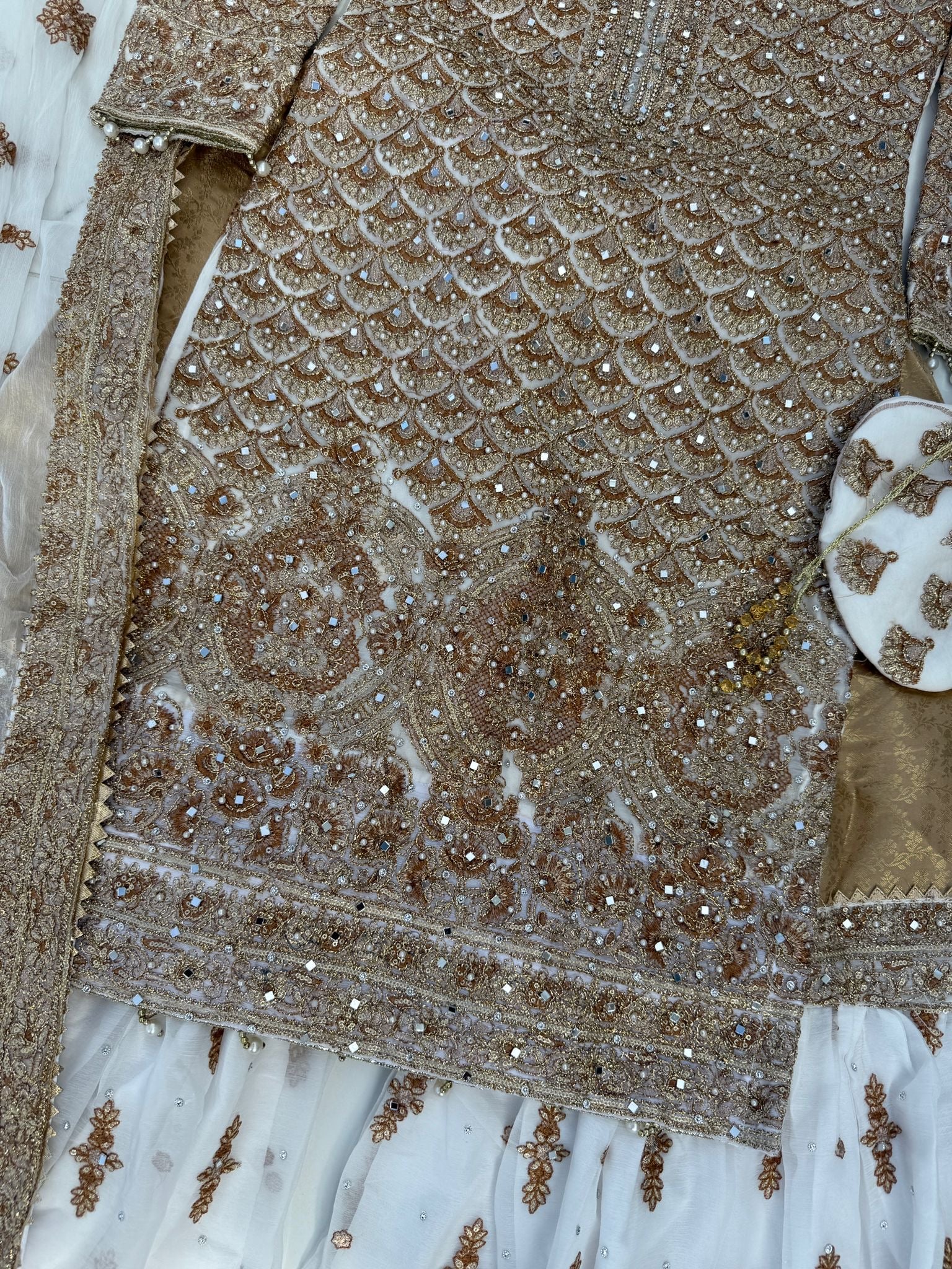 • Intricately embroidered chiffon kameez with mirrors and gems