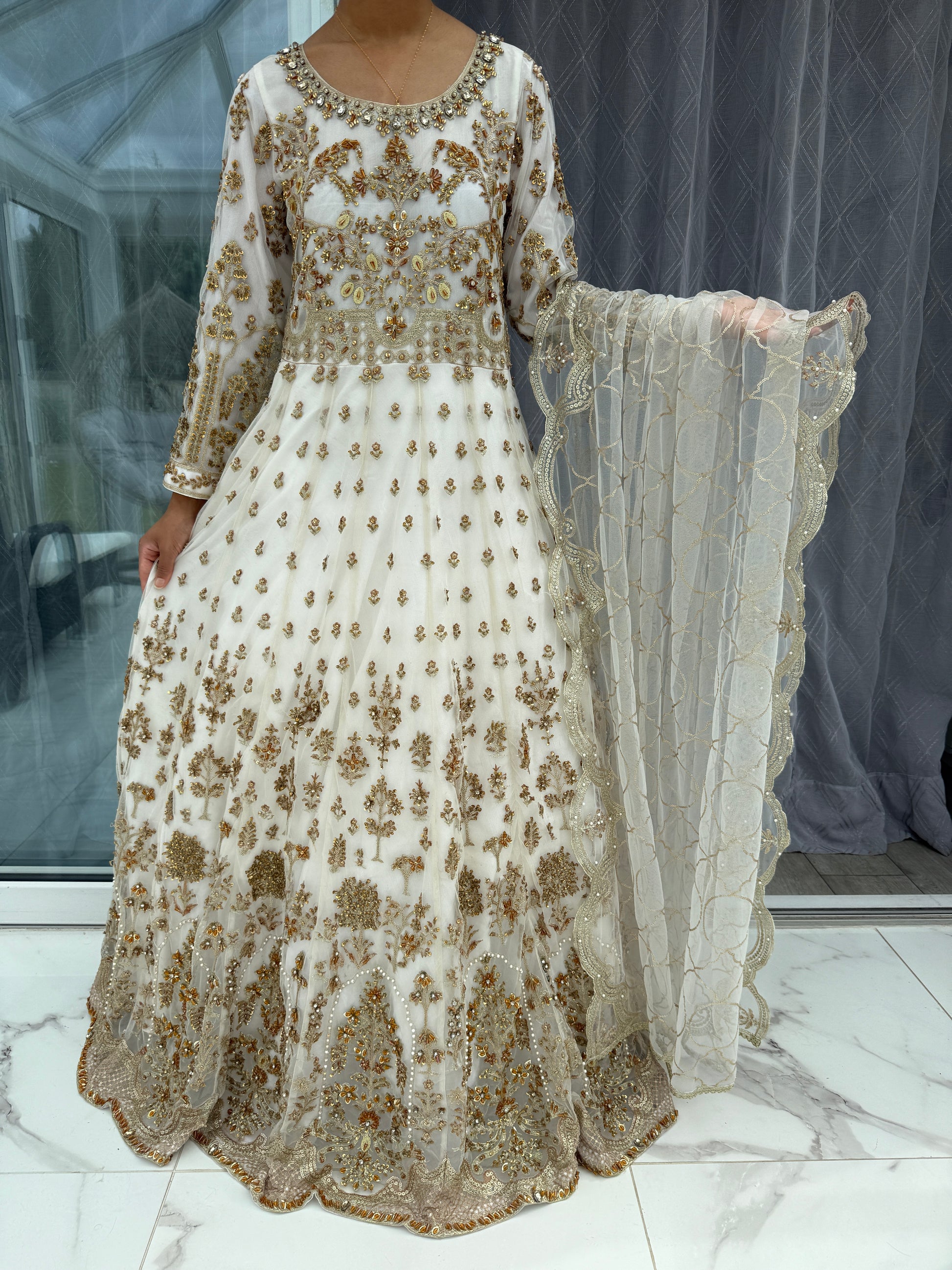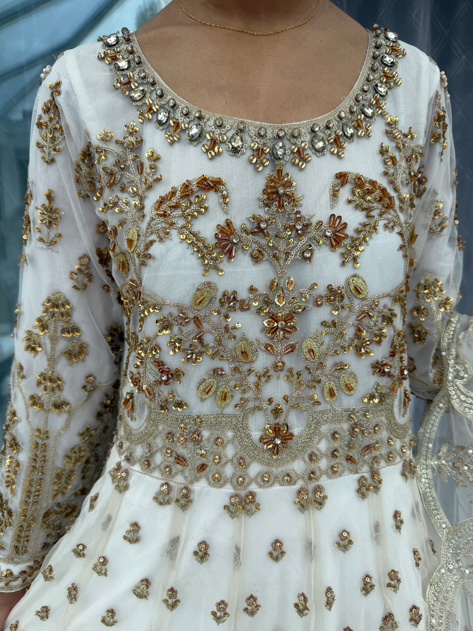 • Front and back Embroidered net dress with sequins and handwork, finished with a net crinoline