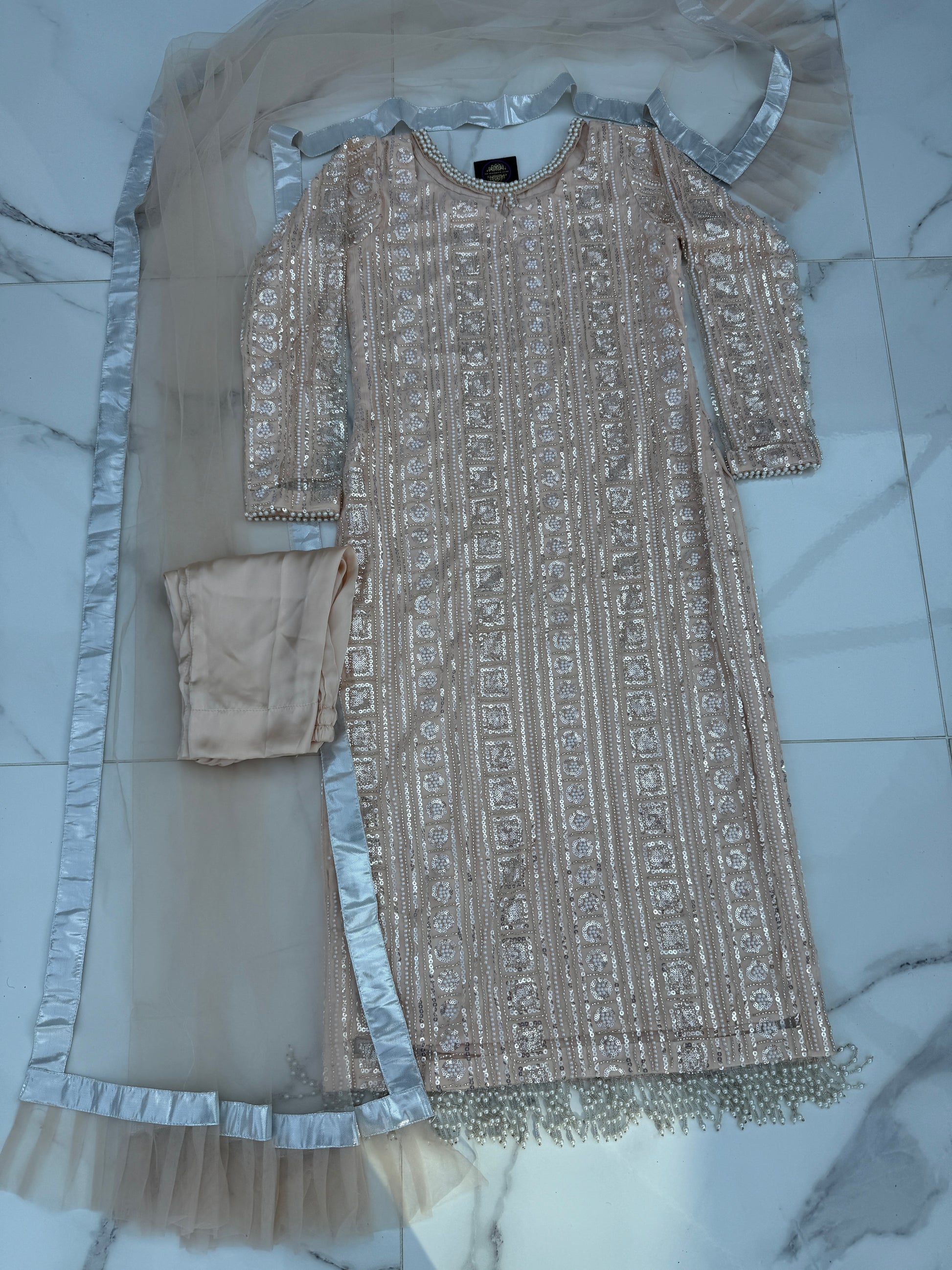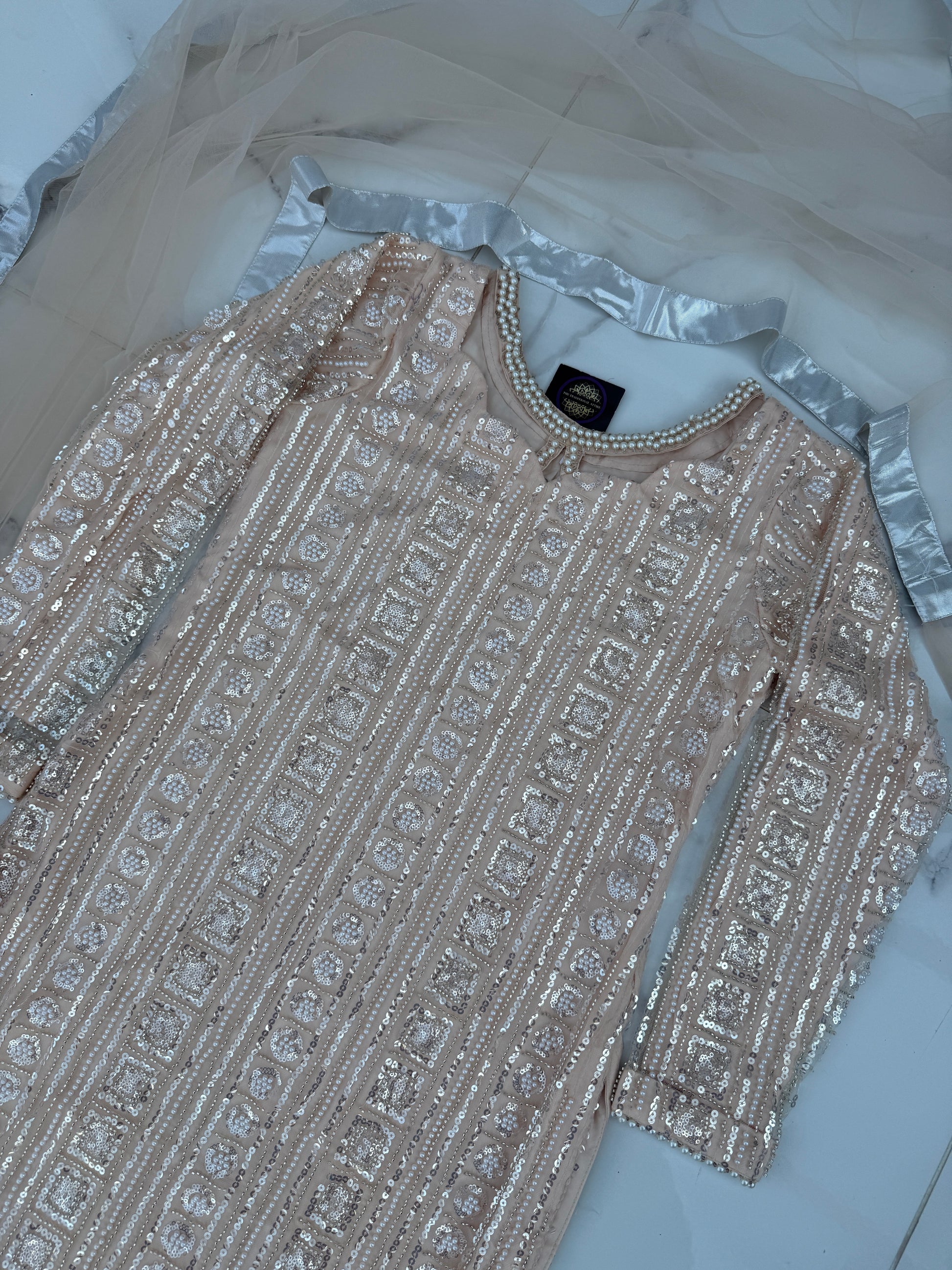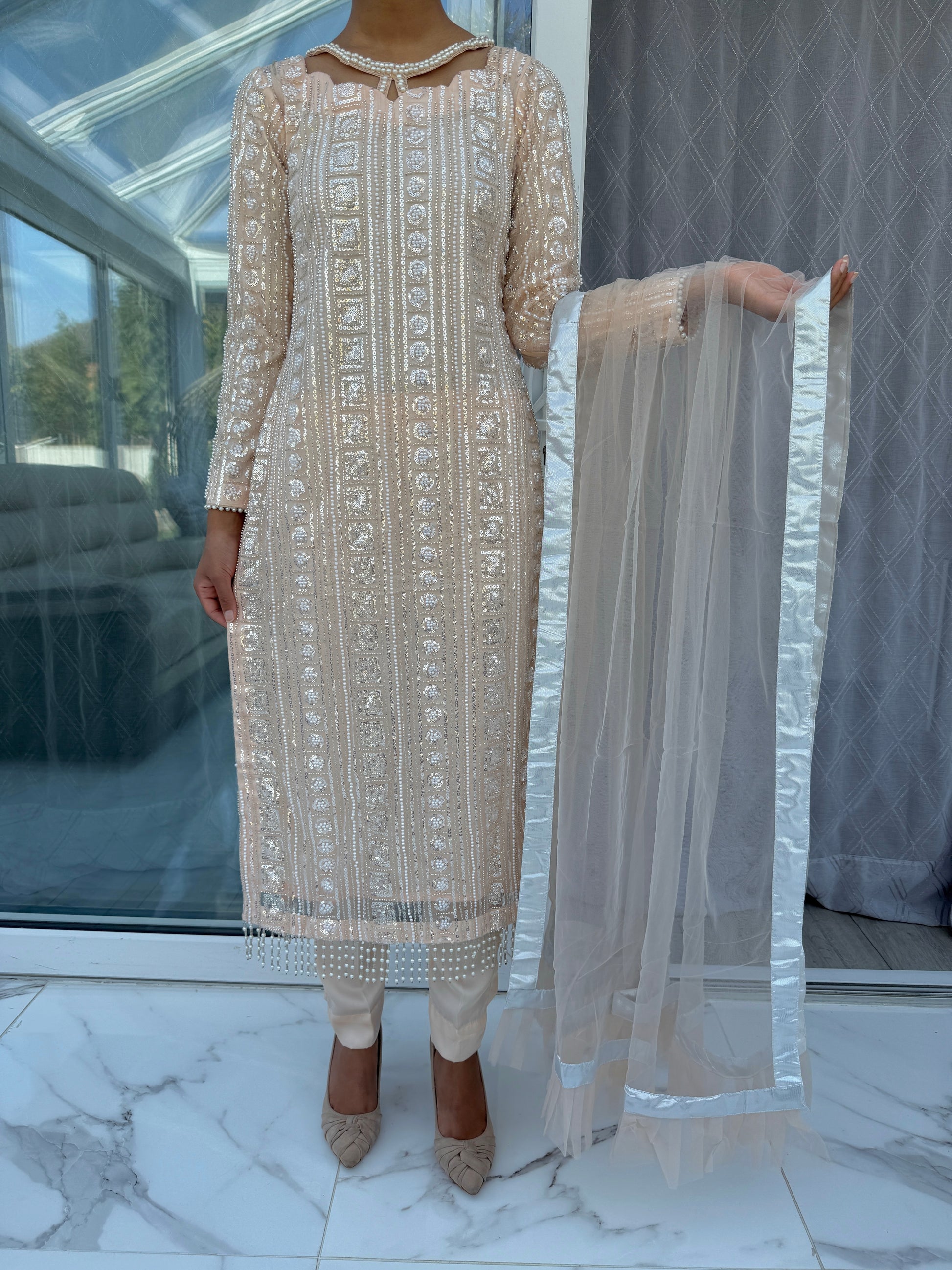 • Intricately embroidered net kameez with a cutwork neckline, pearls, sequins and beads