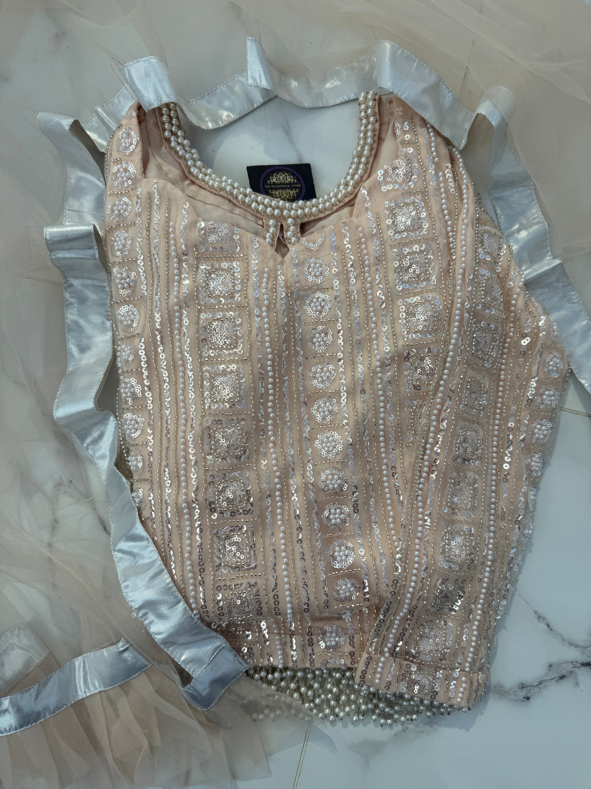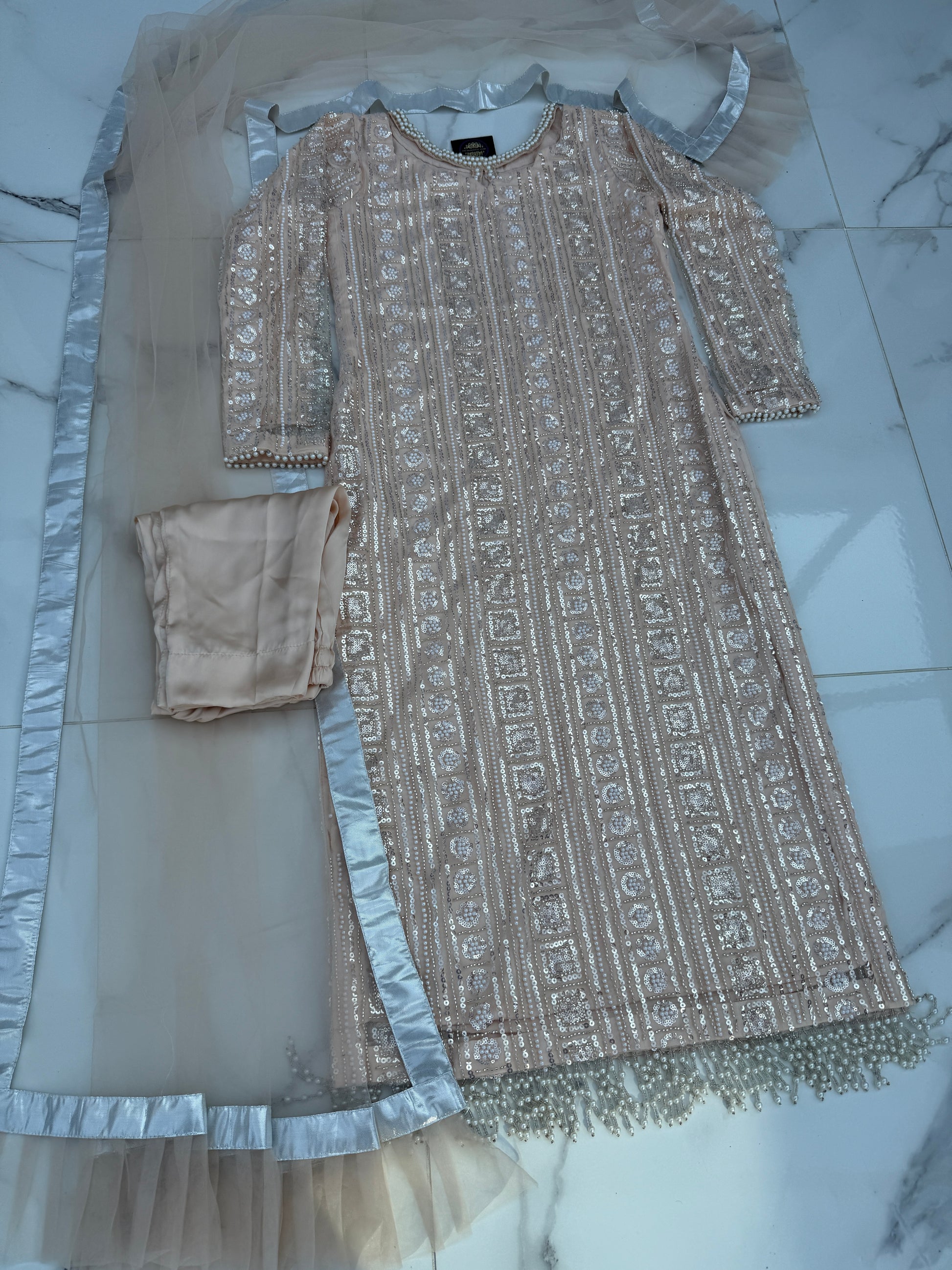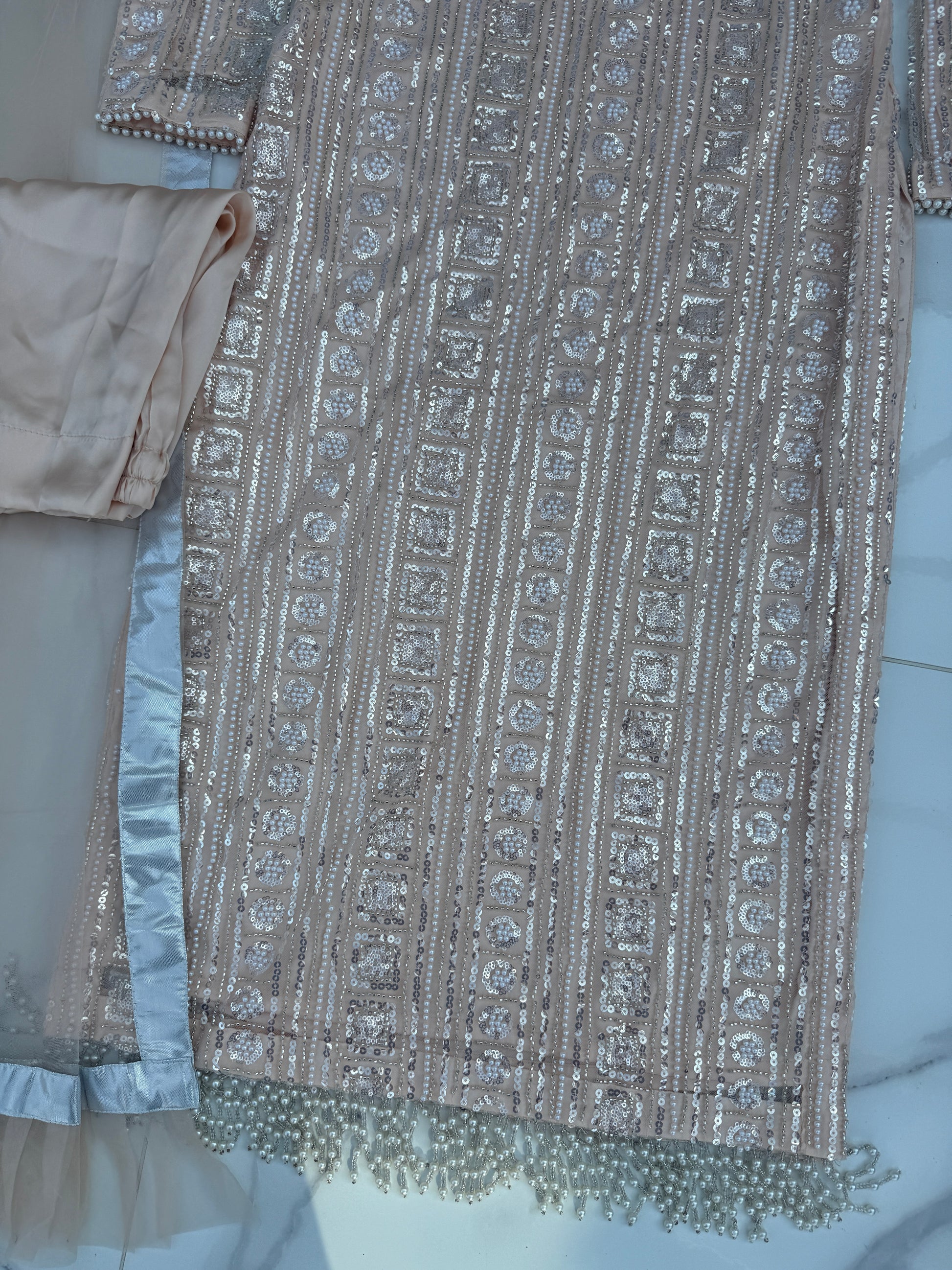 • Intricately embroidered net kameez with a cutwork neckline, pearls, sequins and beads
