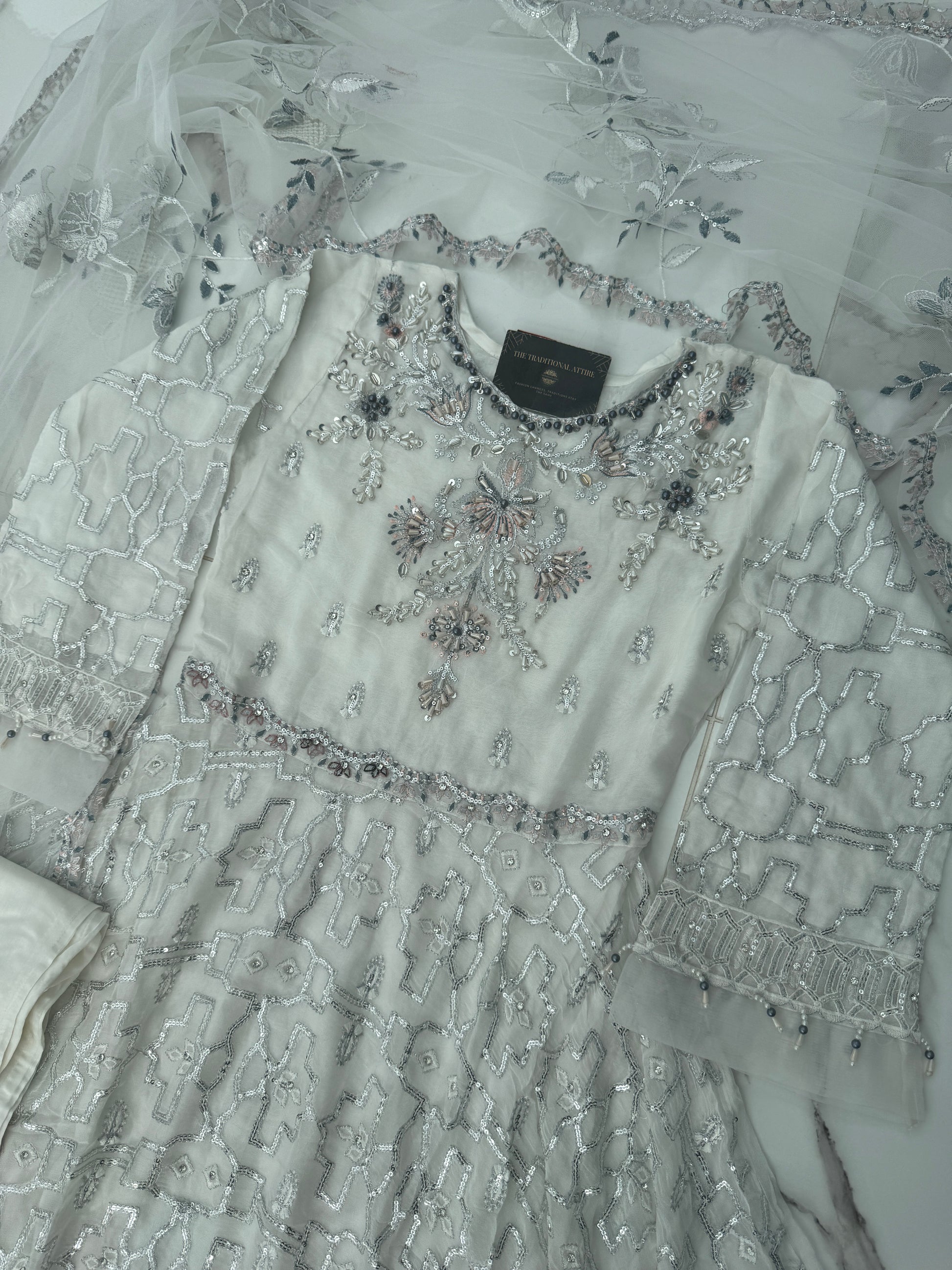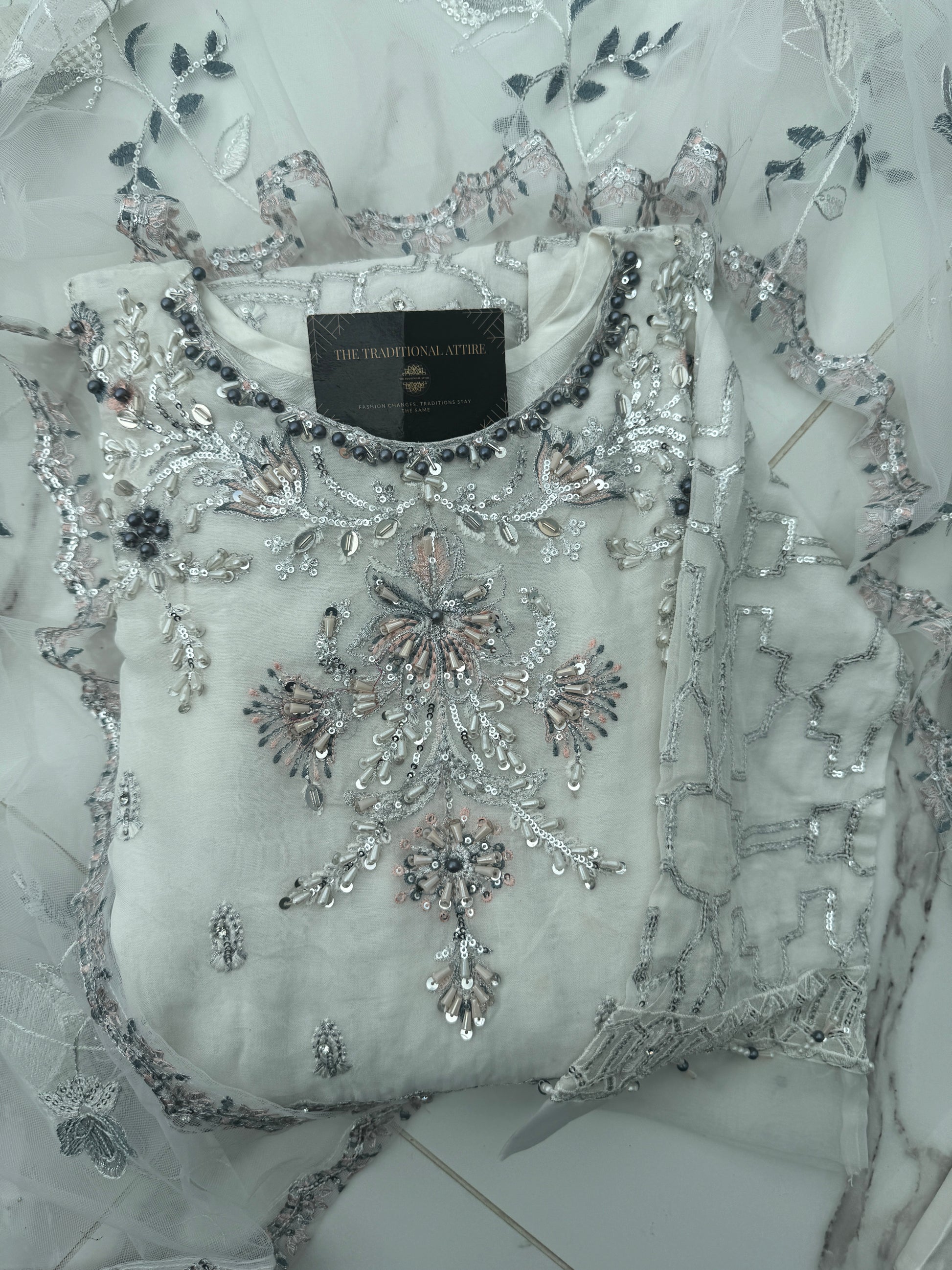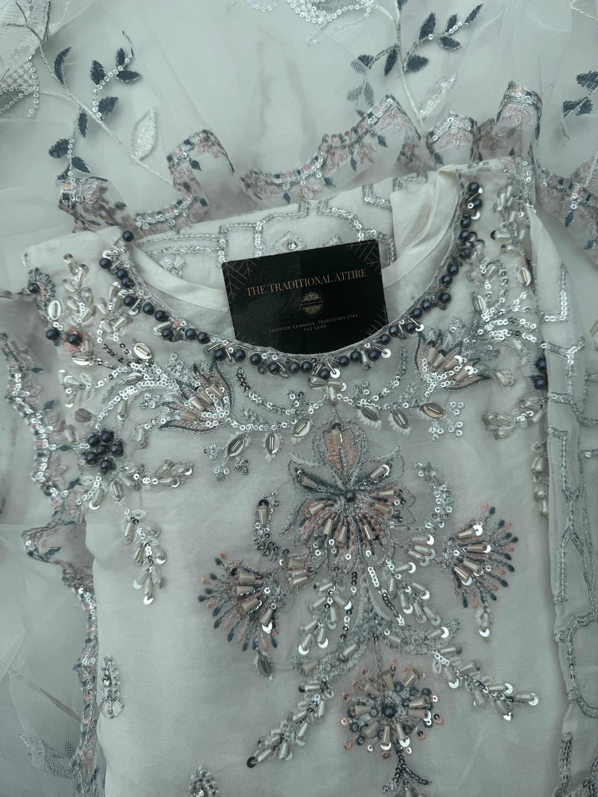 • Front and back embroidered chiffon dress with handwork and pearl embellishments