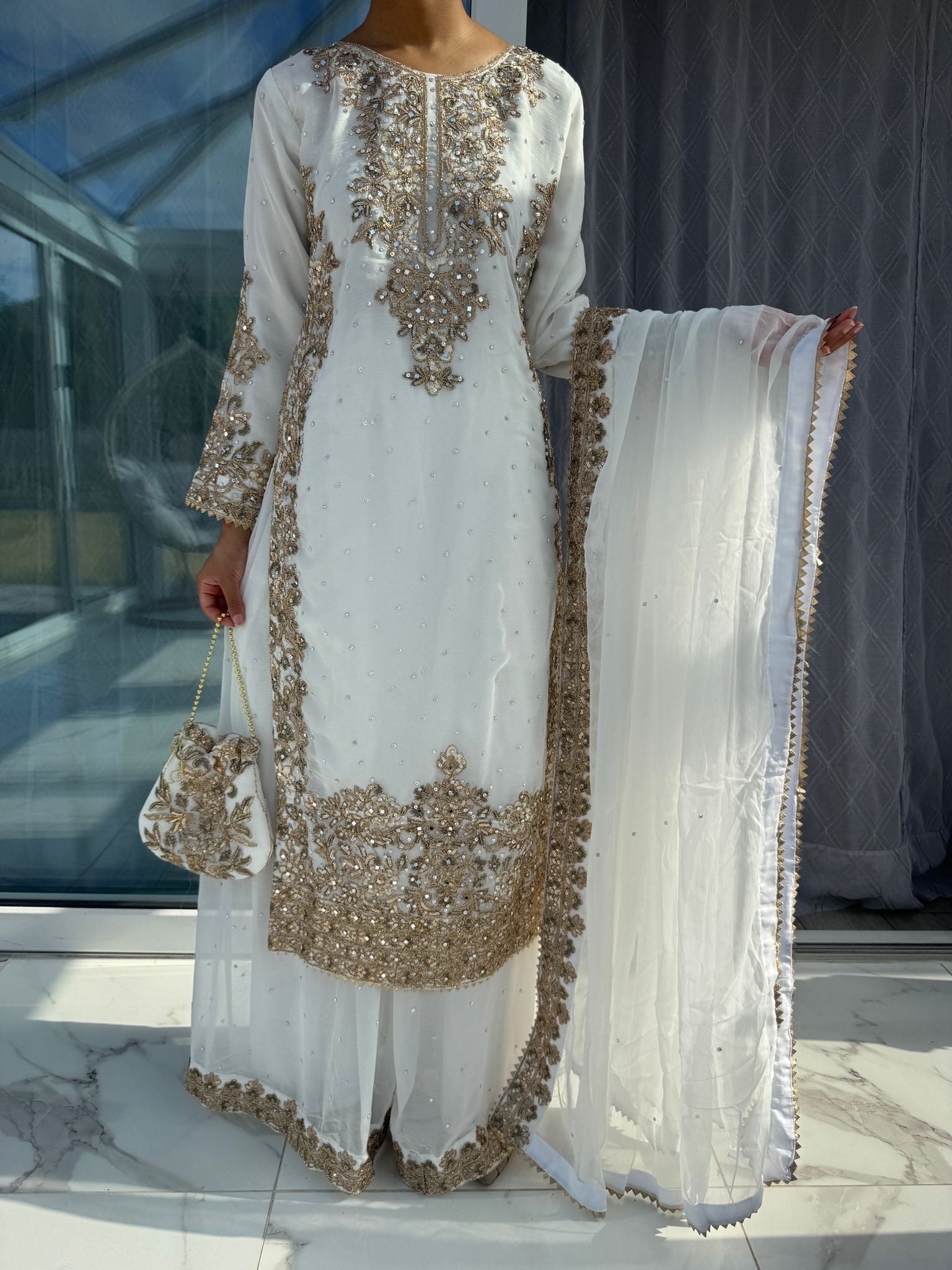 • Intricately embroidered chiffon kameez with sequins, mirrors and gems