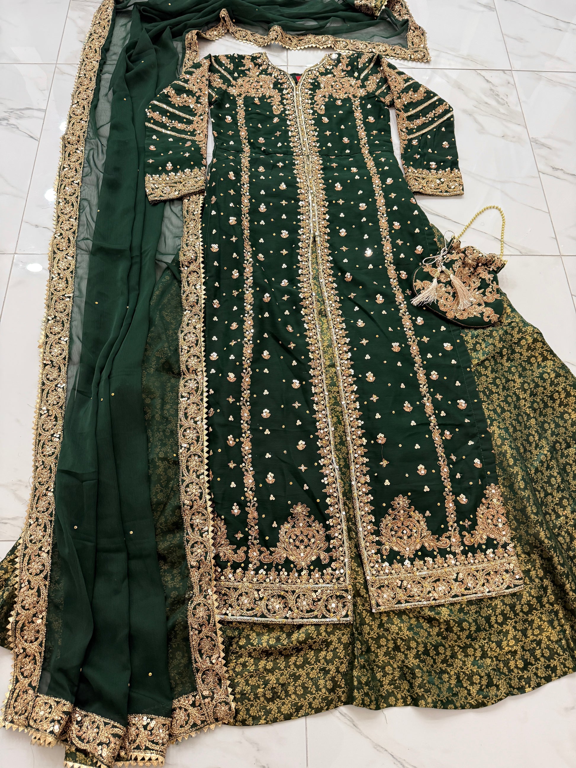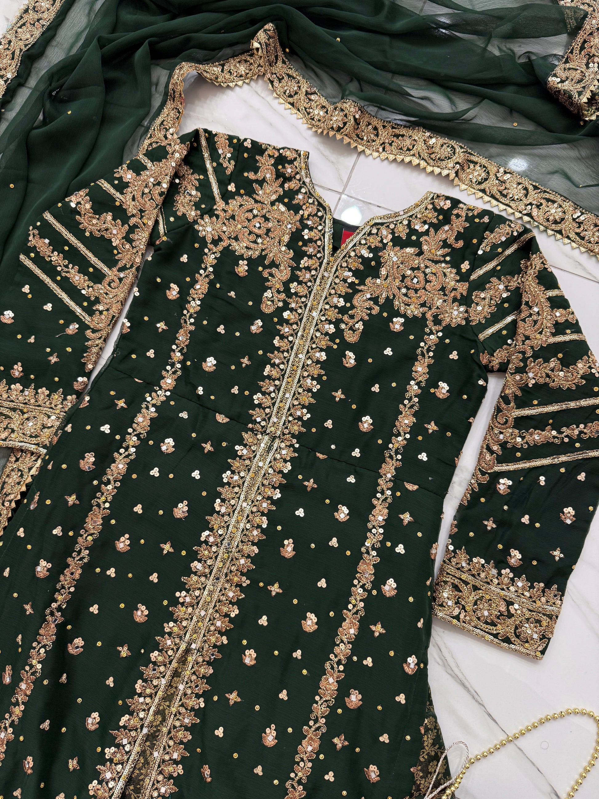 • Intricately front and back embroidered chiffon kameez with sequins and gems
