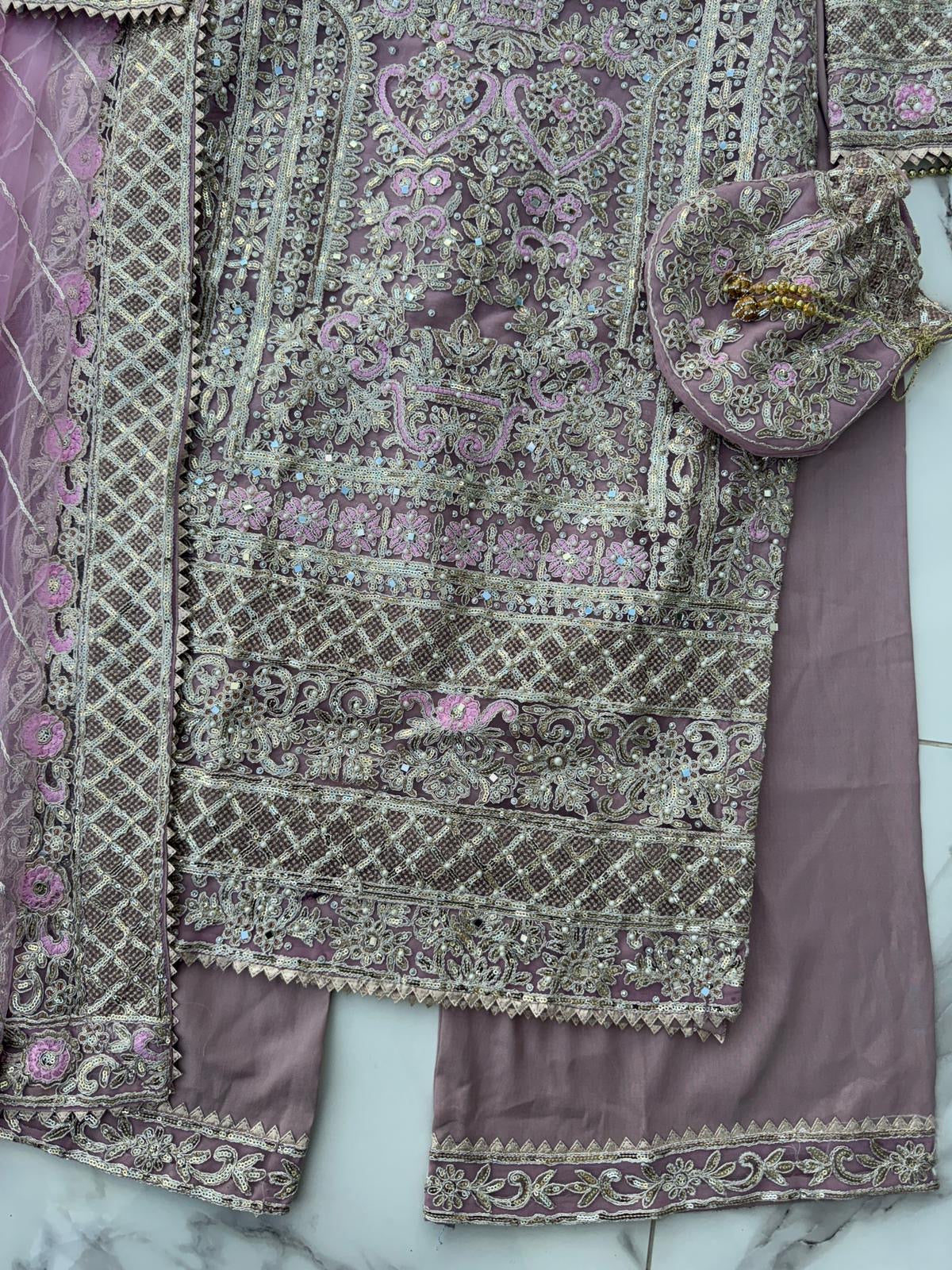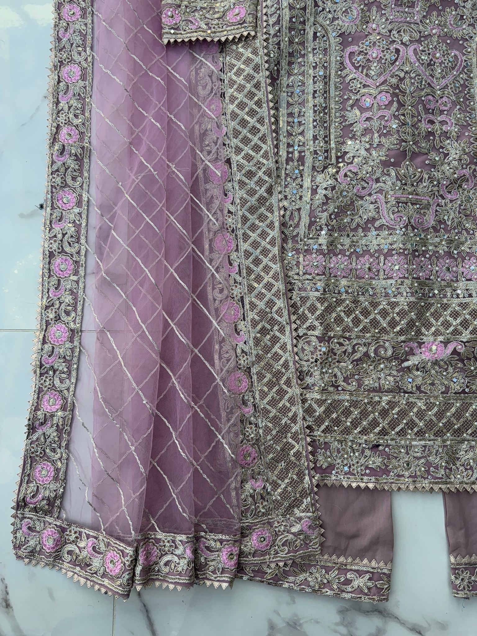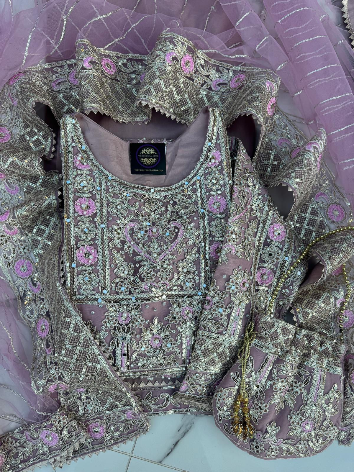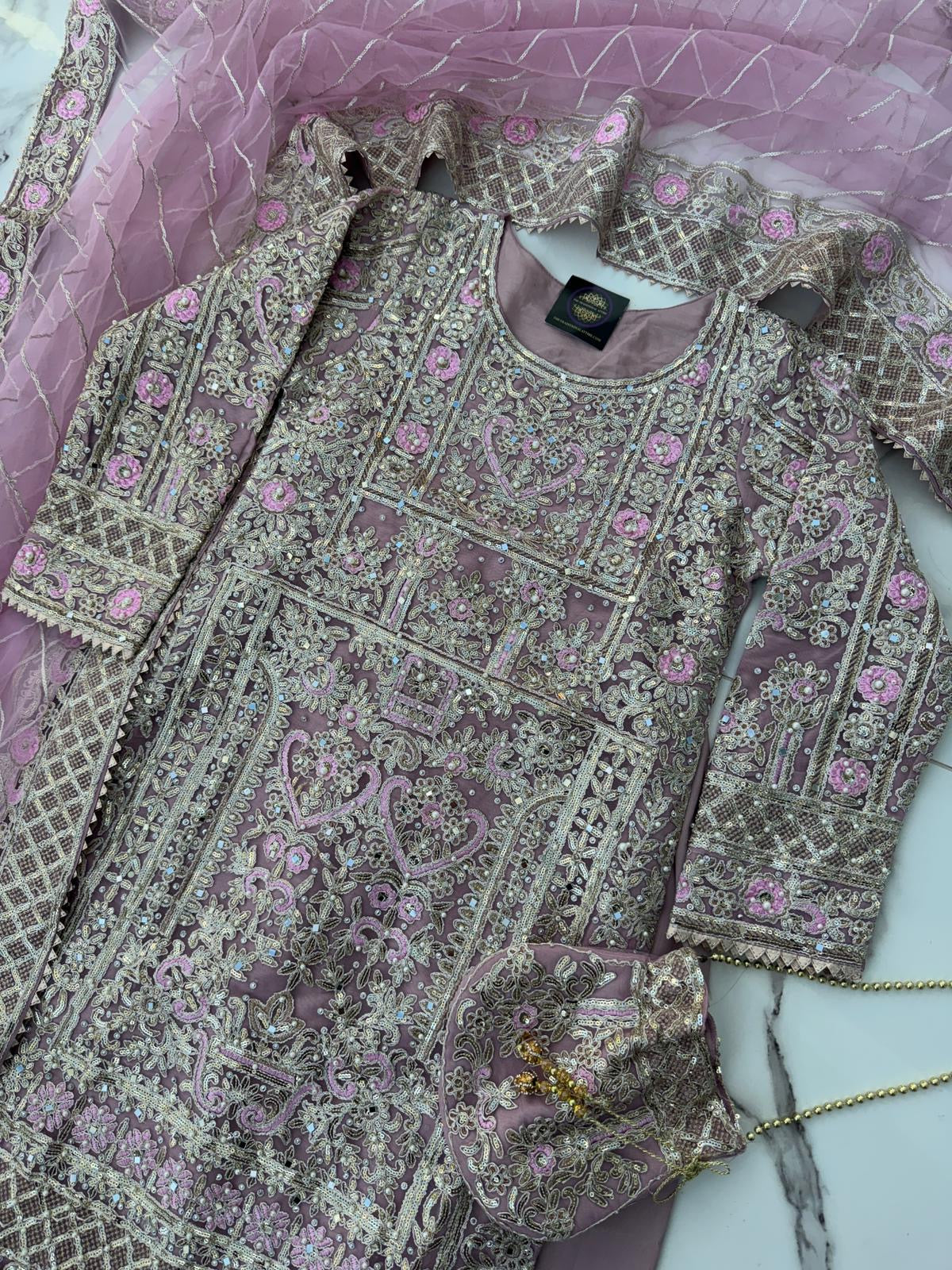 • Intricately embroidered net kameez with pearls, mirrors and gems