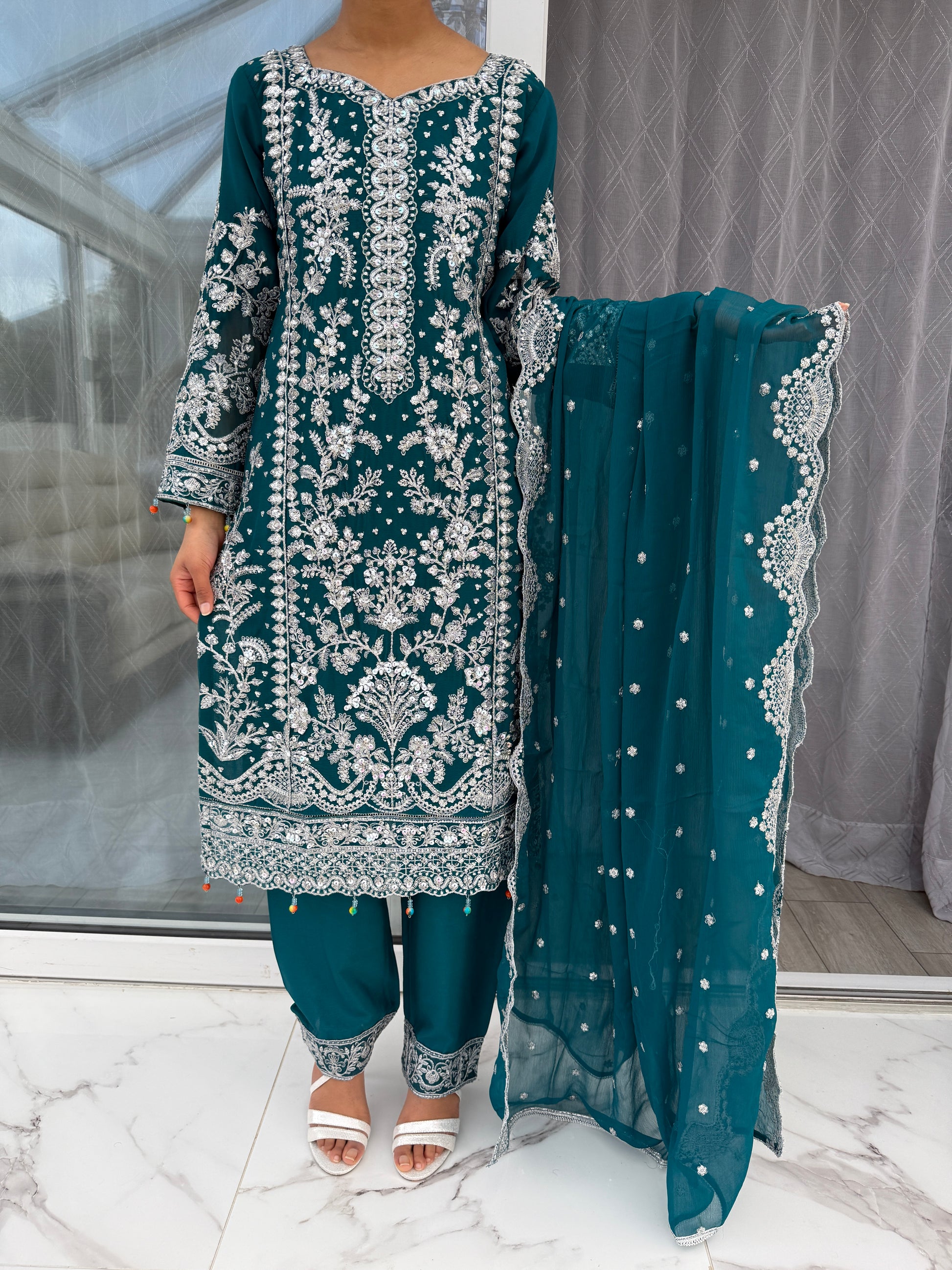 • Fully Zari Embroidered chiffon kameez with sequins, handwork and tassels