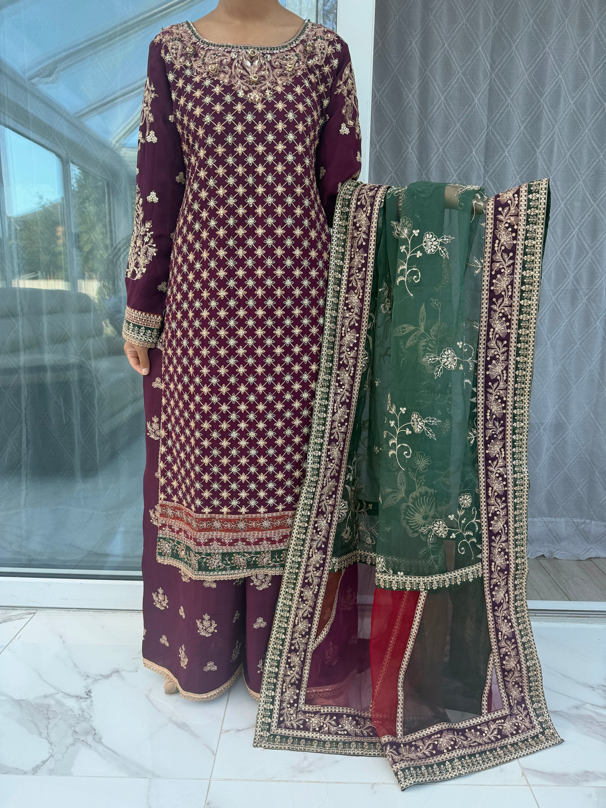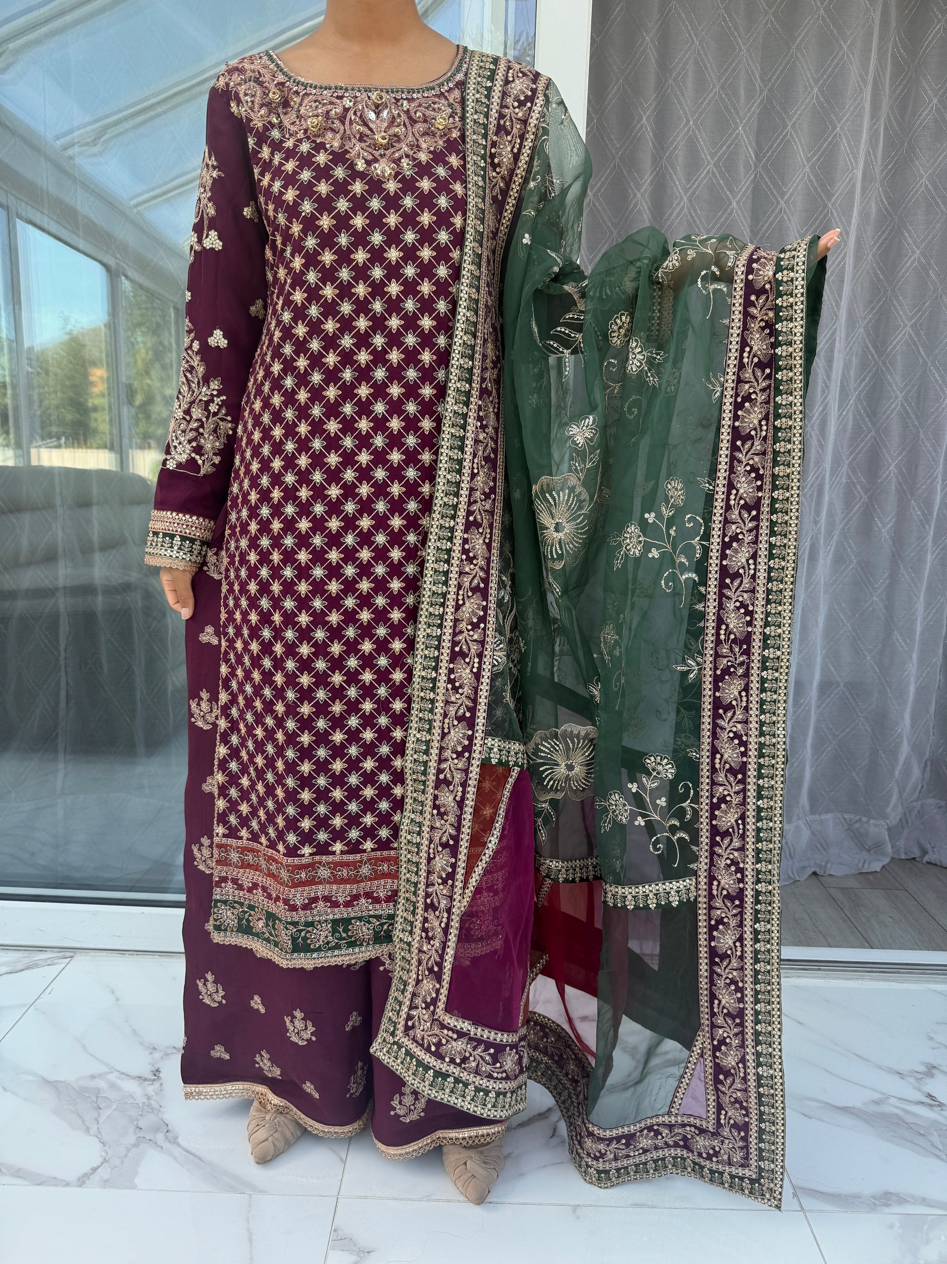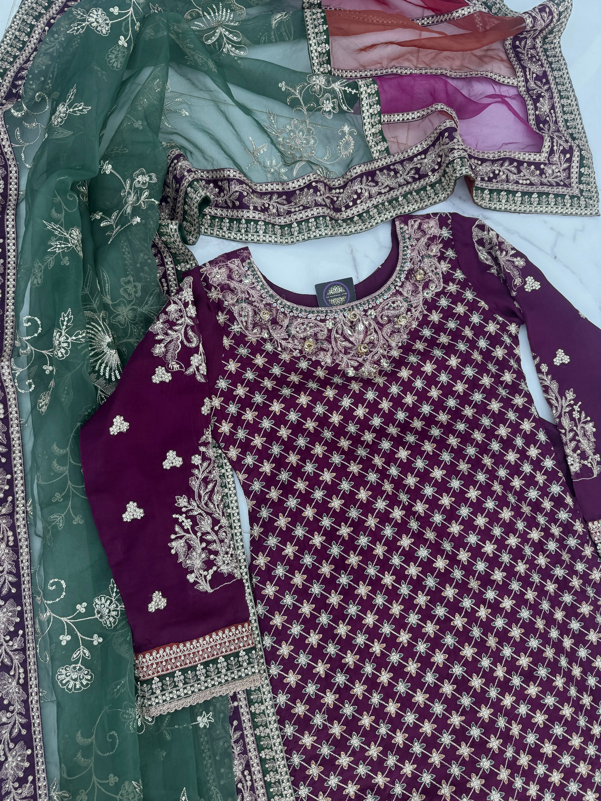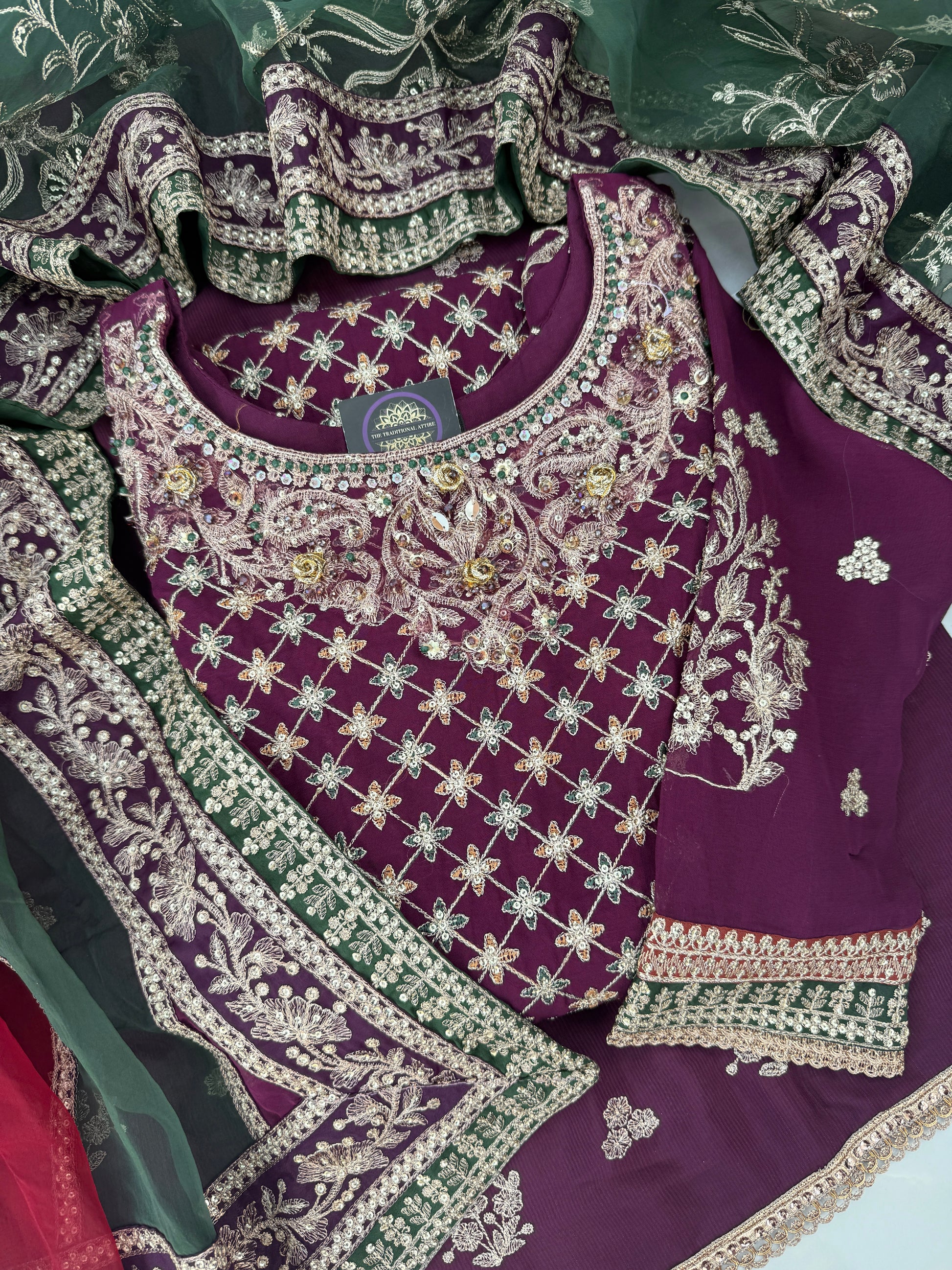 • Front and back Intricately embroidered chiffon kameez with handwork and sequins