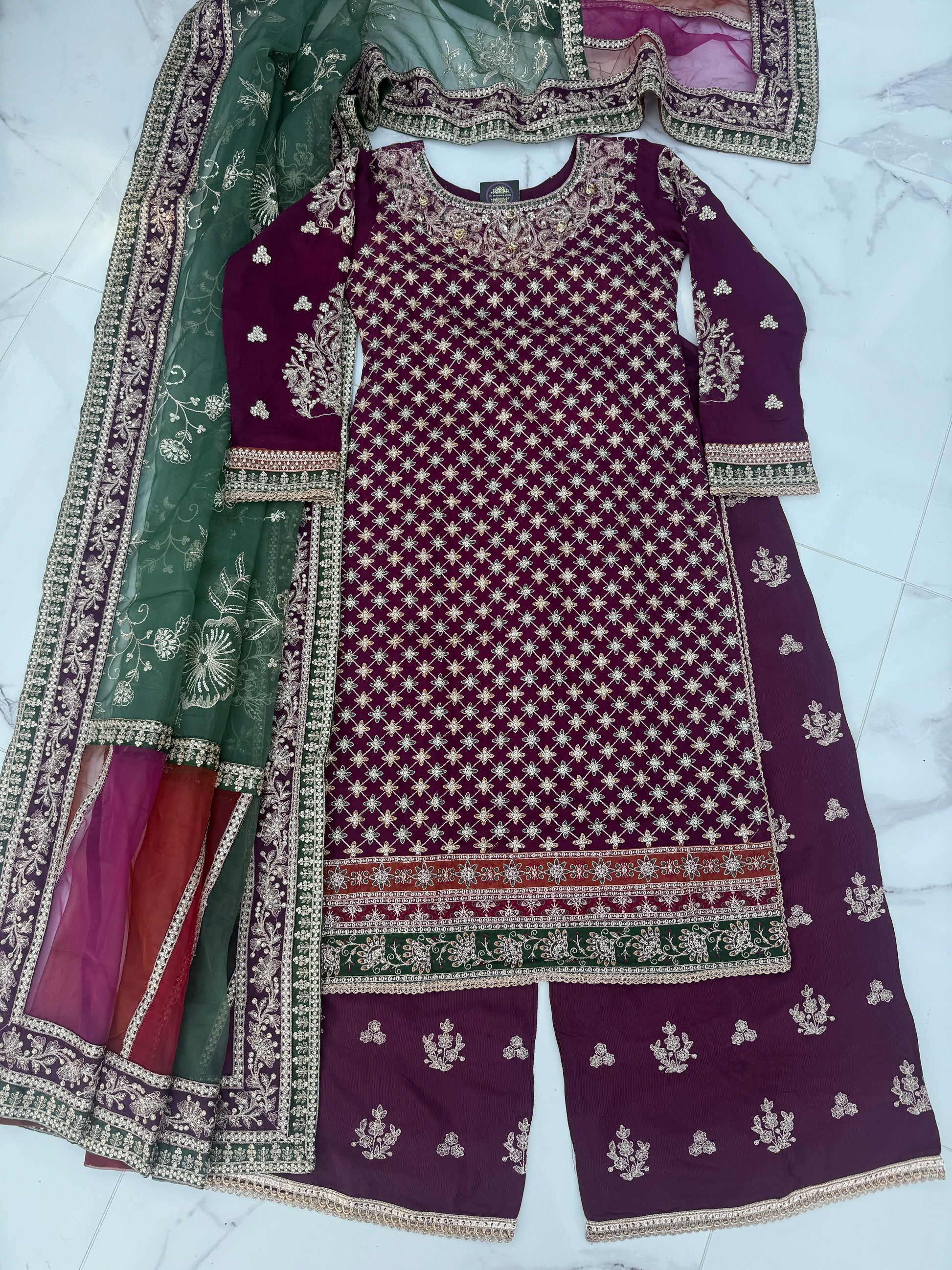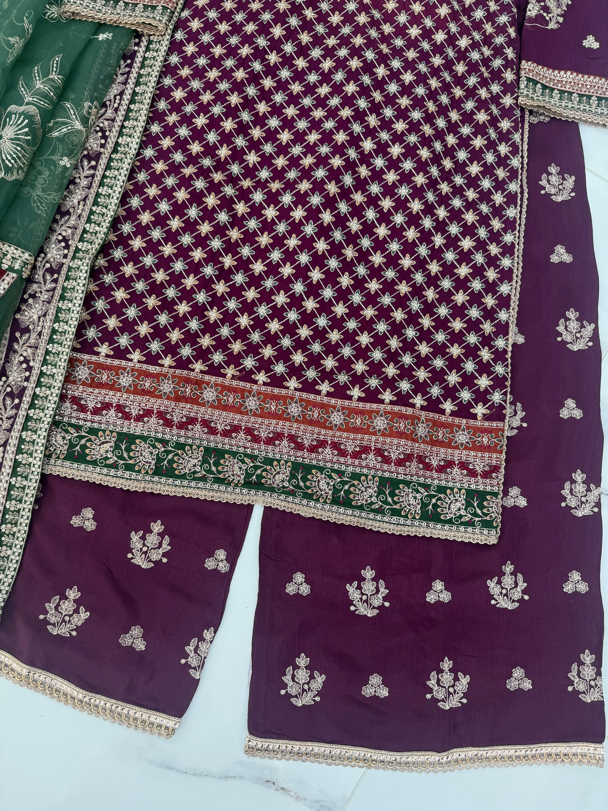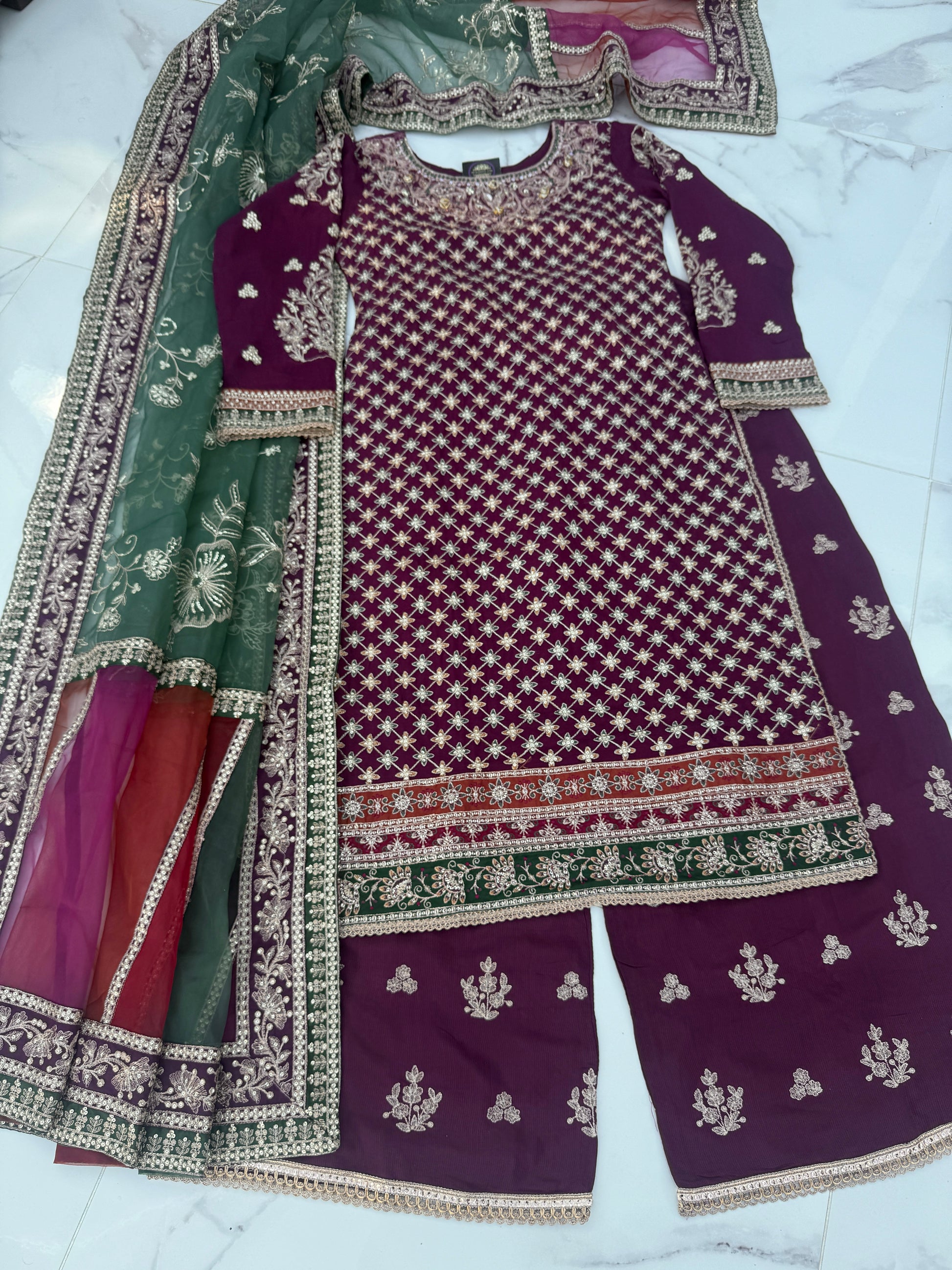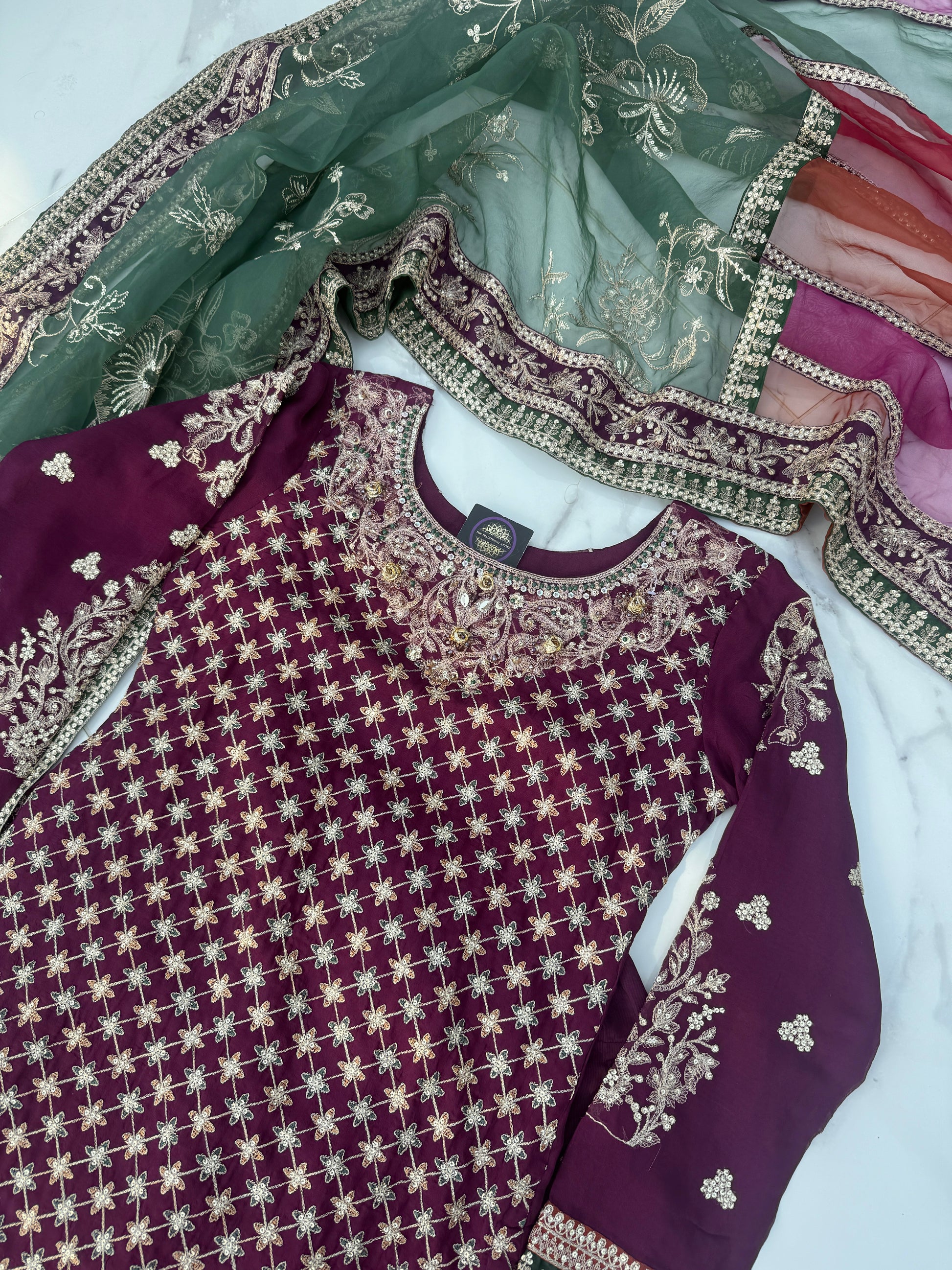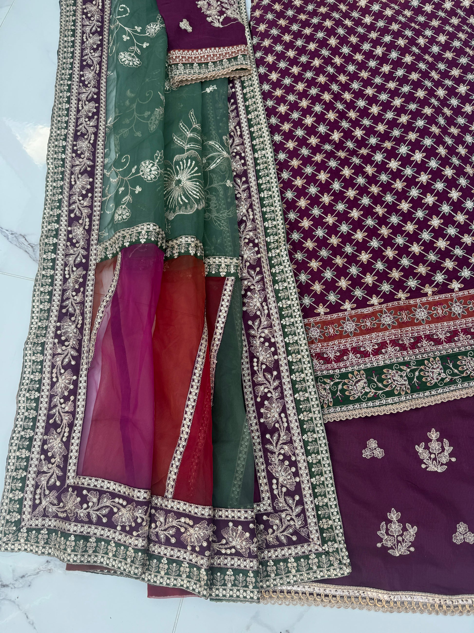 • Front and back Intricately embroidered chiffon kameez with handwork and sequins