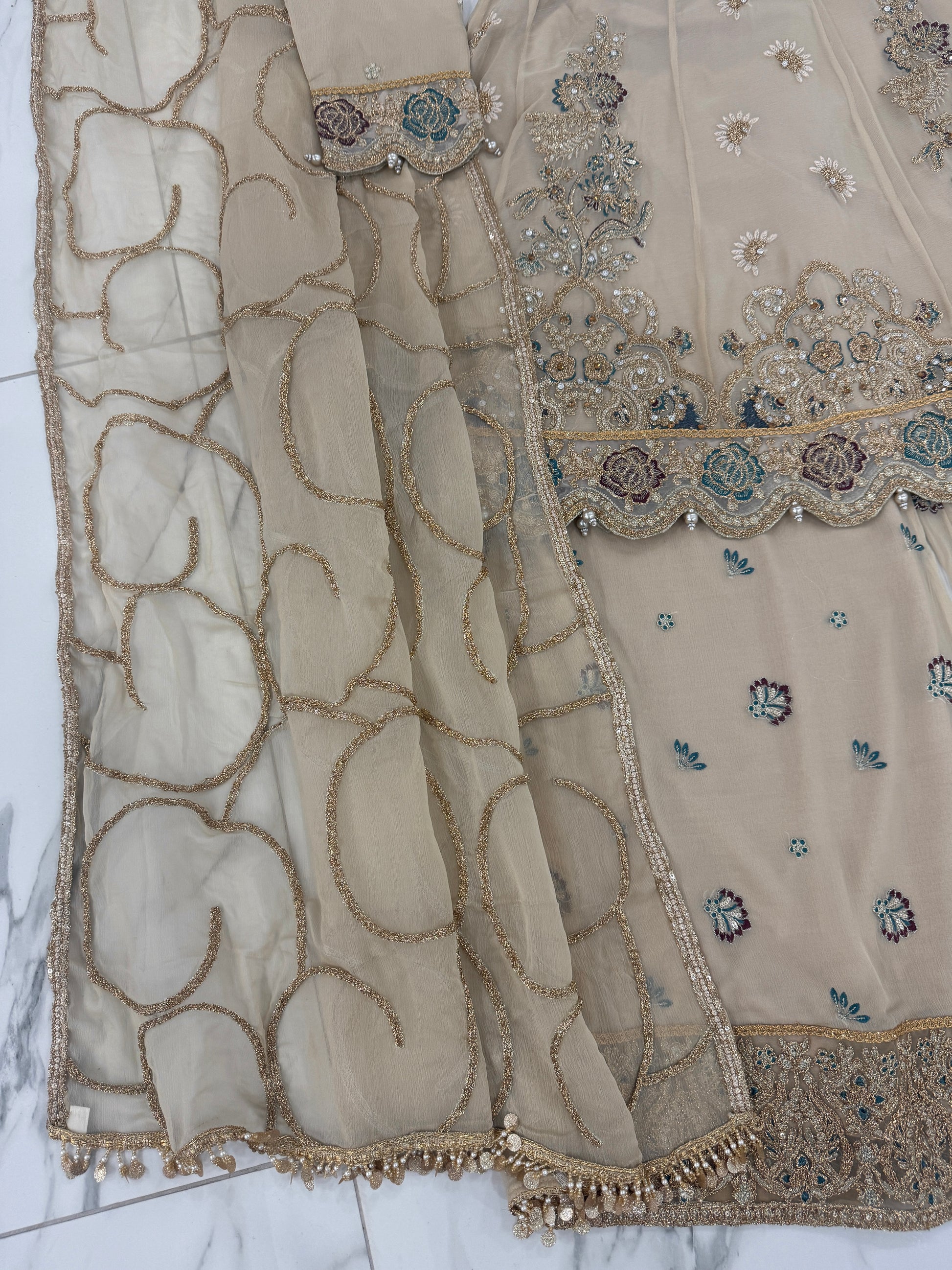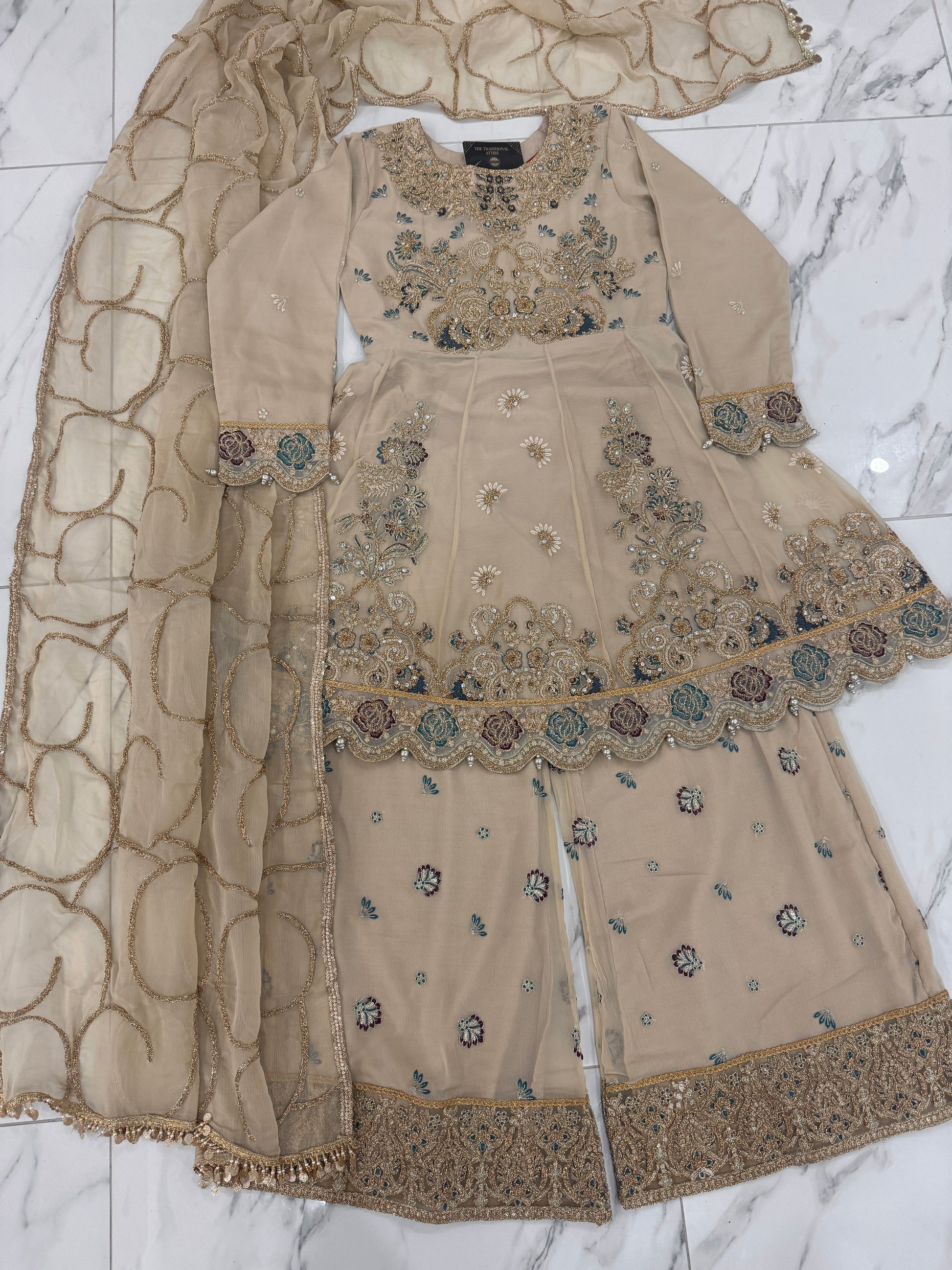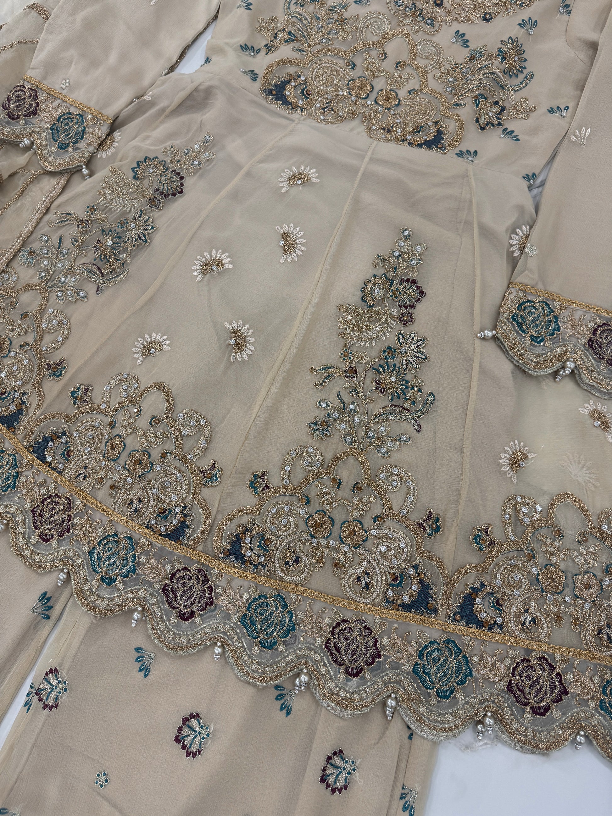 • Intricately embroidered chiffon peplum dress with stonework and embellishments