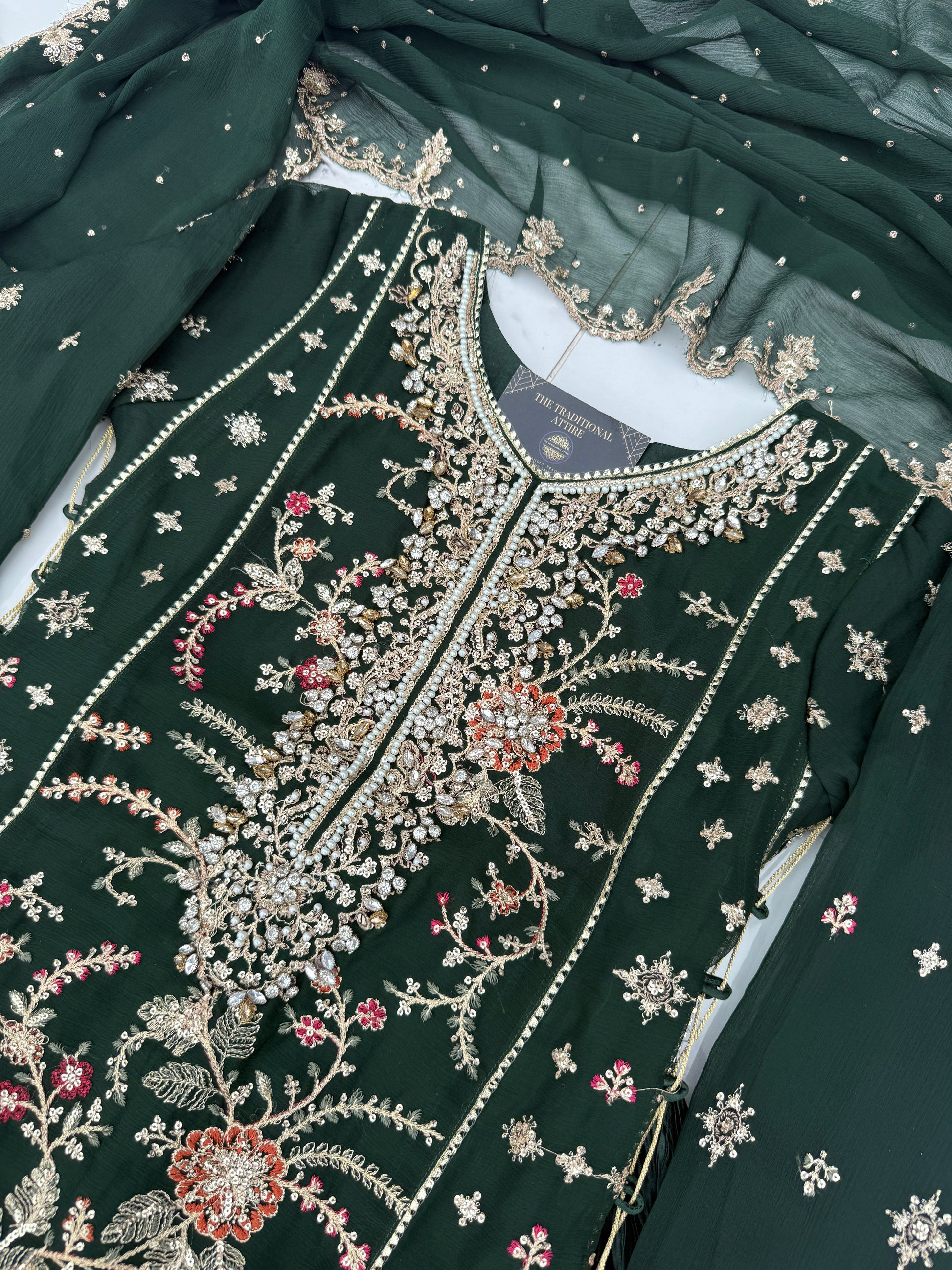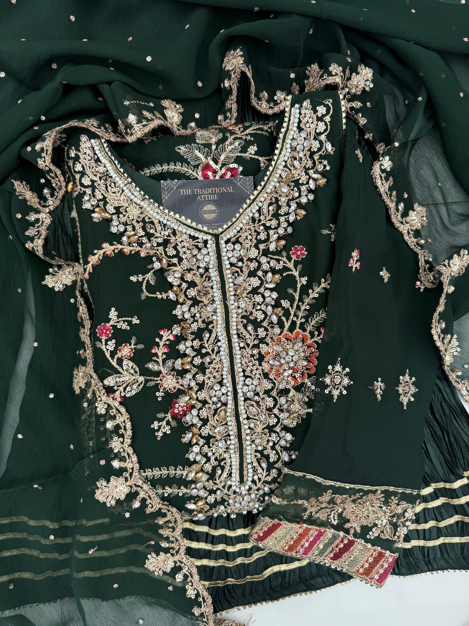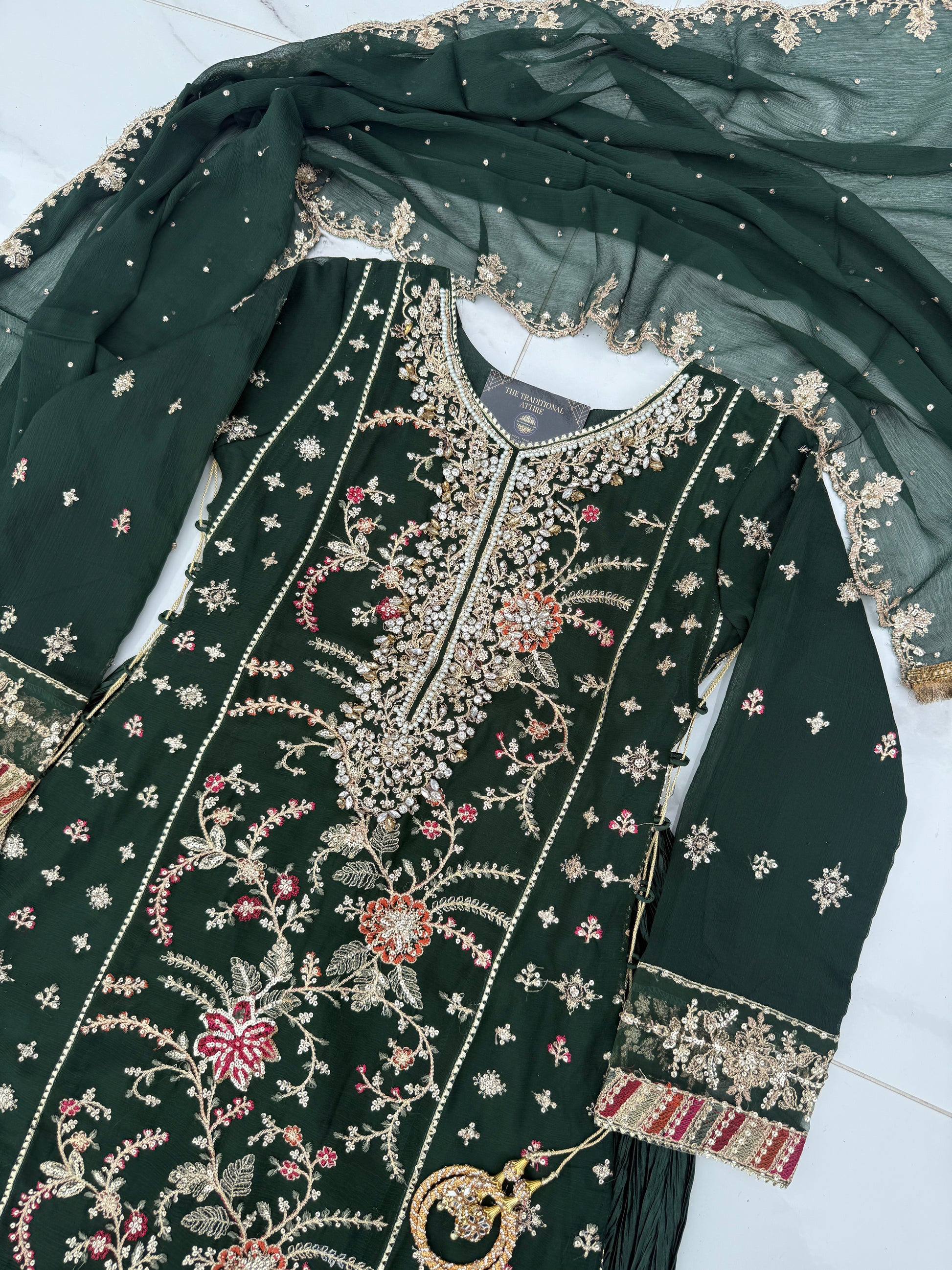 • Front and back intricately embroidered chiffon kameez with sequins,tassels, handwork and pearl detailing