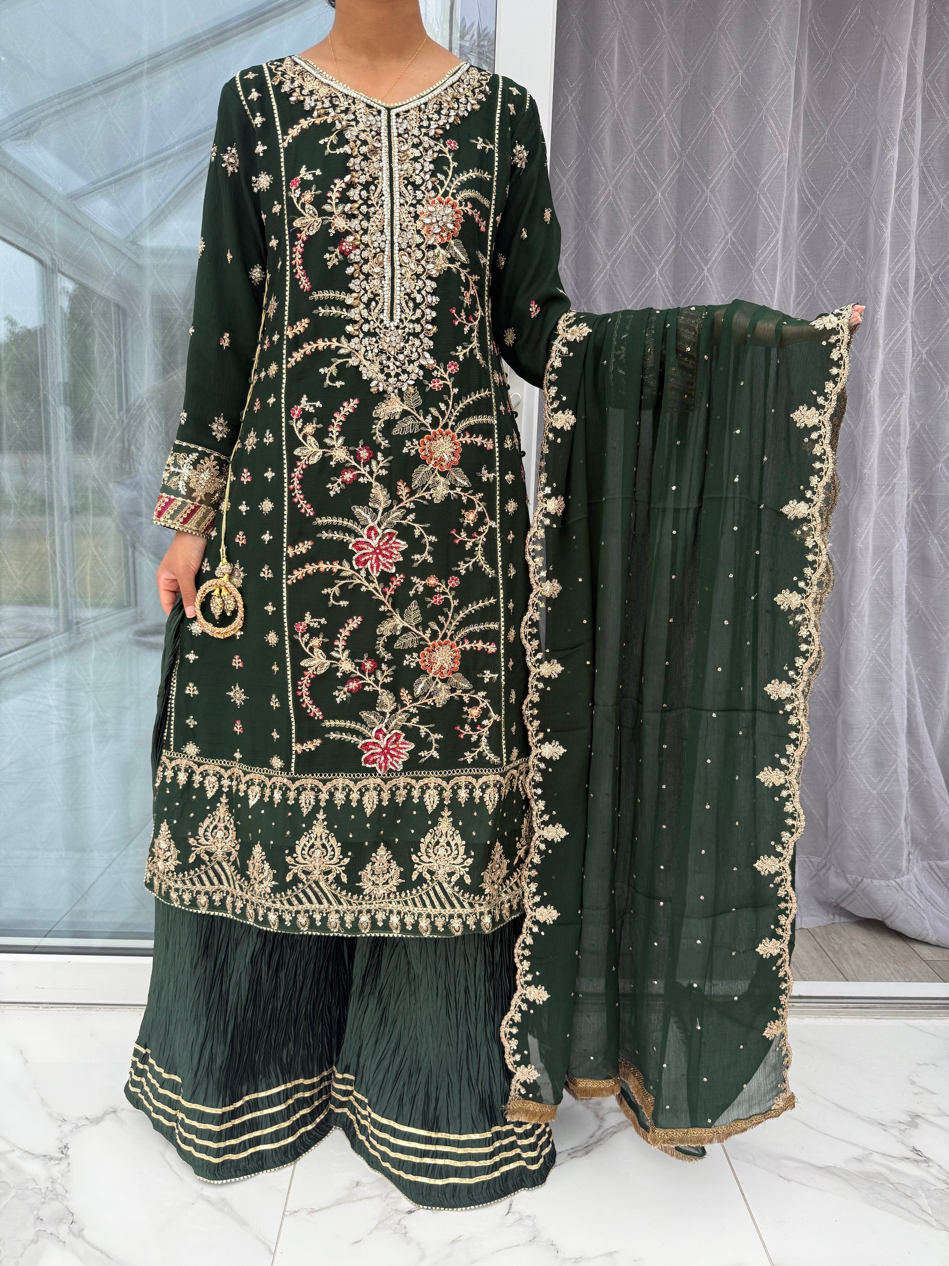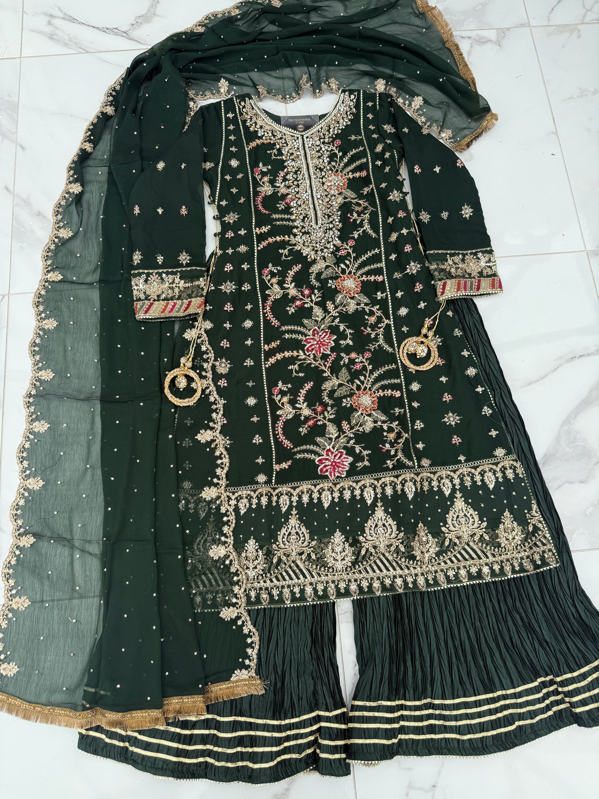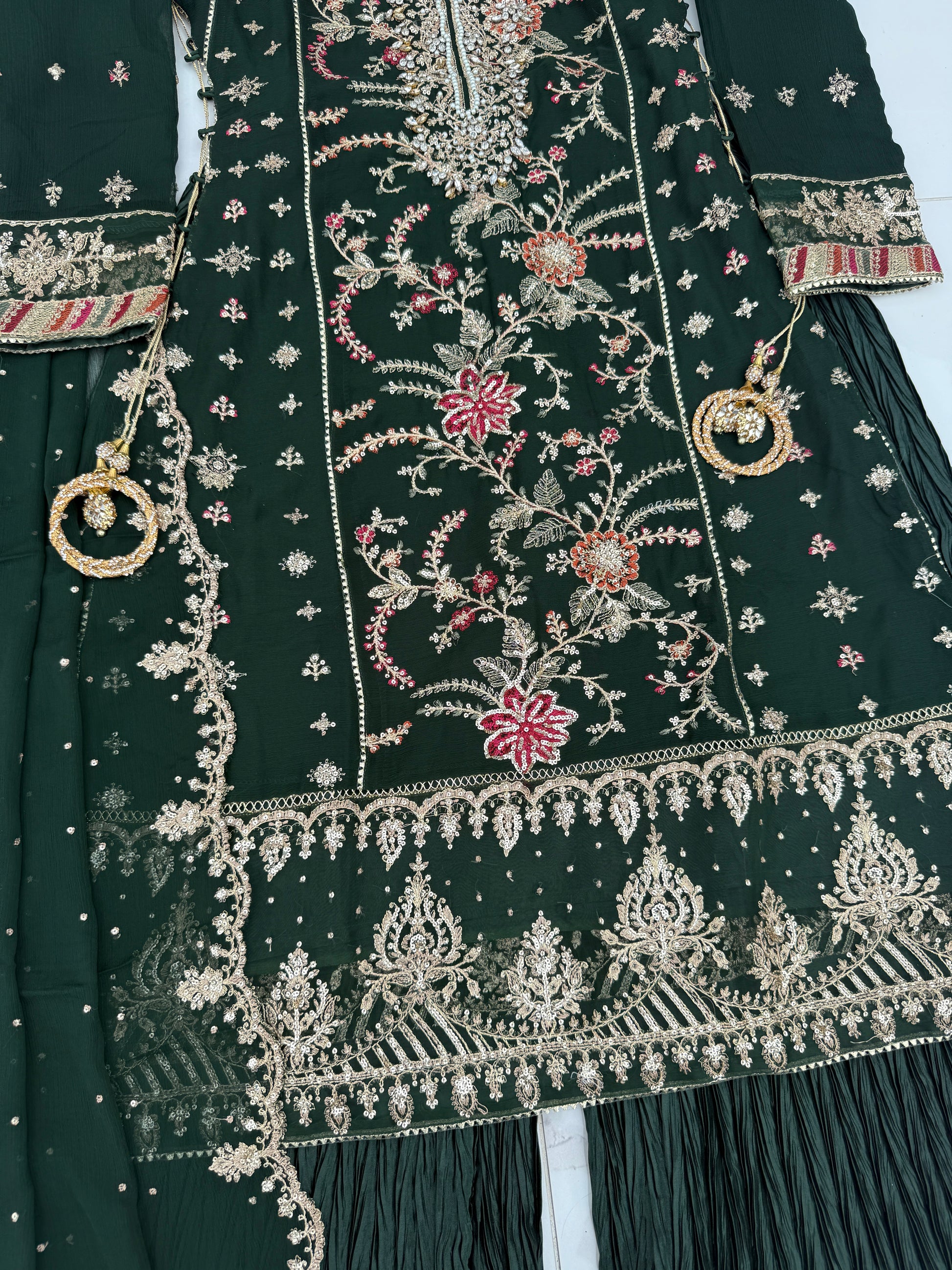 • Front and back intricately embroidered chiffon kameez with sequins,tassels, handwork and pearl detailing