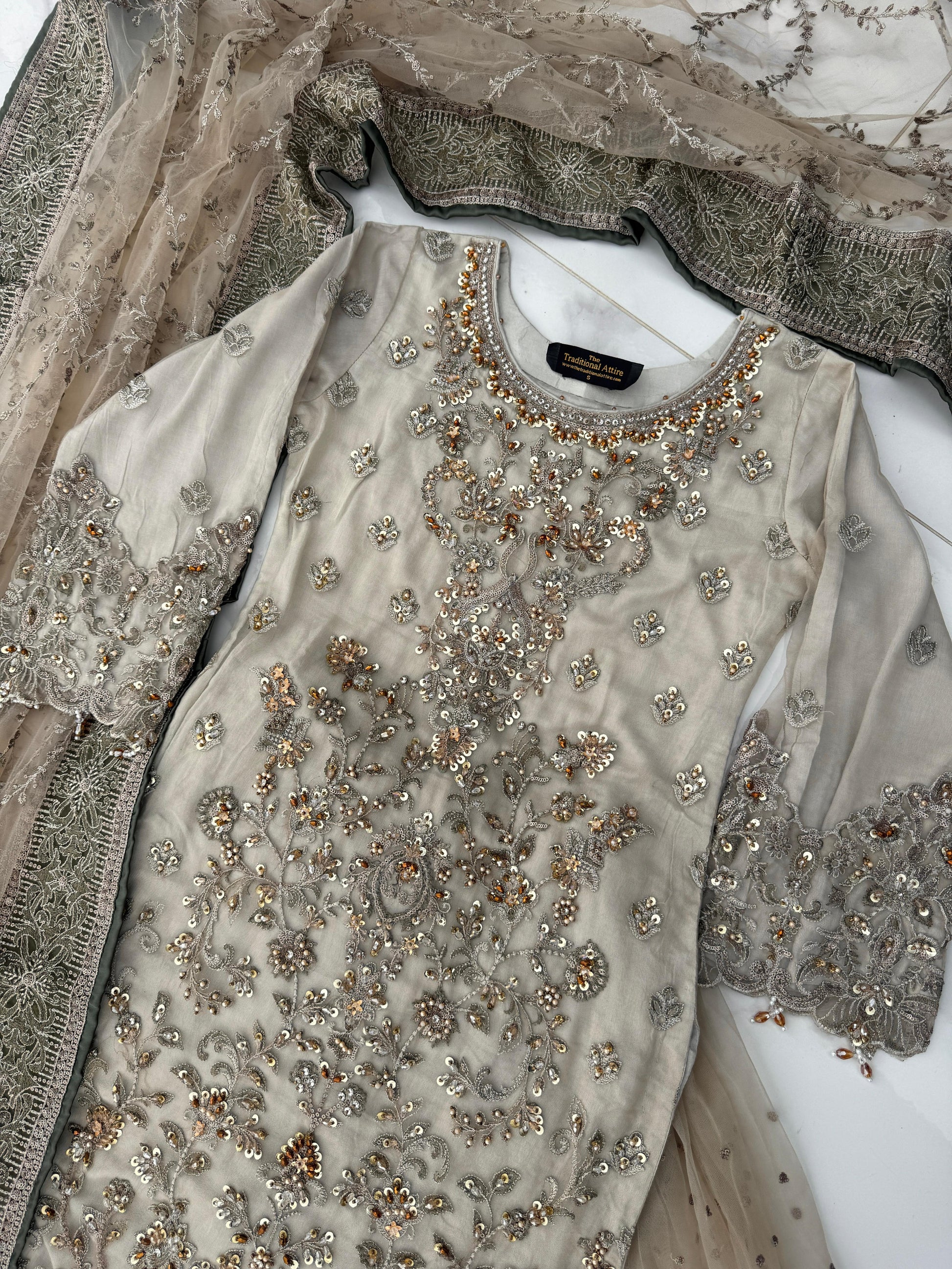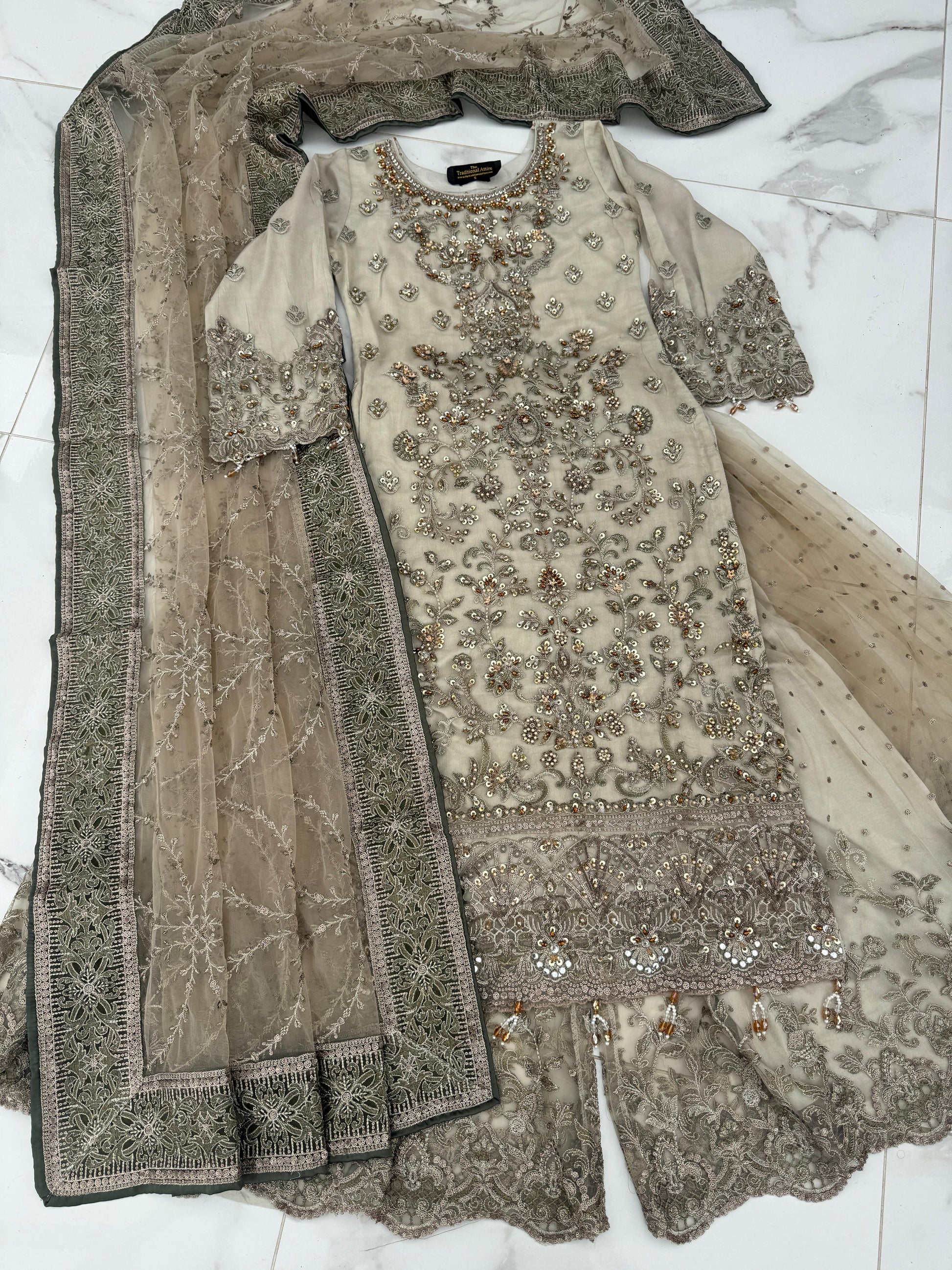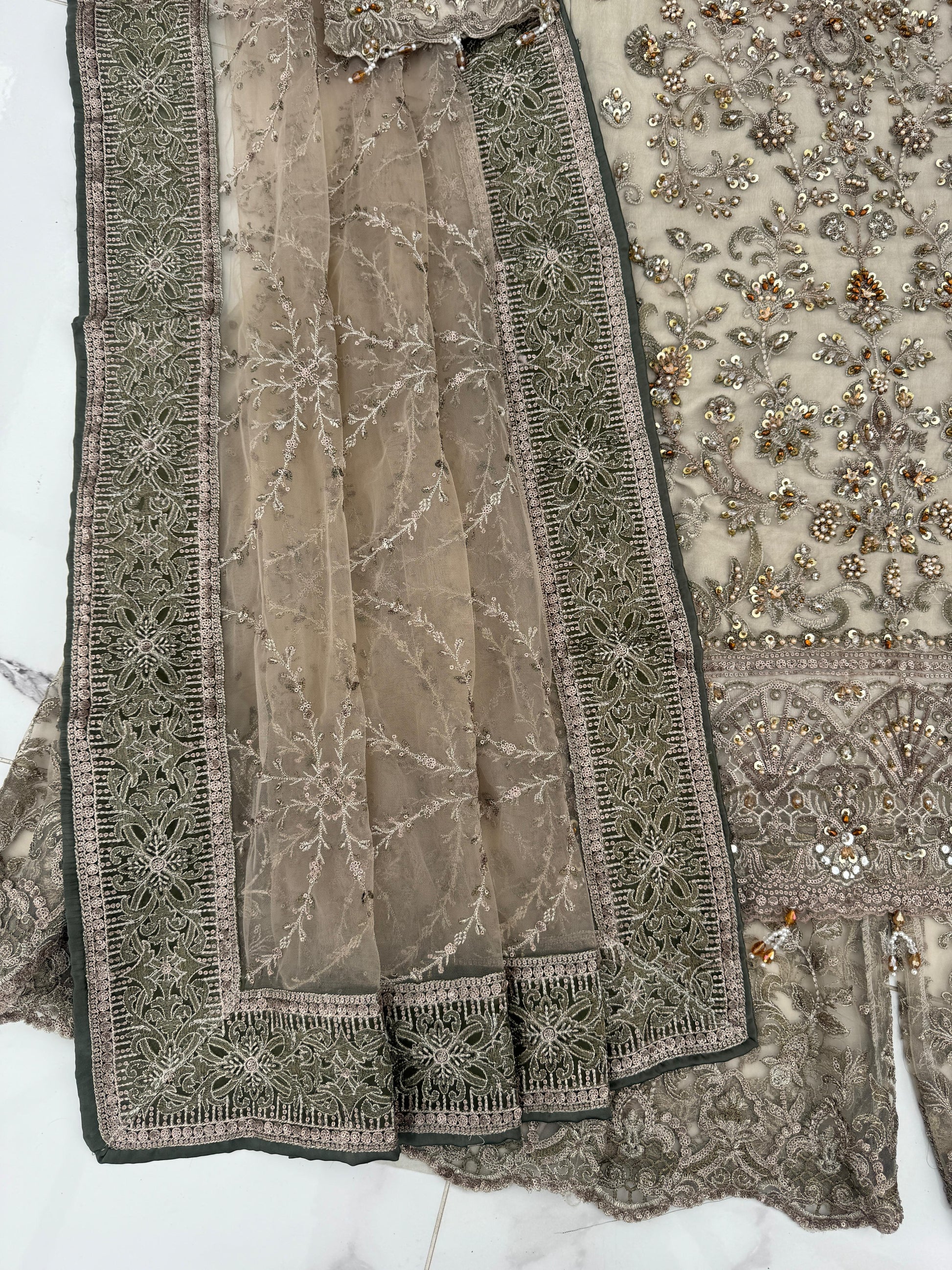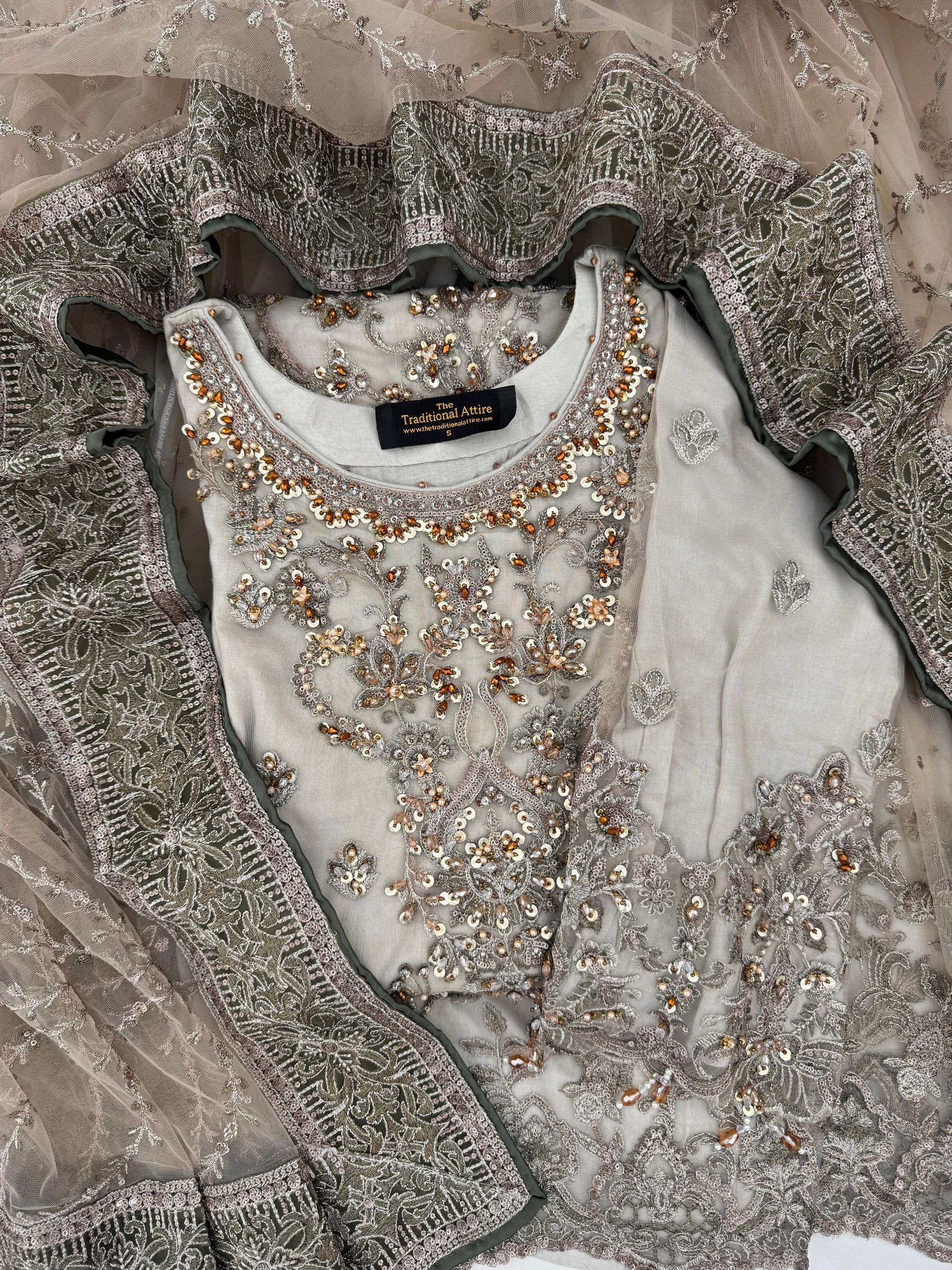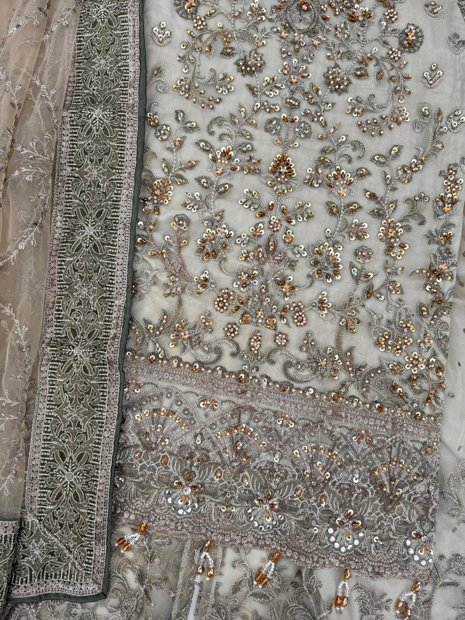 • Front and back intricately embroidered net kameez with pearls, handwork and embellishments