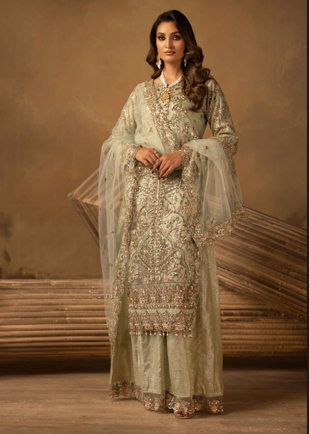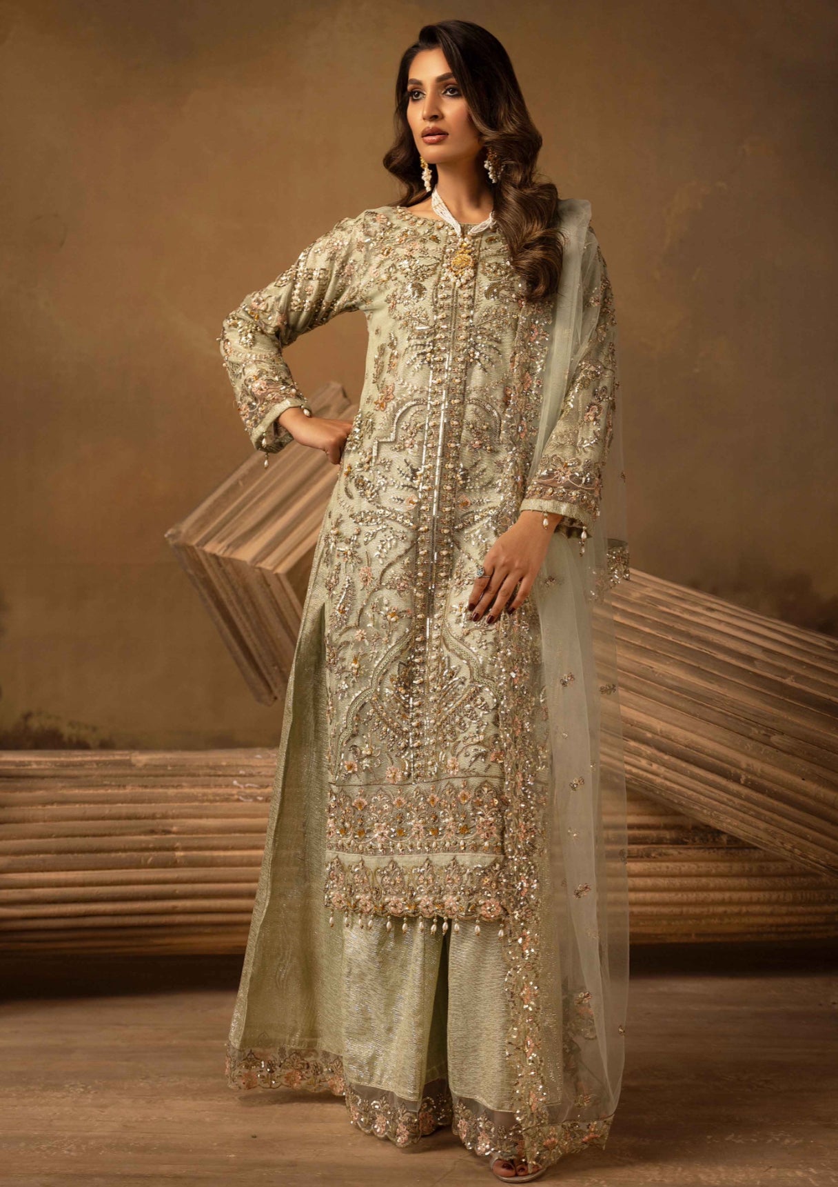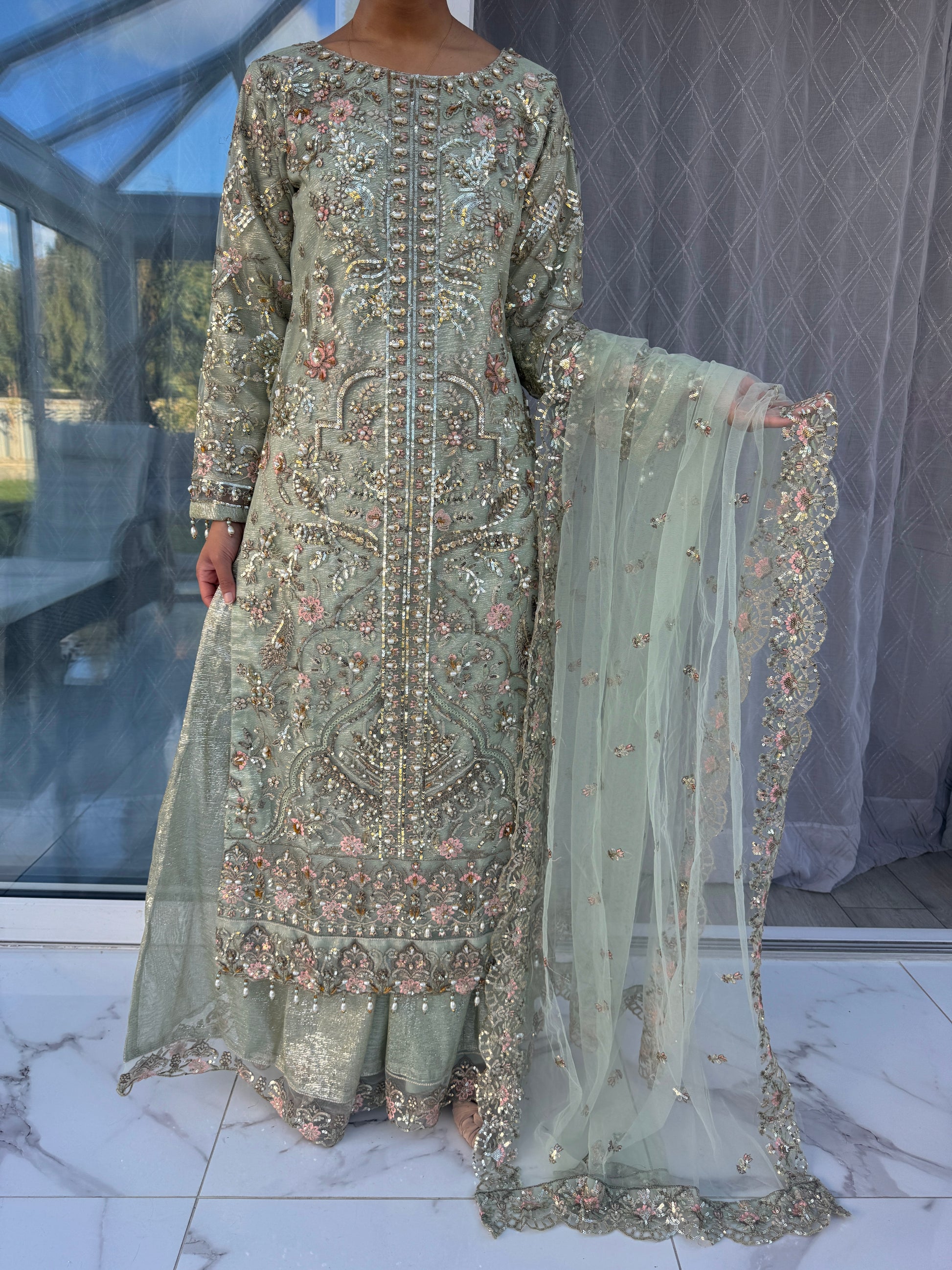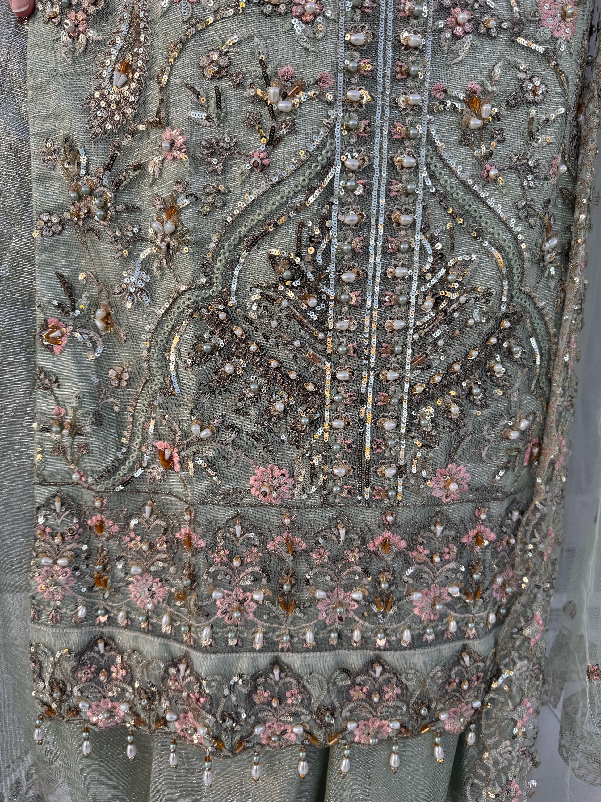 • Front and back intricately embroidered masoori net kameez with pearl hand work embellishments and sequins