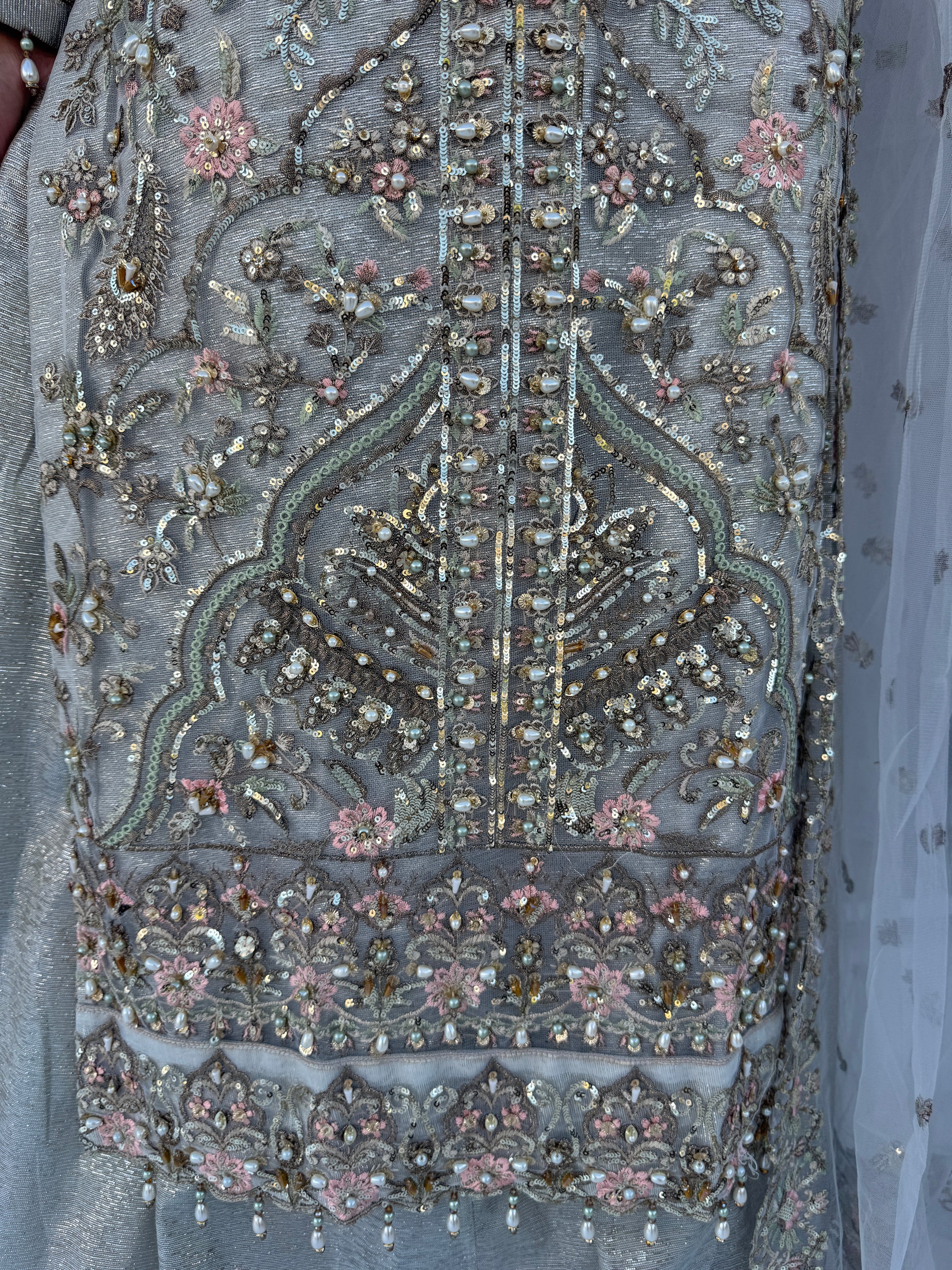• Front and back intricately embroidered masoori net kameez with pearl hand work embellishments and sequins