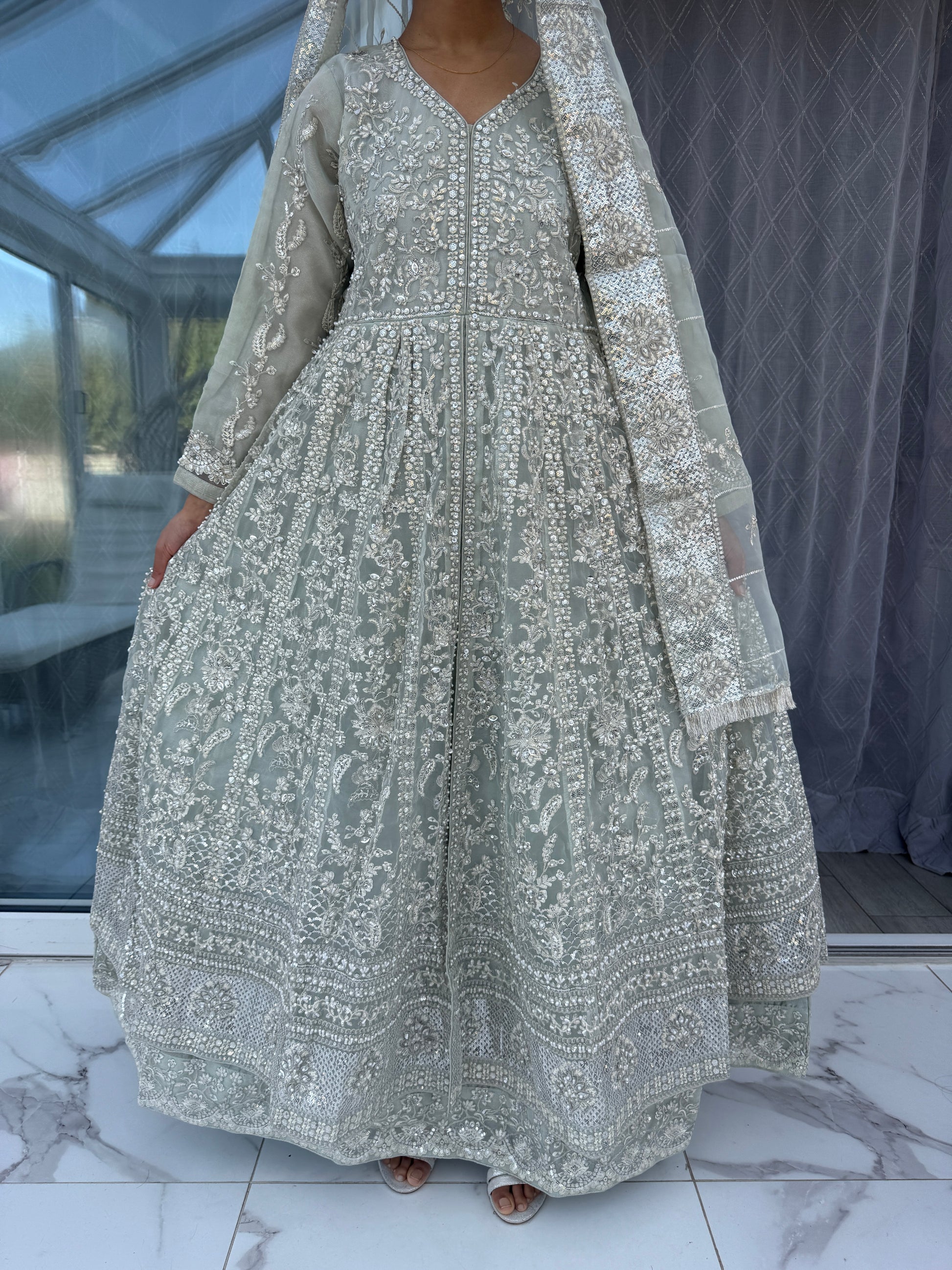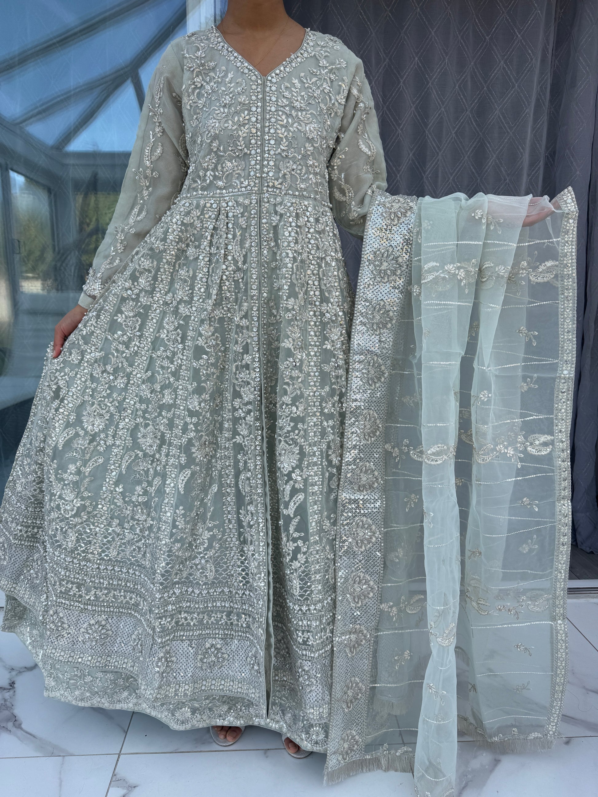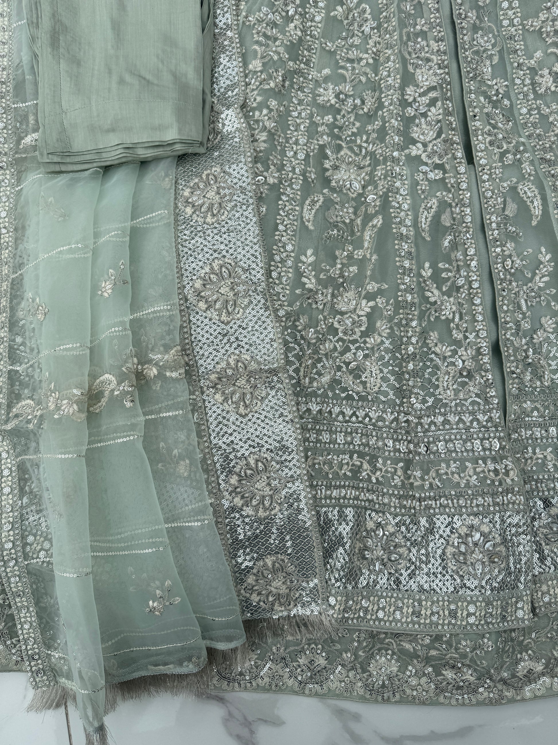 • Front and back intricately embroidered double layered organza dress with handwork, pearl detailing and sequins