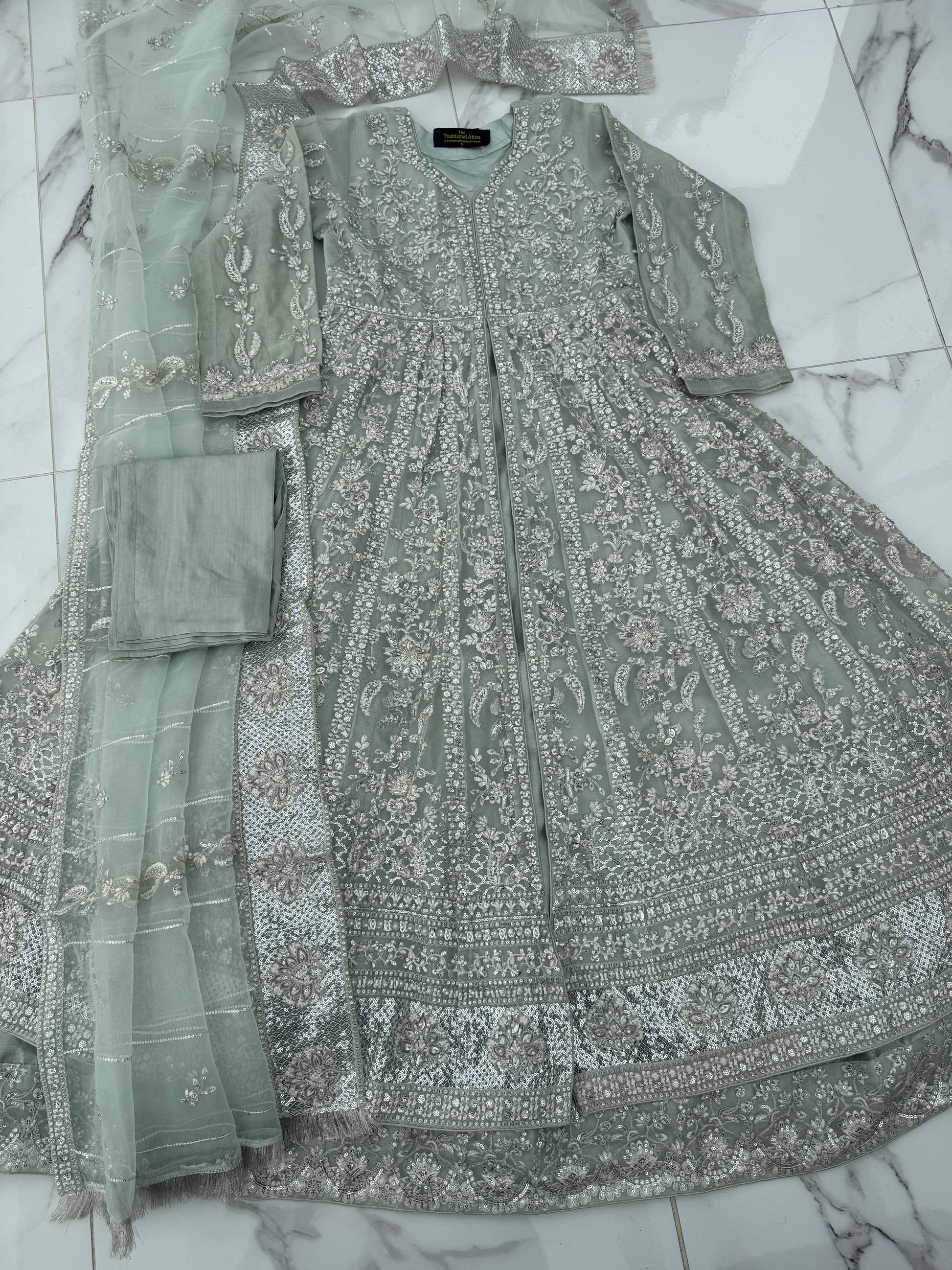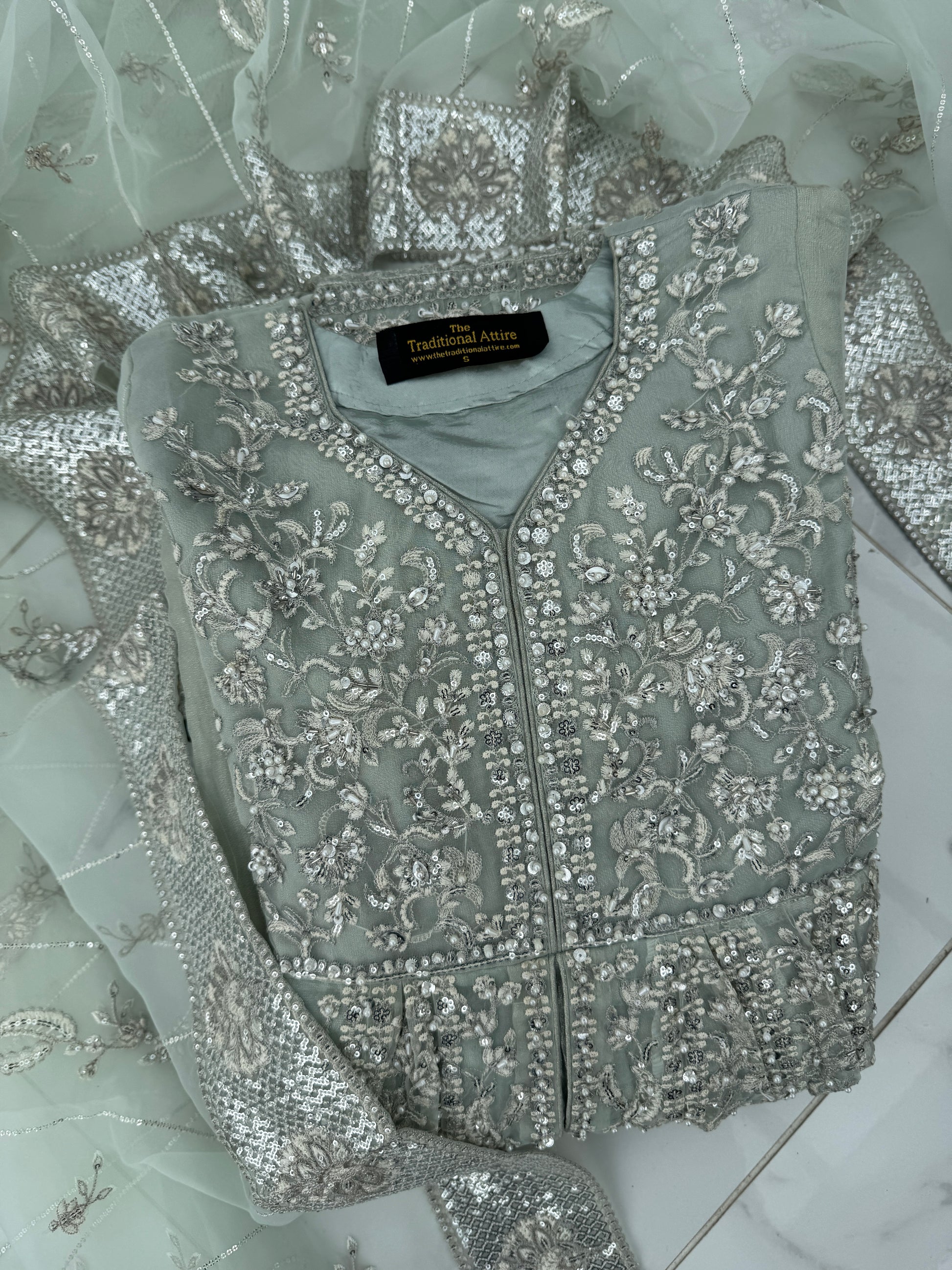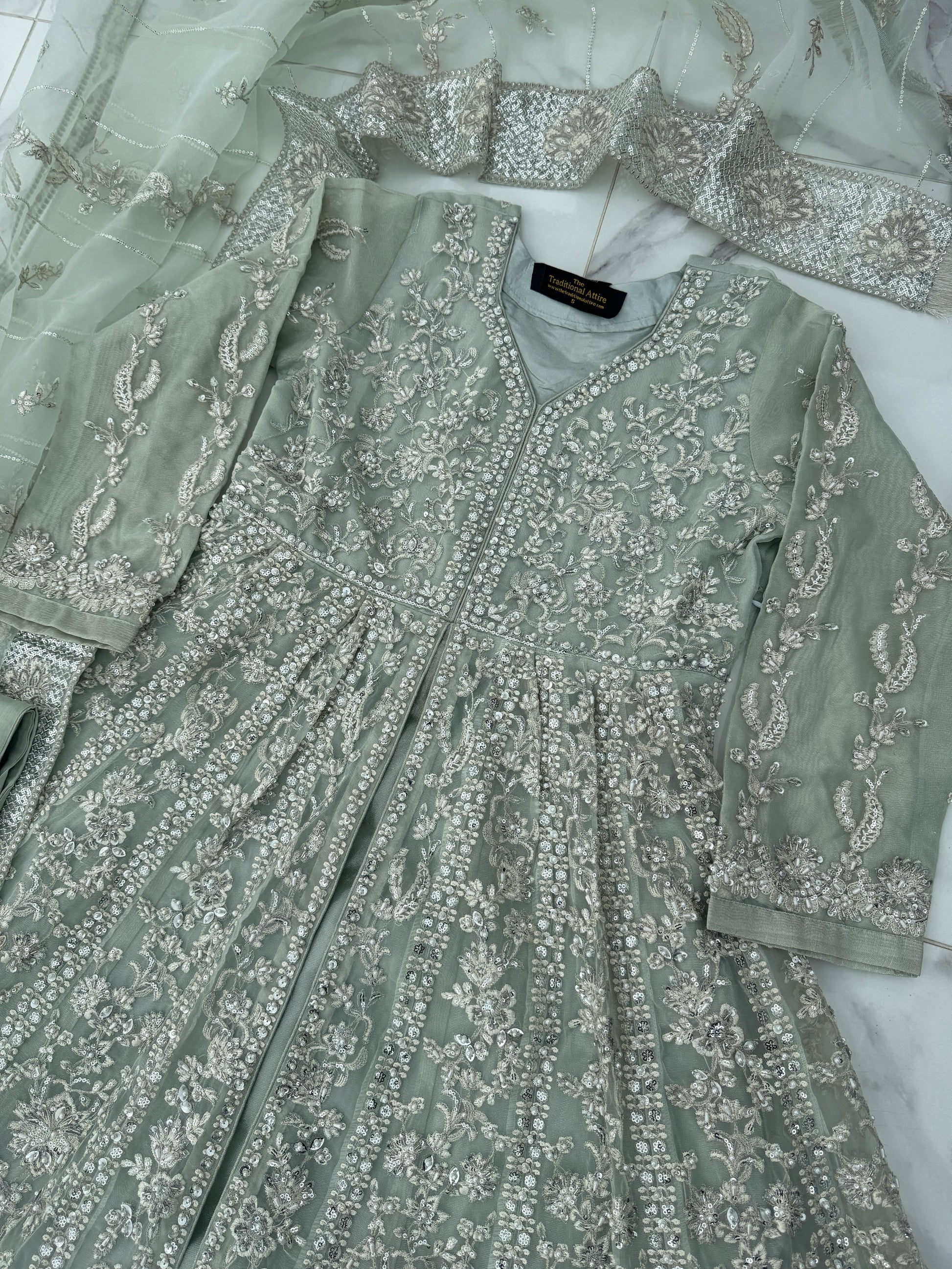 • Front and back intricately embroidered double layered organza dress with handwork, pearl detailing and sequins