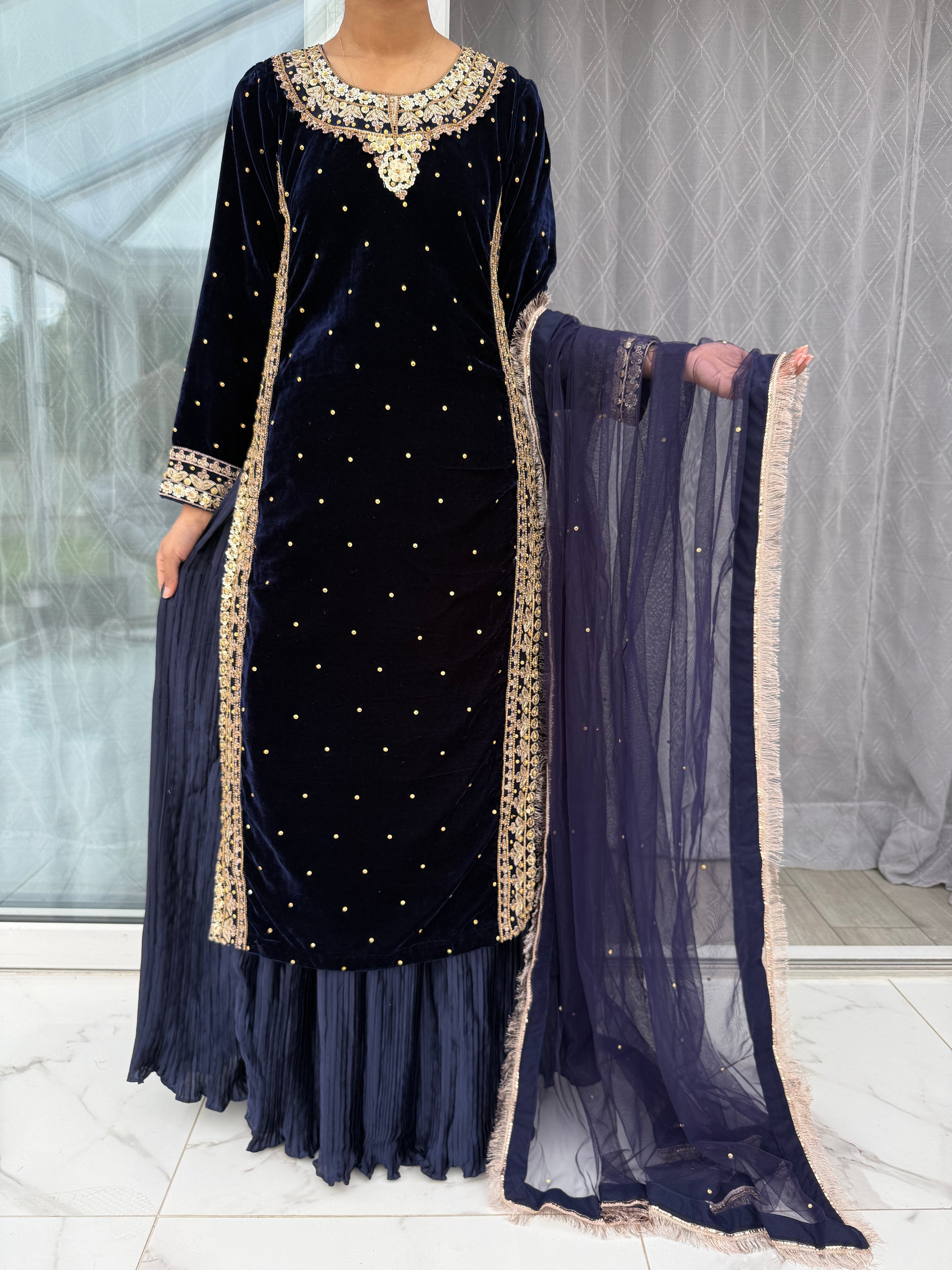 • Embroidered velvet kameez with sequins and gem embellishments