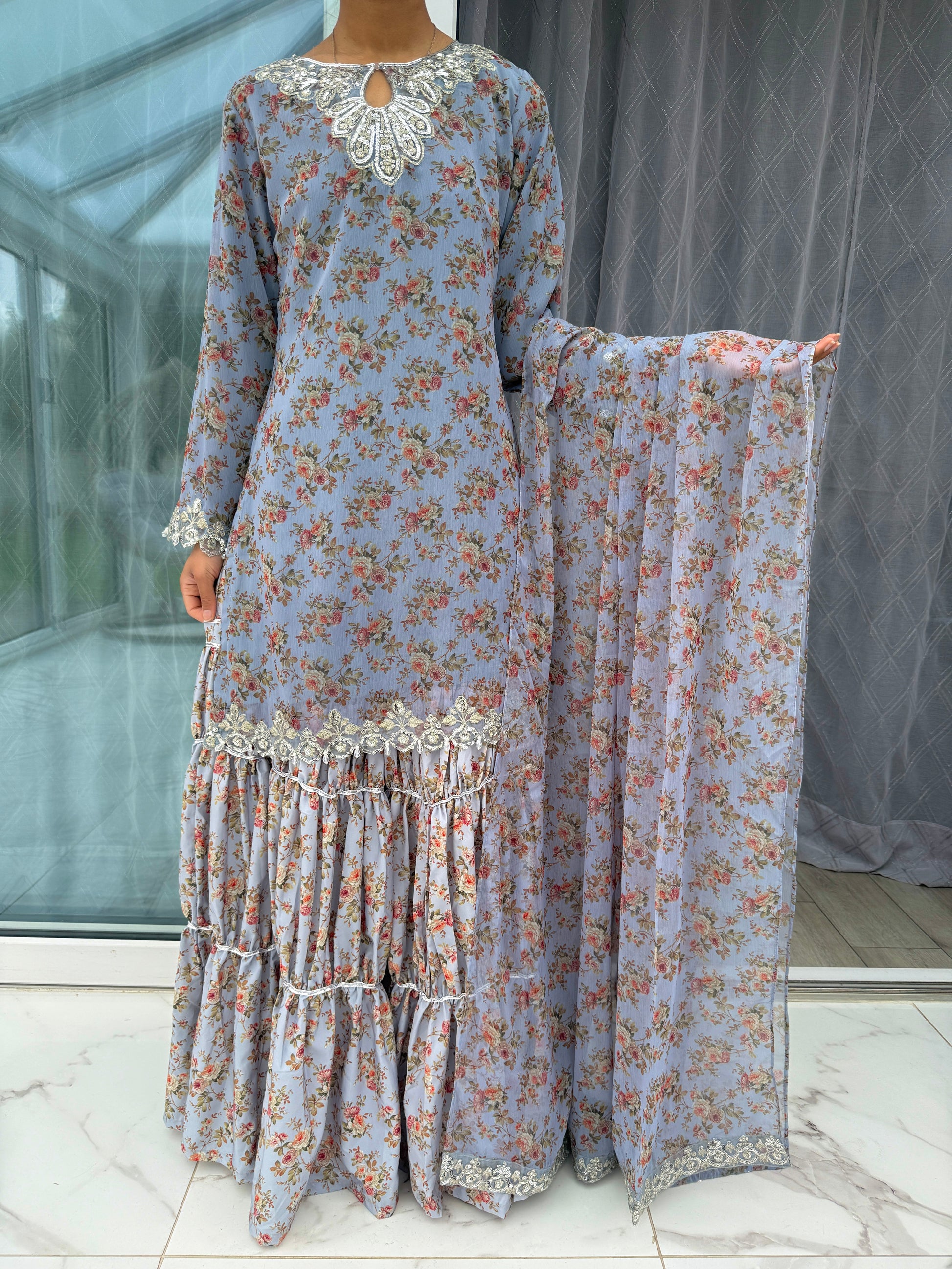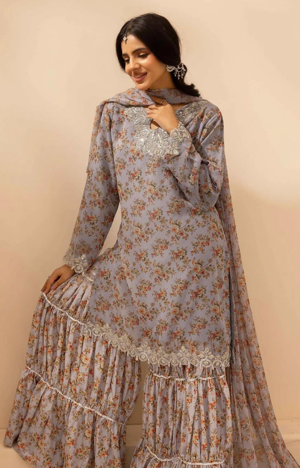 • Printed floral chiffon kameez with embroidery, sequins and embellishments