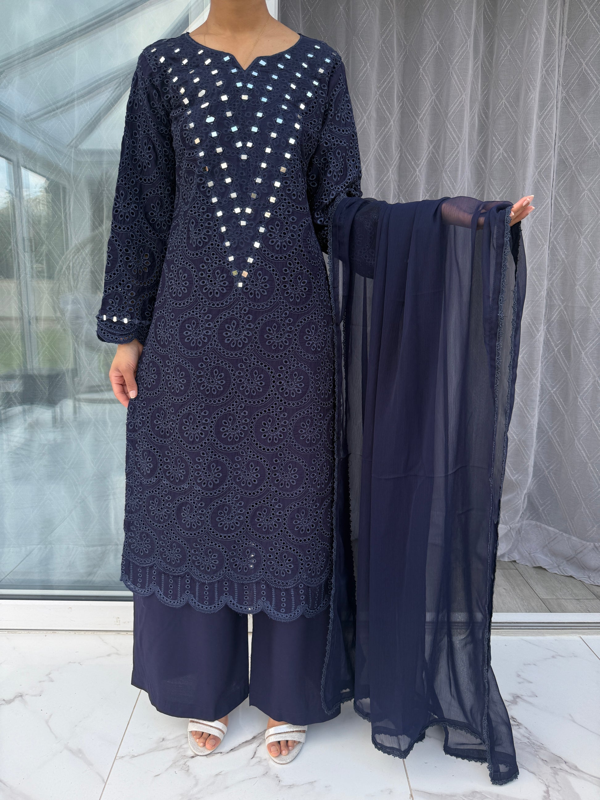 FAYZA - EMBROIDERED LINEN CHIKAN KARI KAMEEZ WITH PLAZO NAVY BLUE