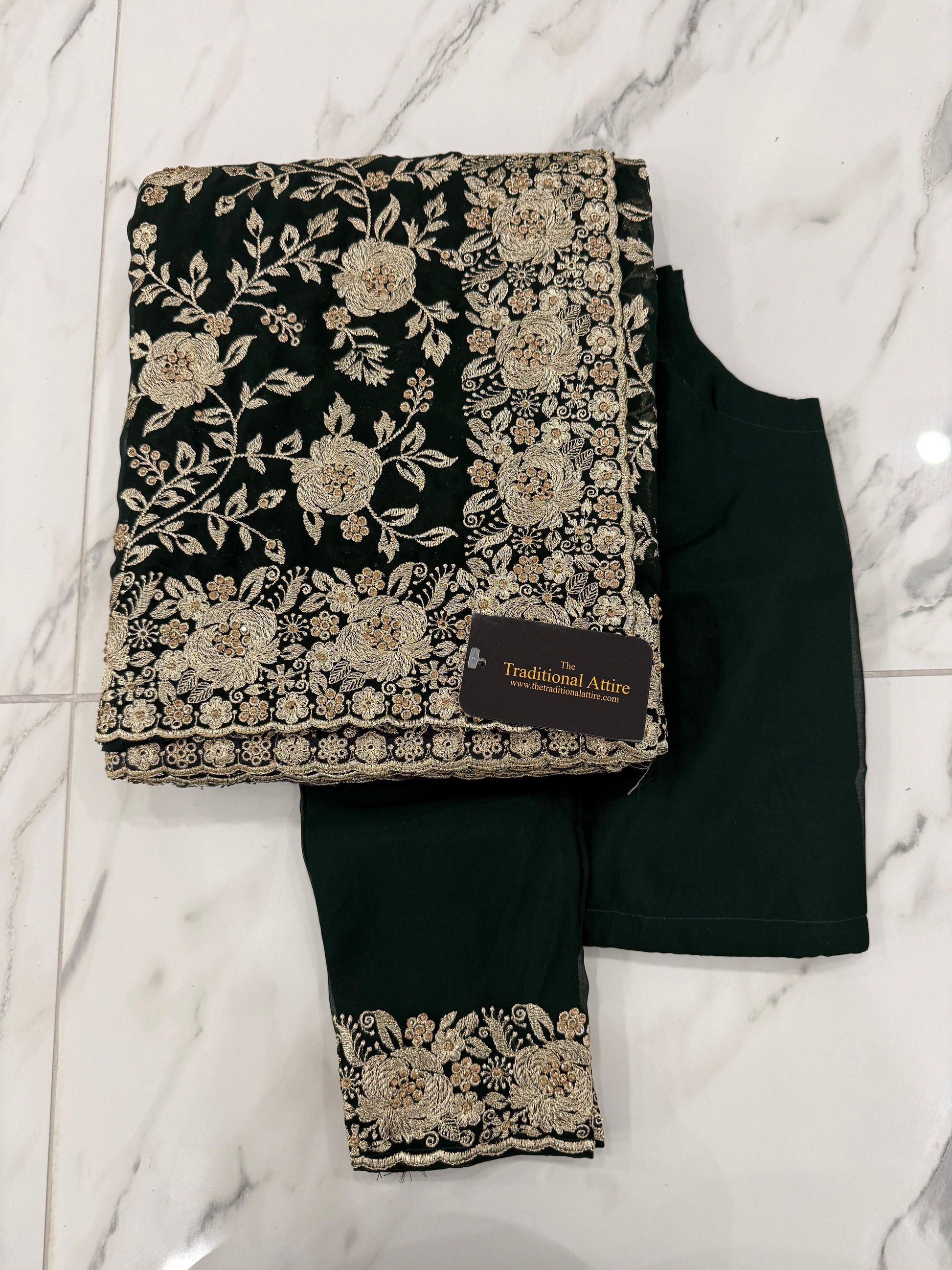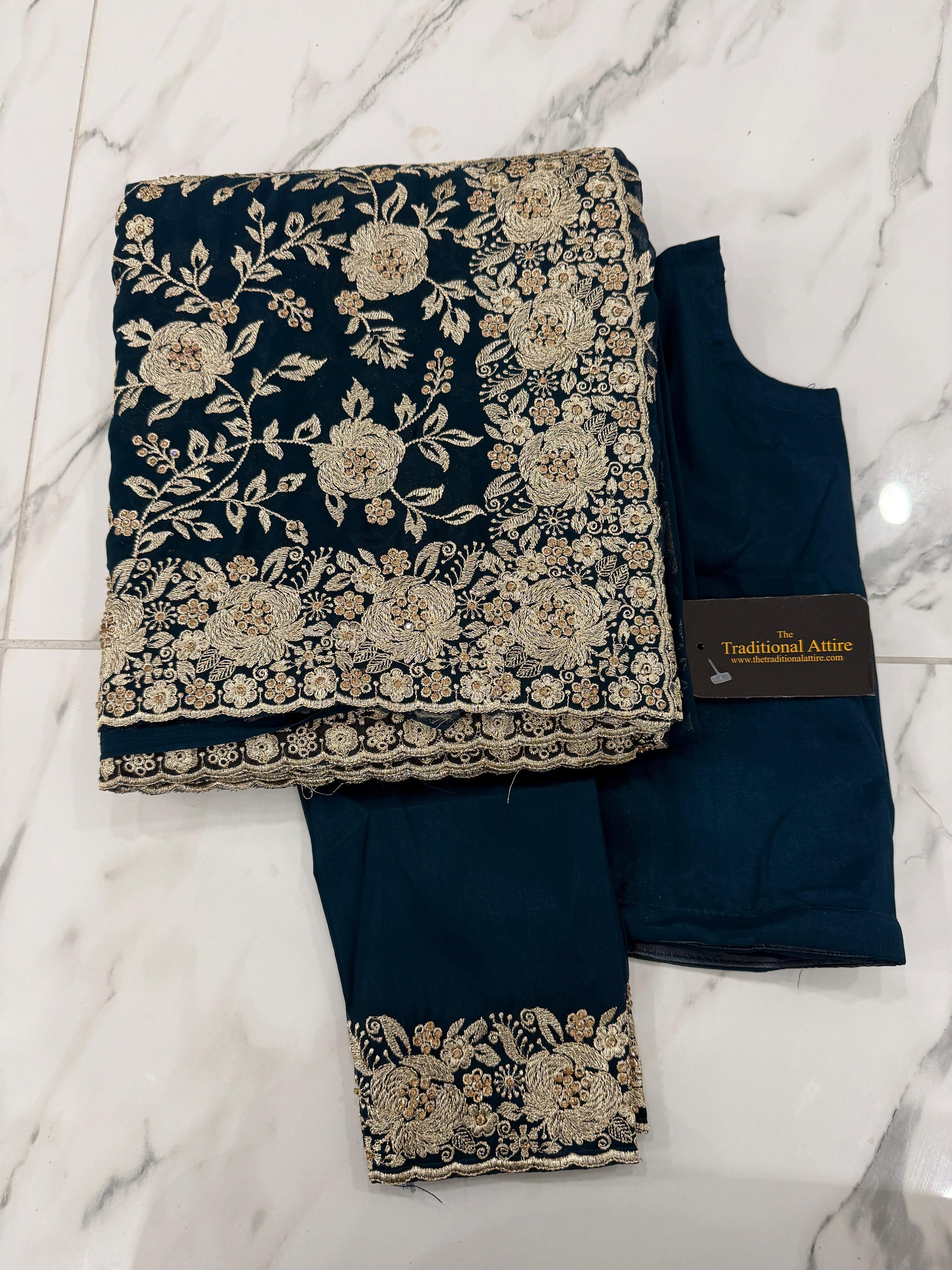 A richly embroidered saree with detailed stone and diamanté work, complemented by a blouse with graceful stone accents and embroidered sleeves.
