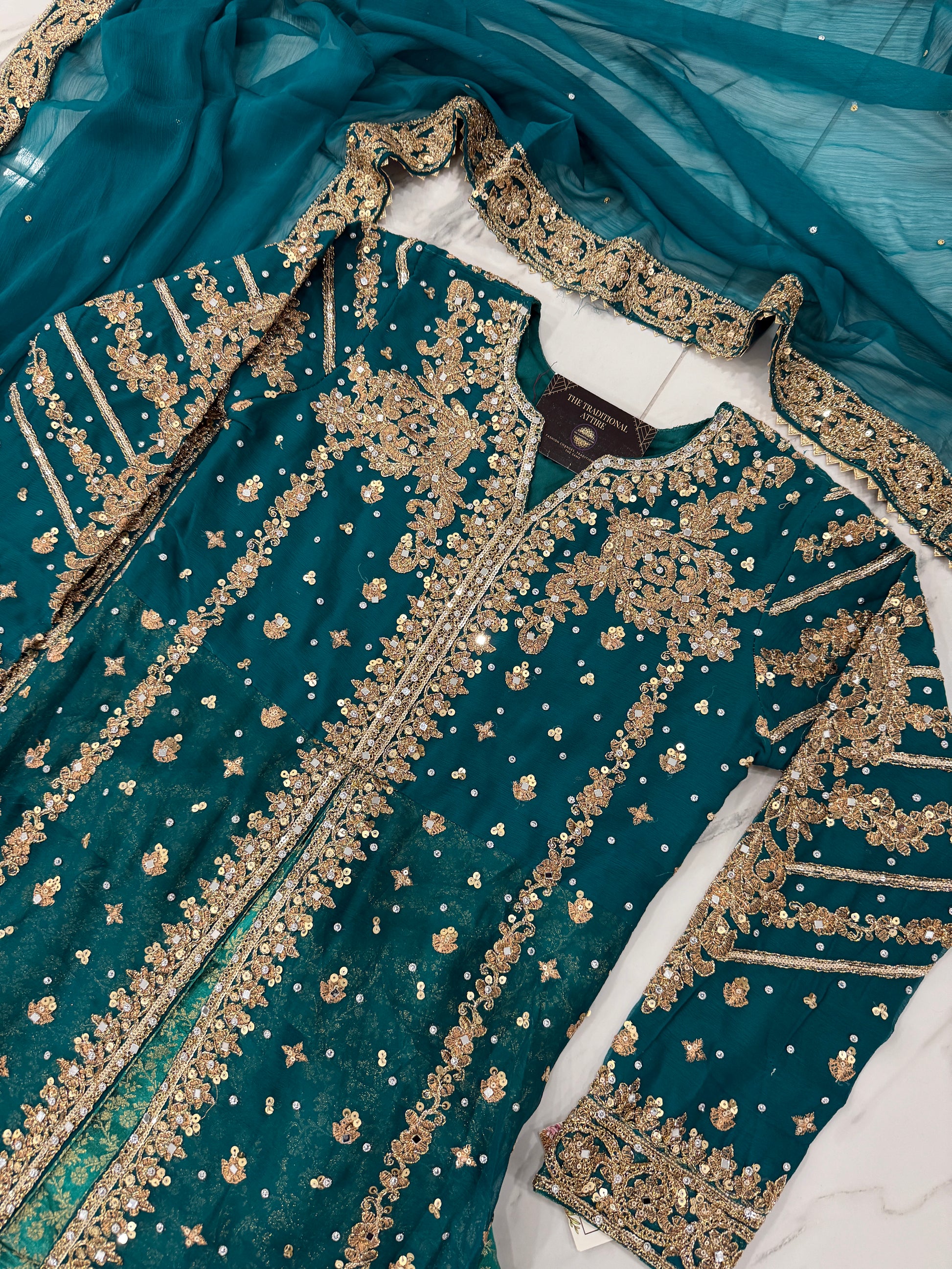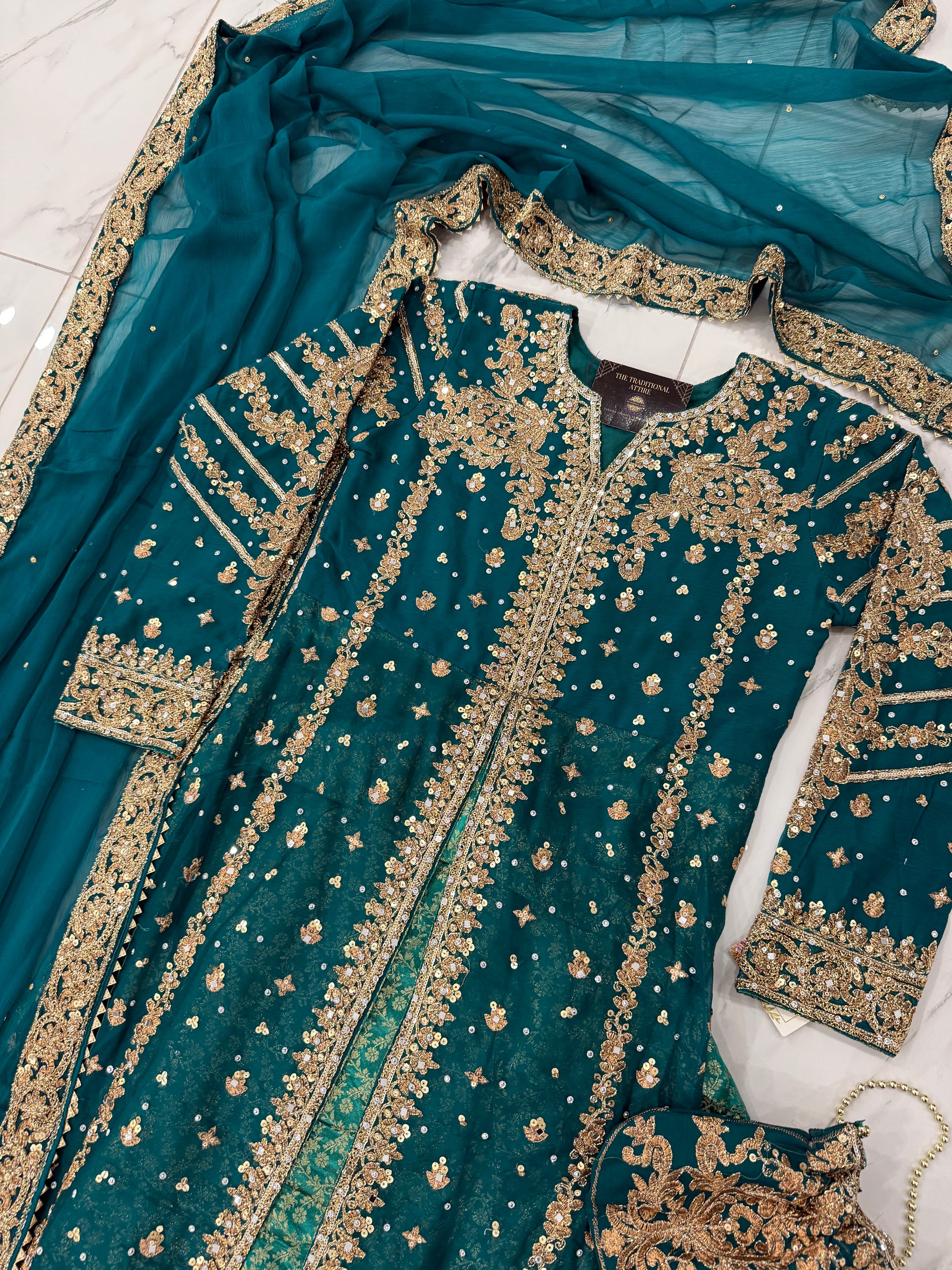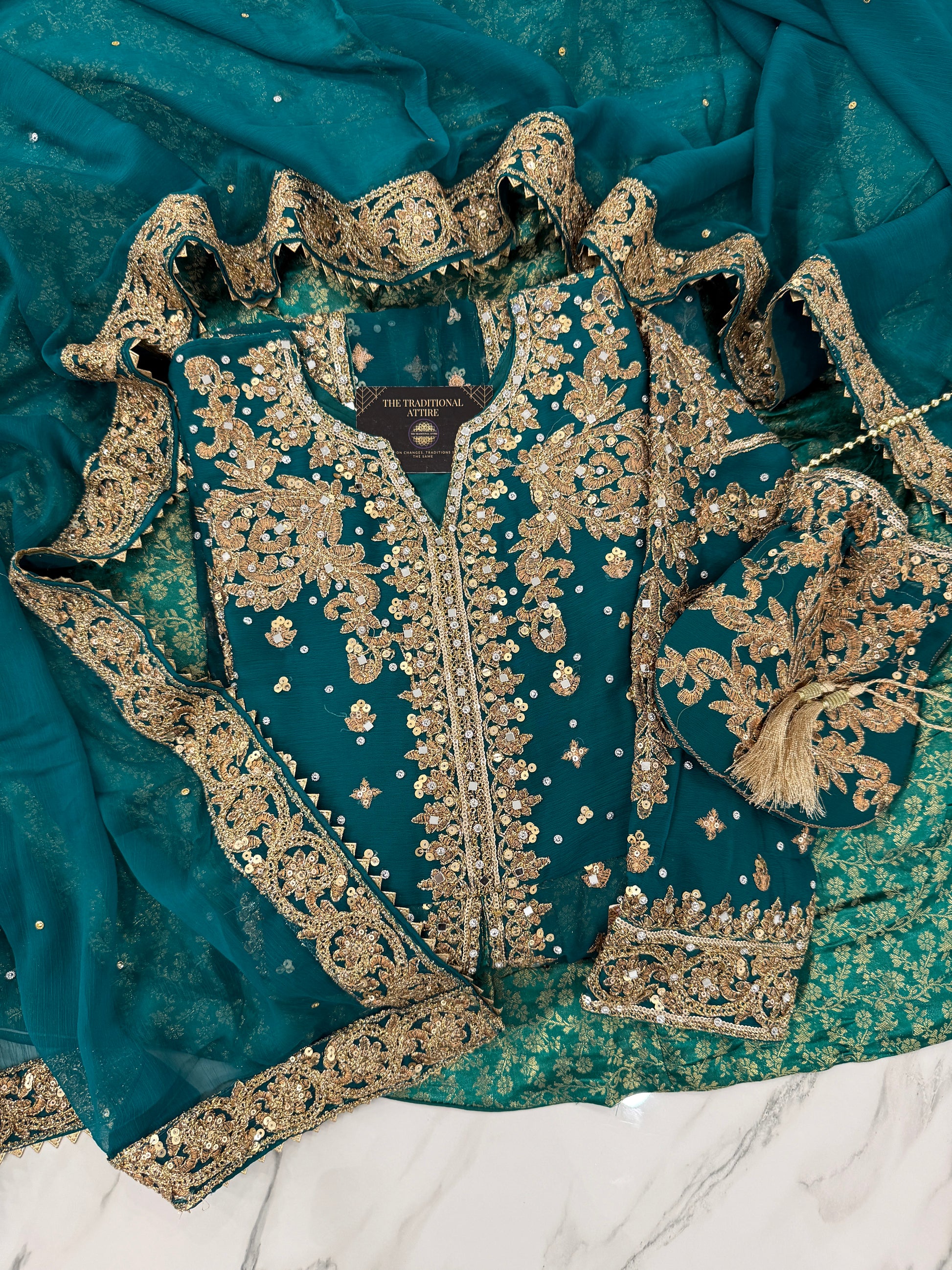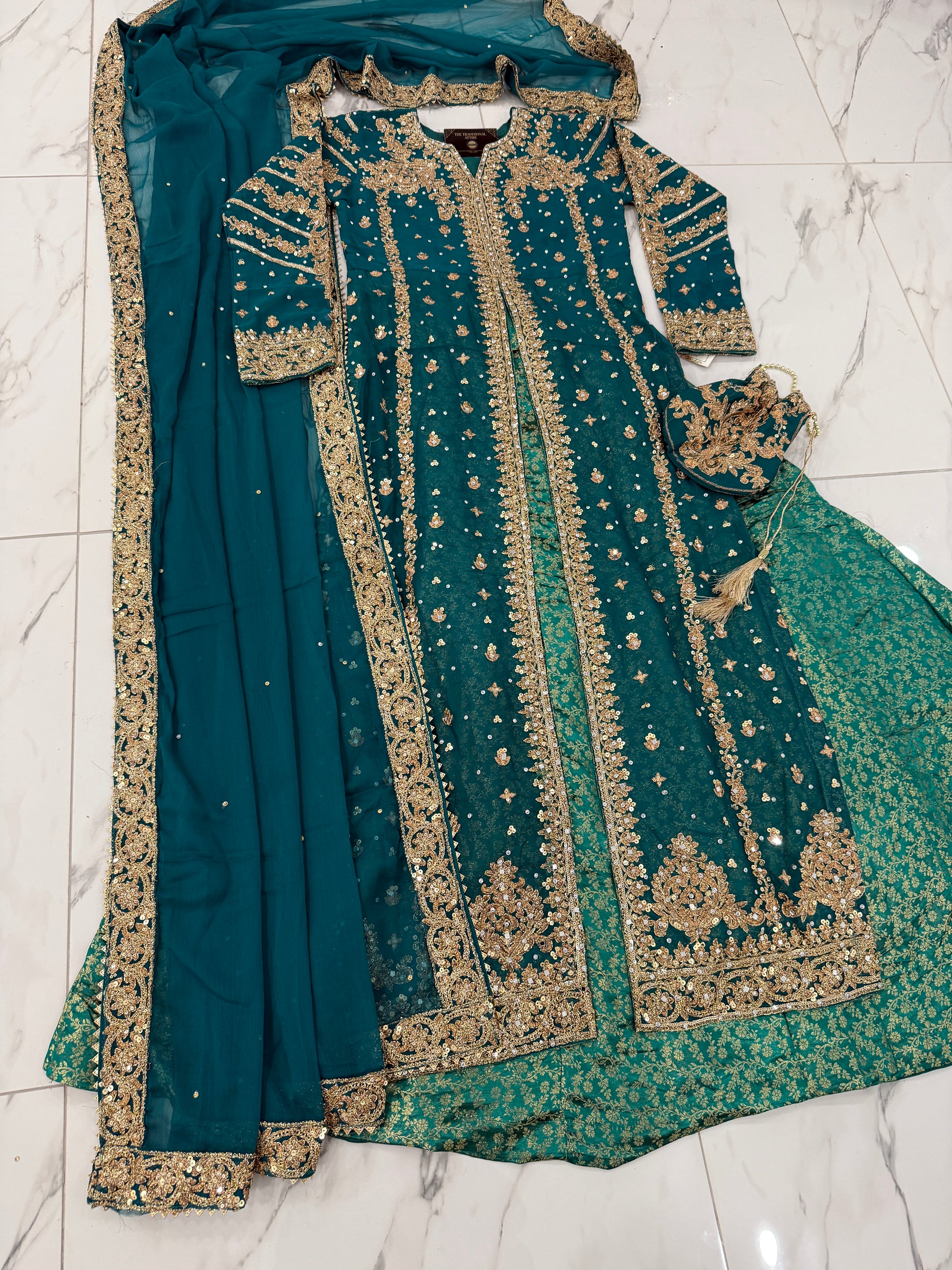 • Intricately front and back embroidered chiffon kameez with sequins and gems