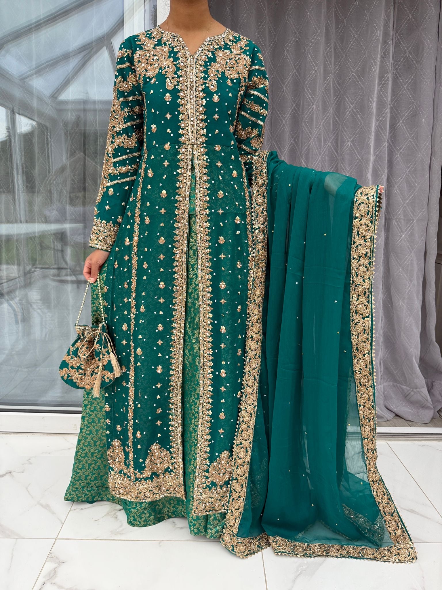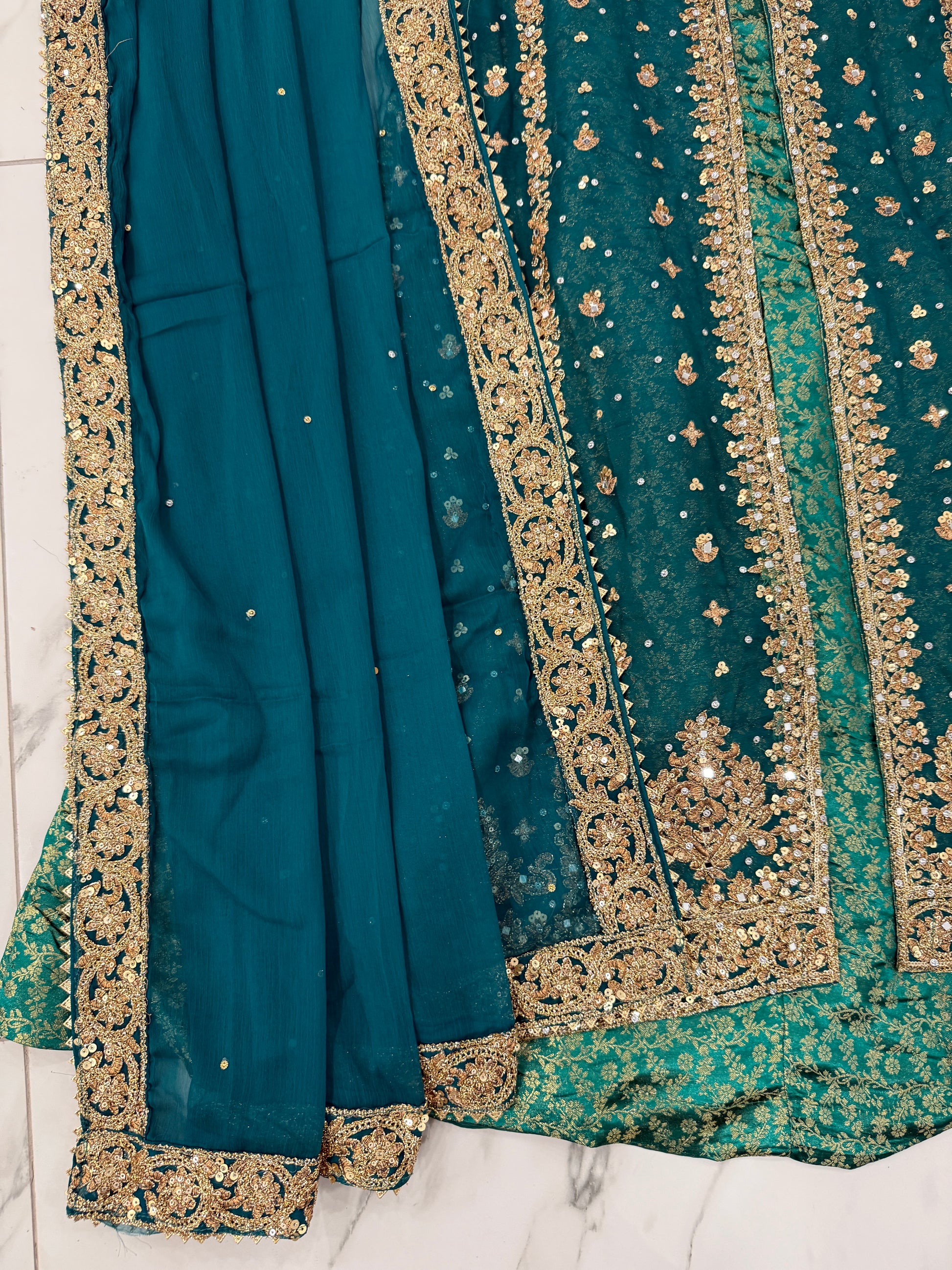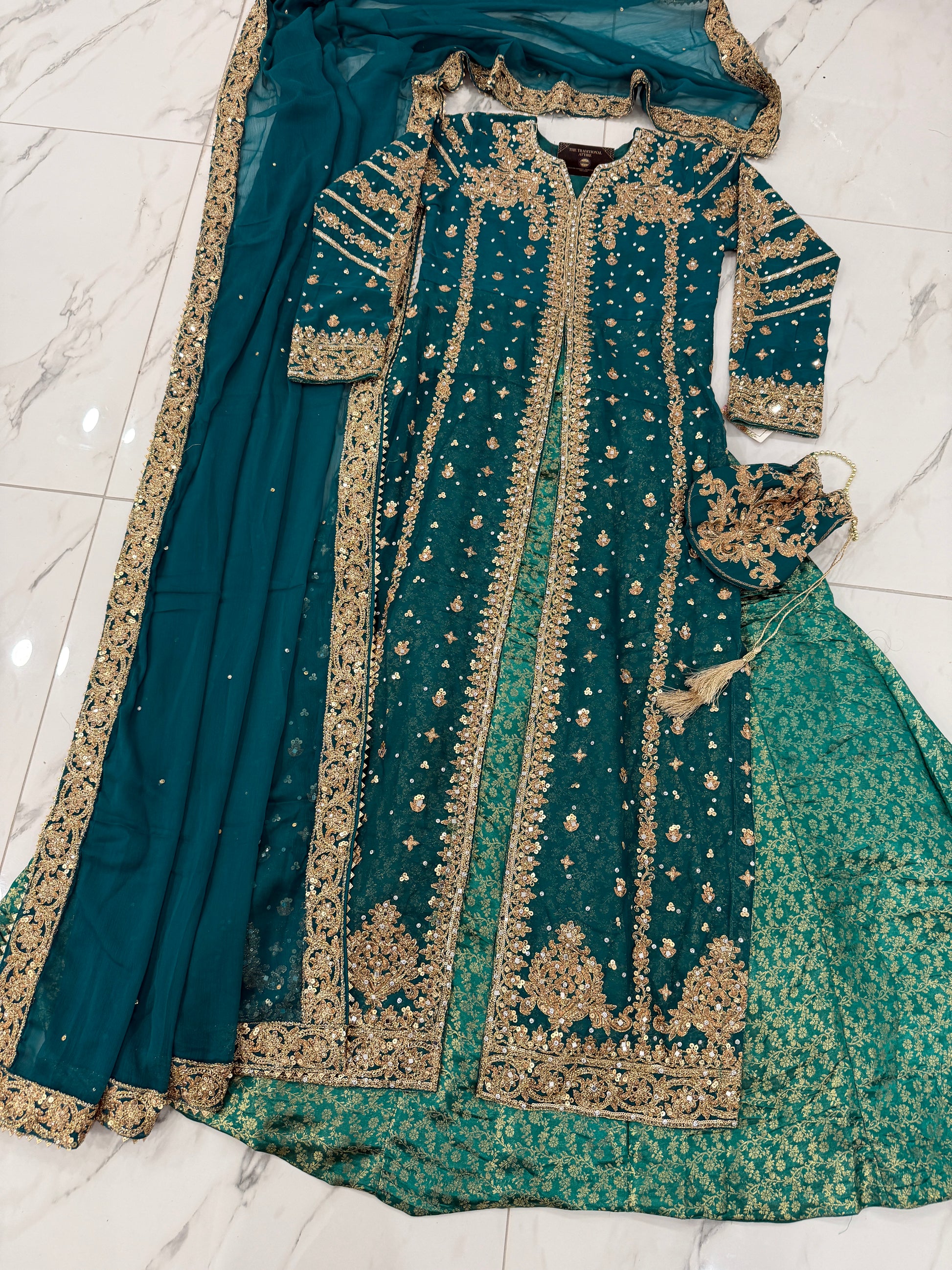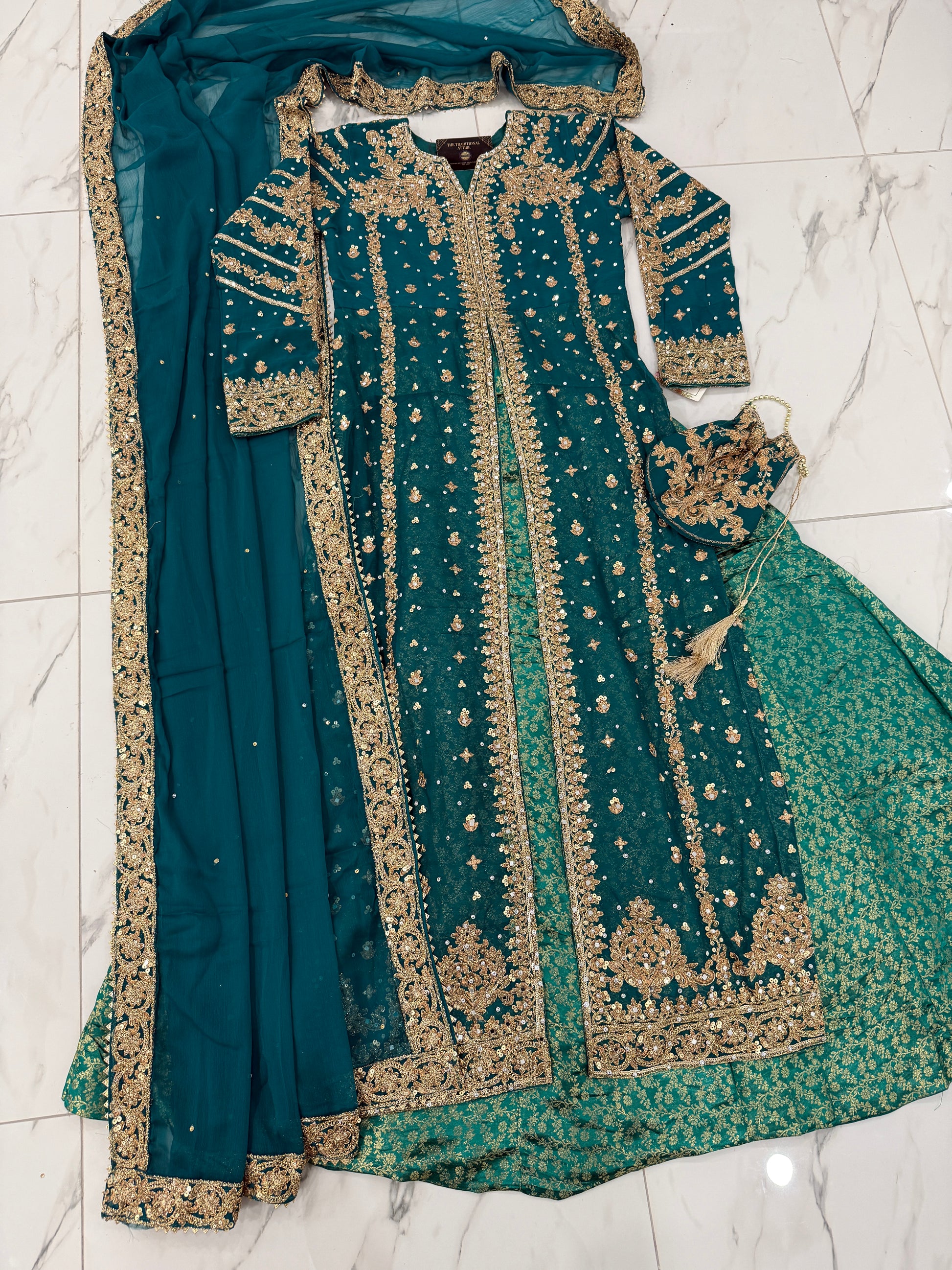 • Intricately front and back embroidered chiffon kameez with sequins and gems