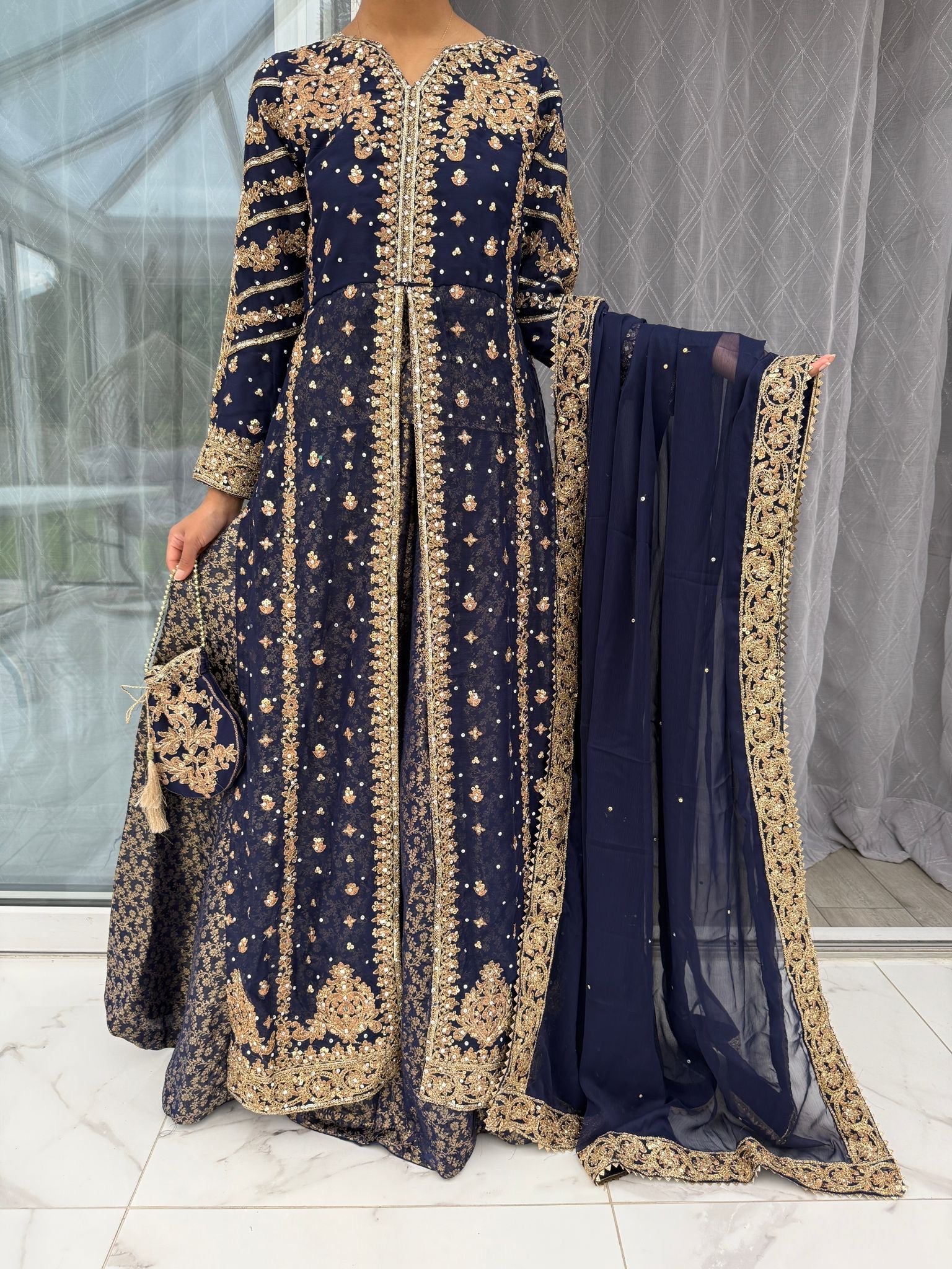 • Intricately front and back embroidered chiffon kameez with sequins and gems