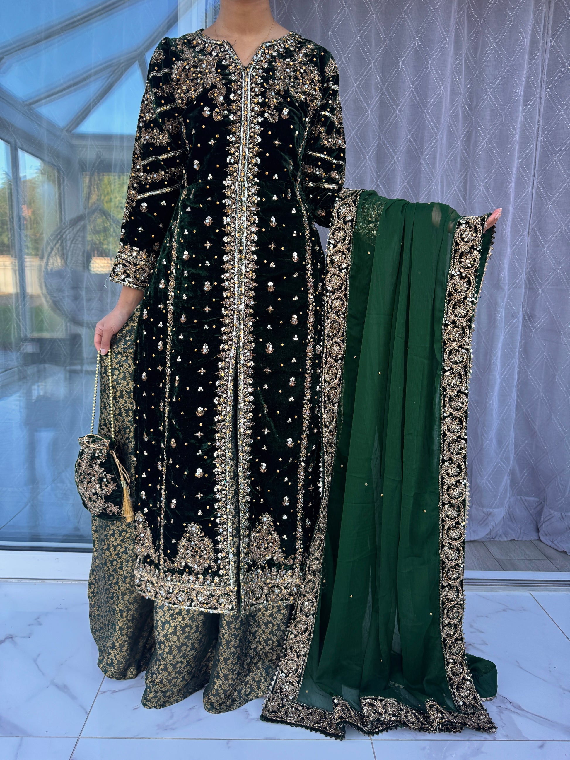 • Intricately front and back embroidered velvet kameez with sequins and gems