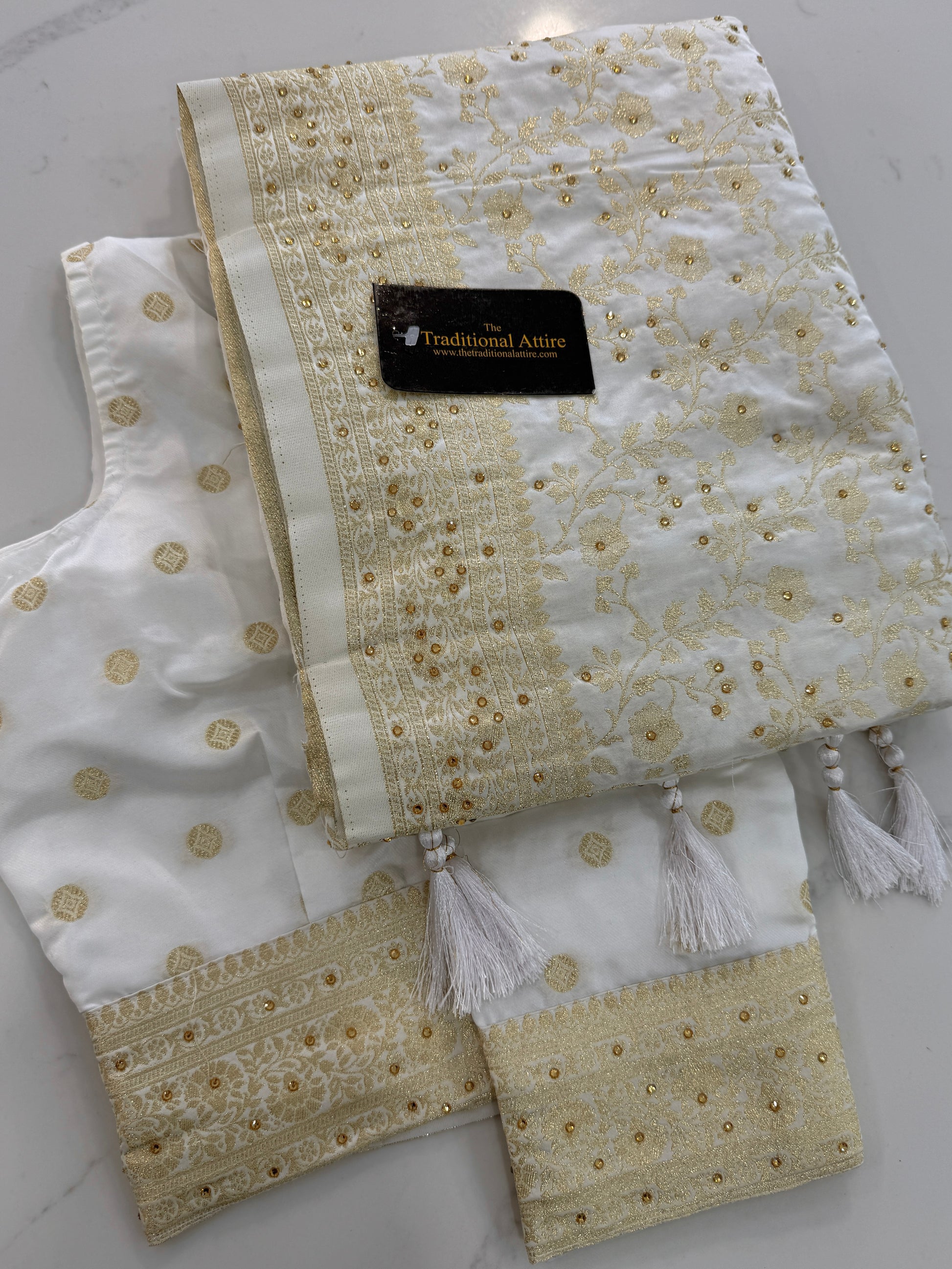 Elevate your style with our luxurious Banarasi Katan saree, featuring diamanté k that adds a touch of sparkle to its rich, traditional weave. Perfect for weddings and festive occasions, this saree blends timeless craftsmanship with refined elegance.
