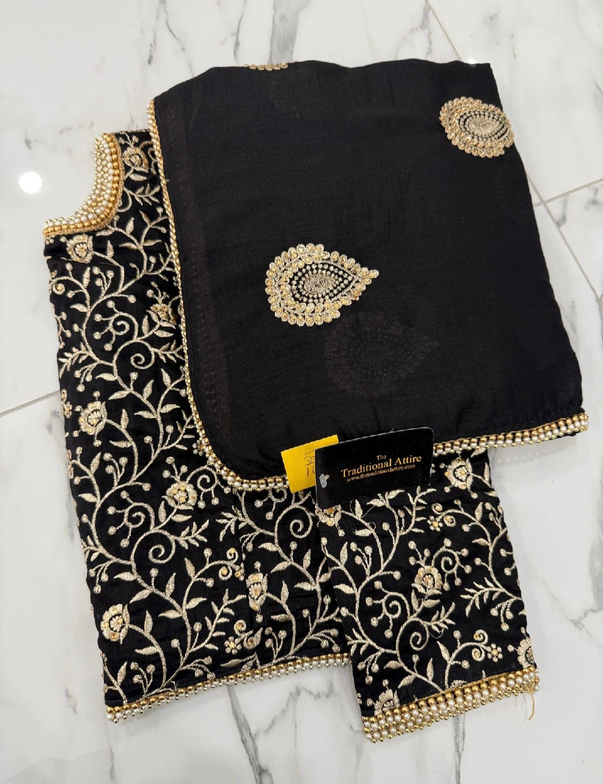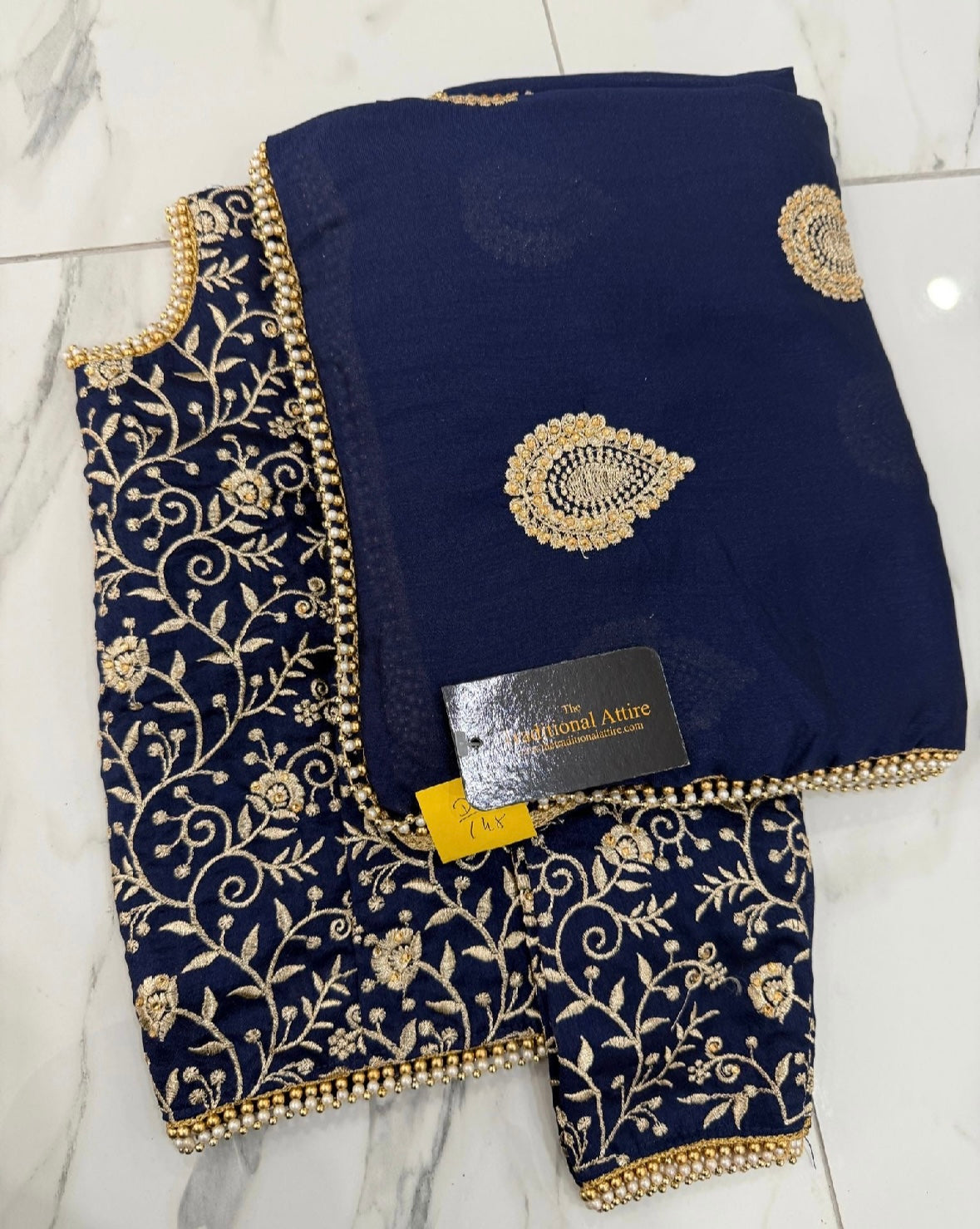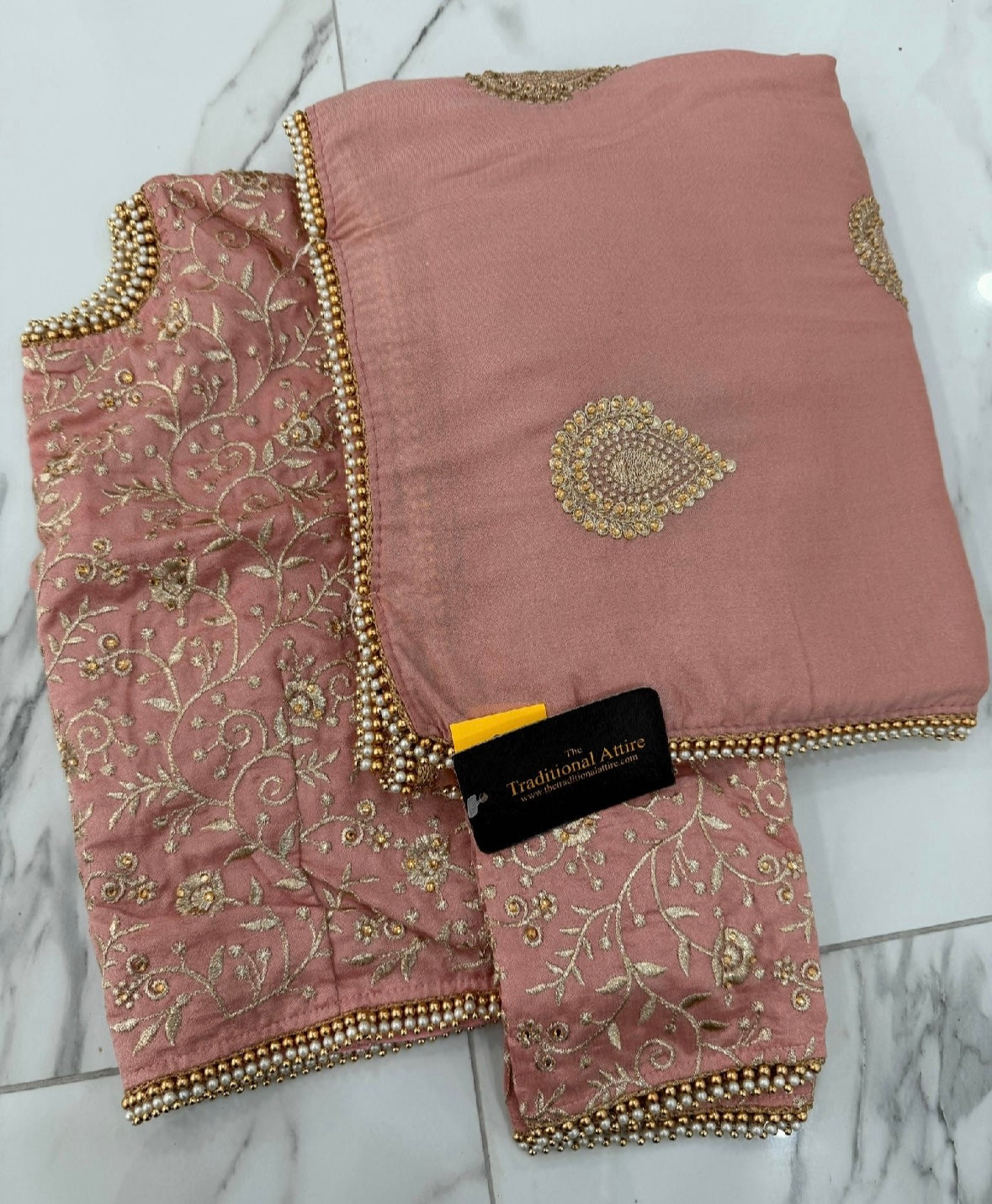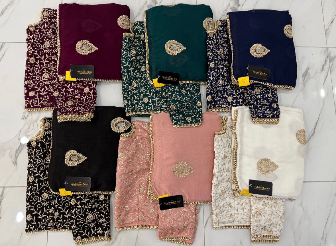 A stunning saree in six colours, zari embroidered and beautifully enhanced with gems and pearl-beaded finishing. The blouse is adorned with matching embroidery and pearls, making it perfect for any occasion.