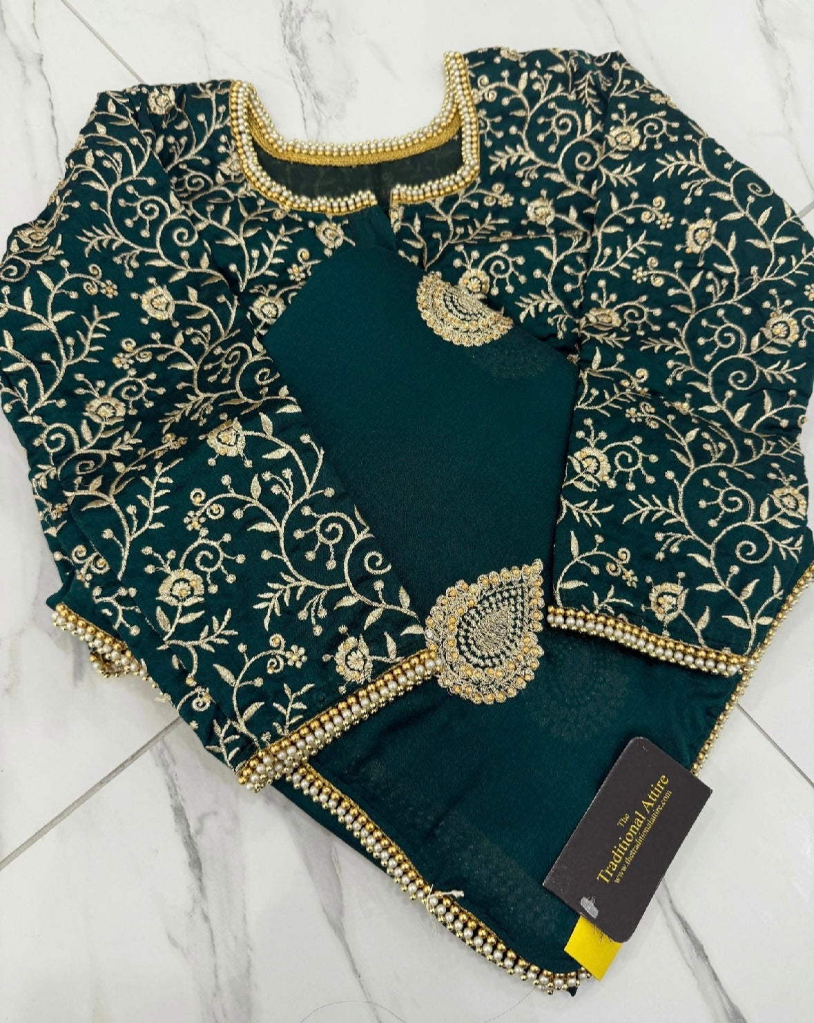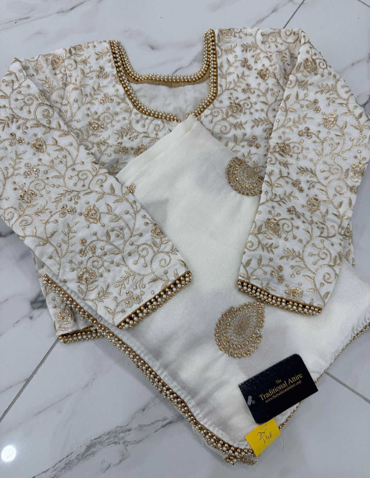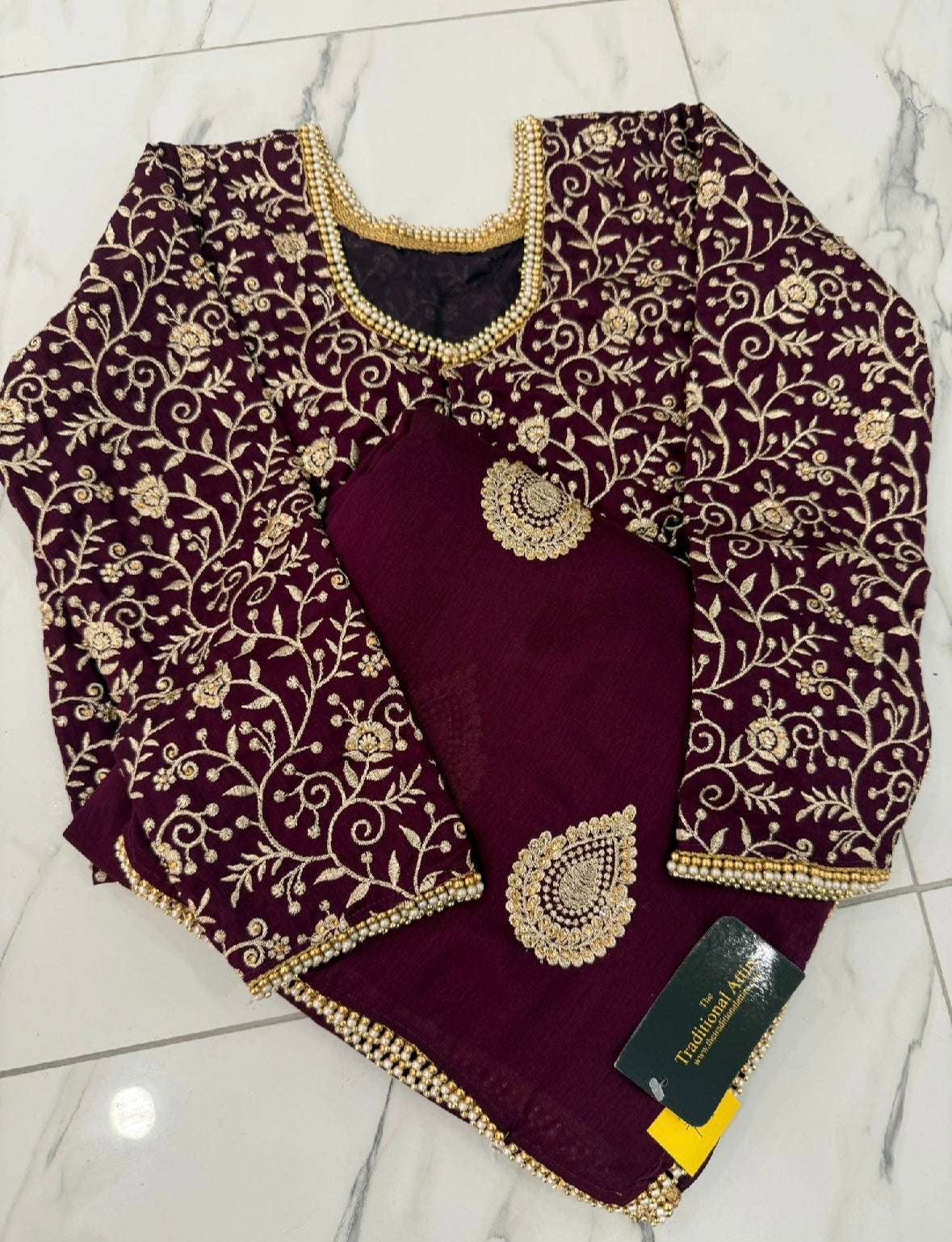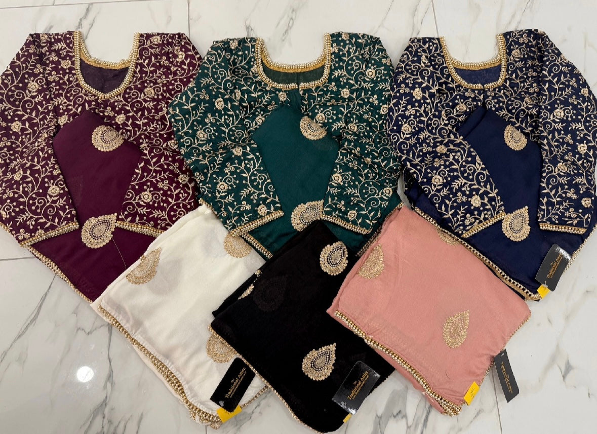 A stunning saree in six colours, zari embroidered and beautifully enhanced with gems and pearl-beaded finishing. The blouse is adorned with matching embroidery and pearls, making it perfect for any occasion.