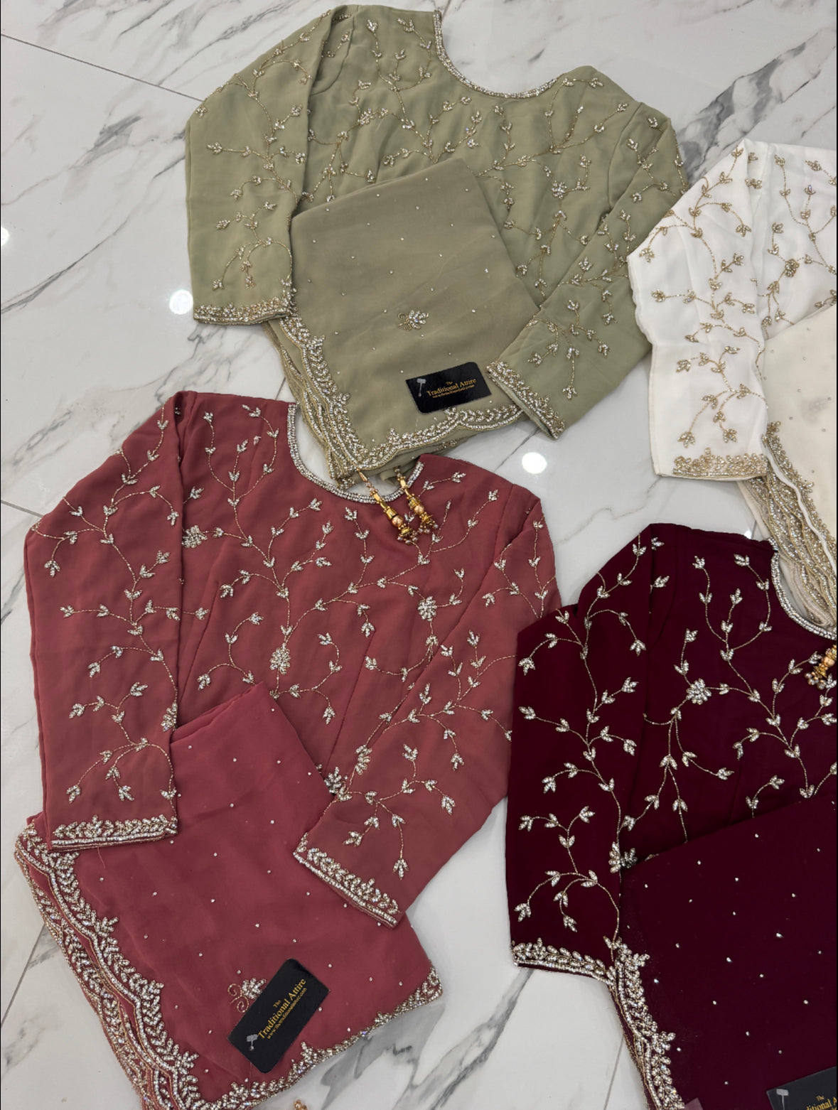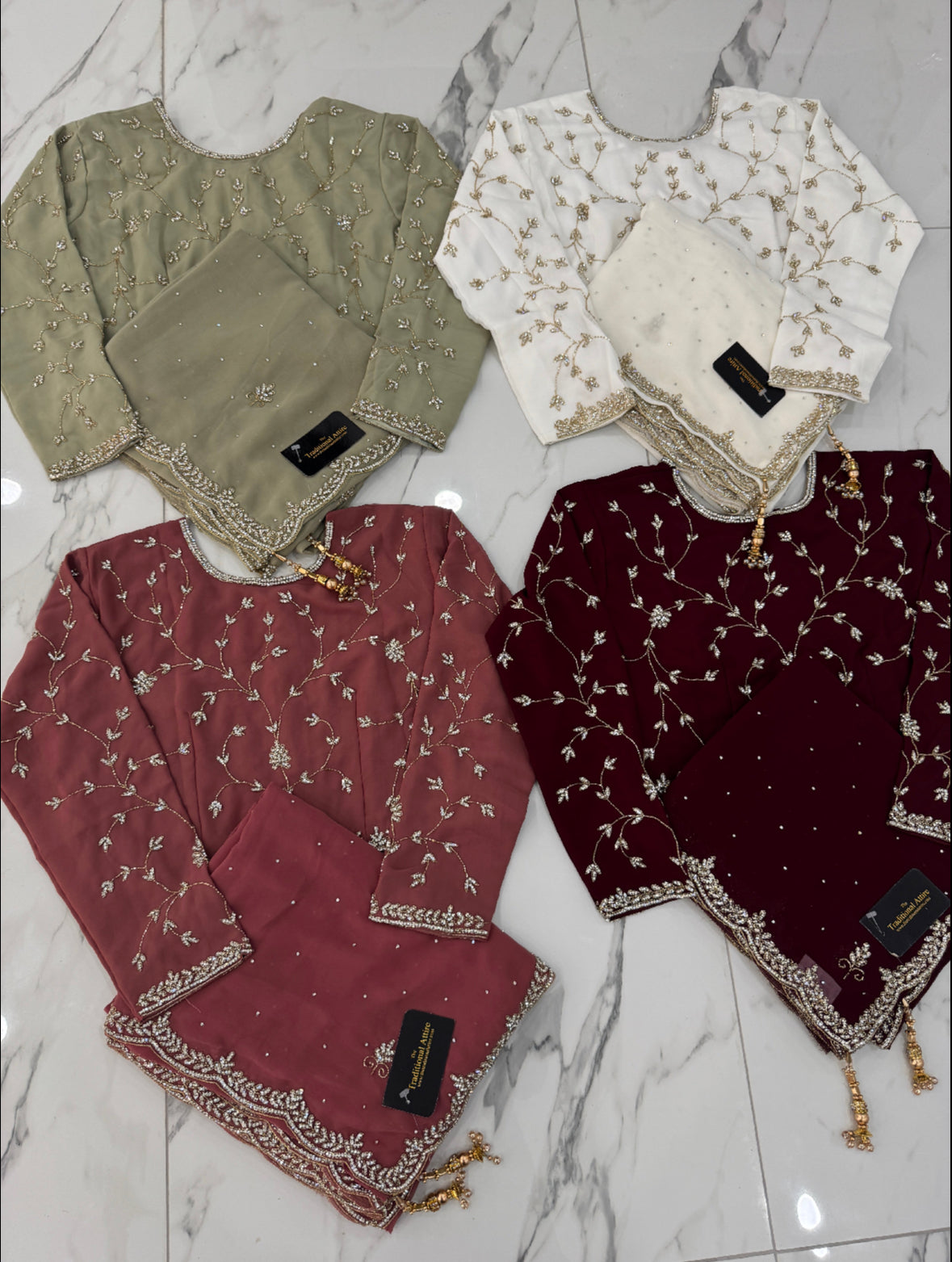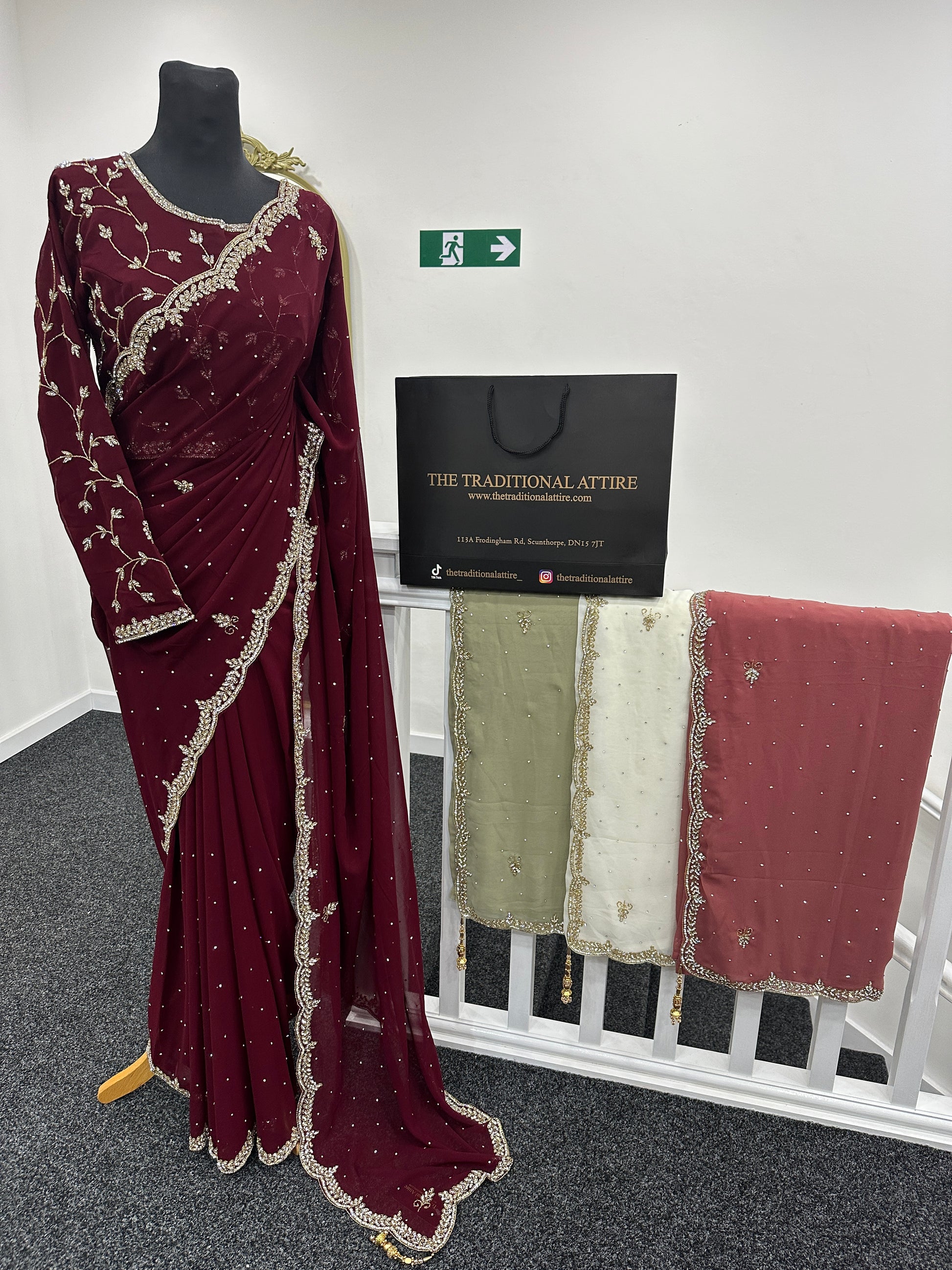 A timeless collection of sarees in sage, white, maroon, and pink, adorned with delicate stonework and beaded embellishments that add just the right touch of sparkle and grace.