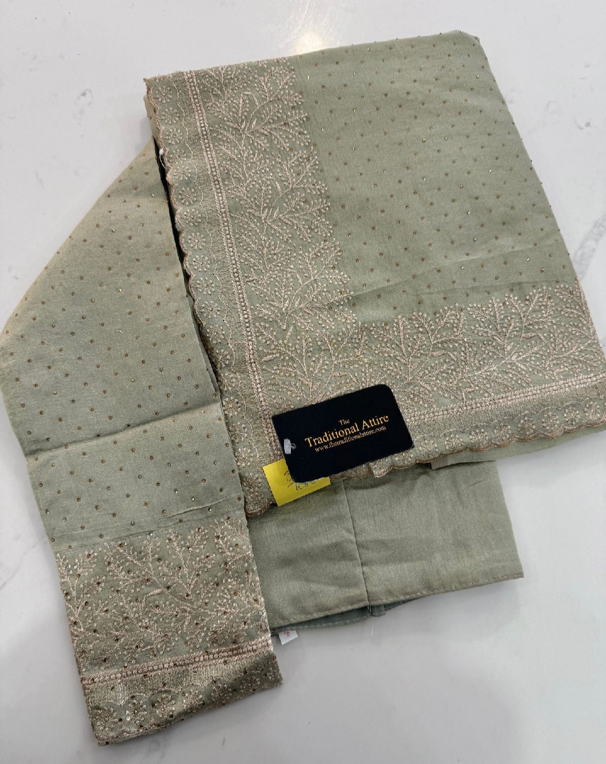 Elevate your ethnic elegance with this exquisite sari, a timeless blend of tradition and glamour. Crafted from luxurious fabric, the saree features intricate zari embroidery and scattered diamanté.