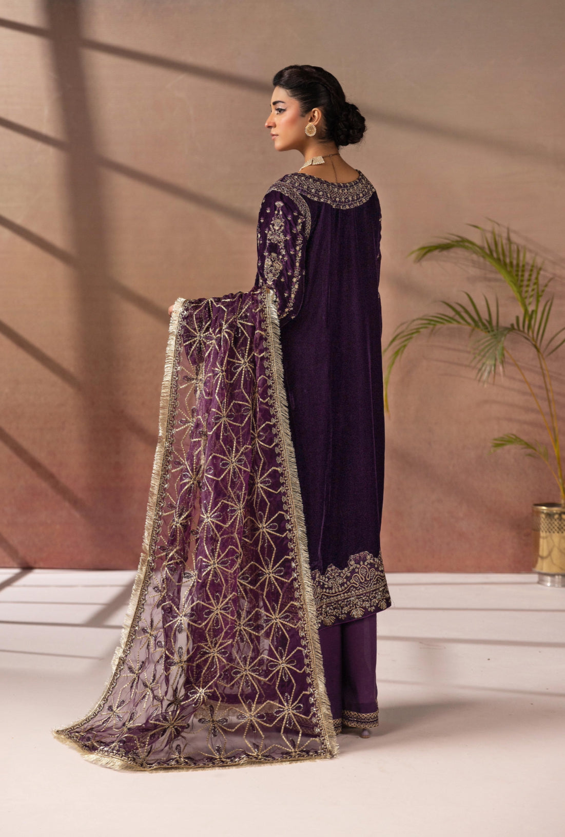 • Front and back intricately embroidered velvet kameez with sequins and pearl embellishments