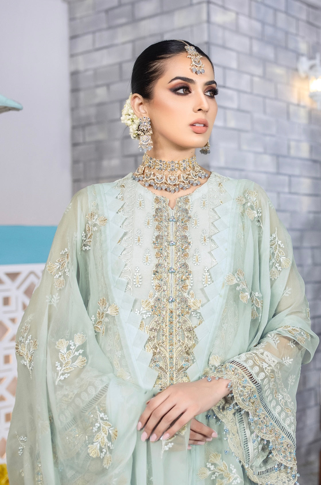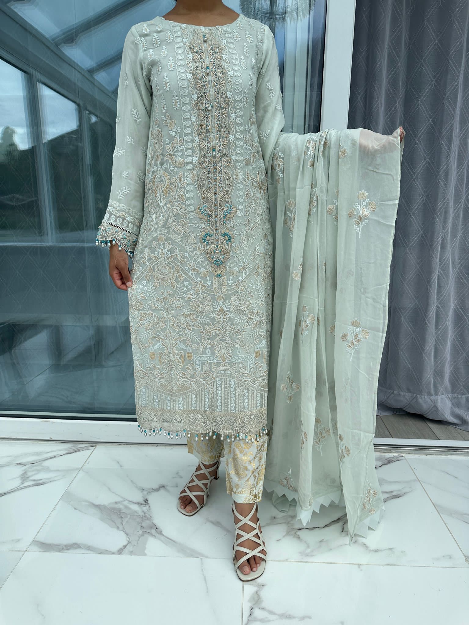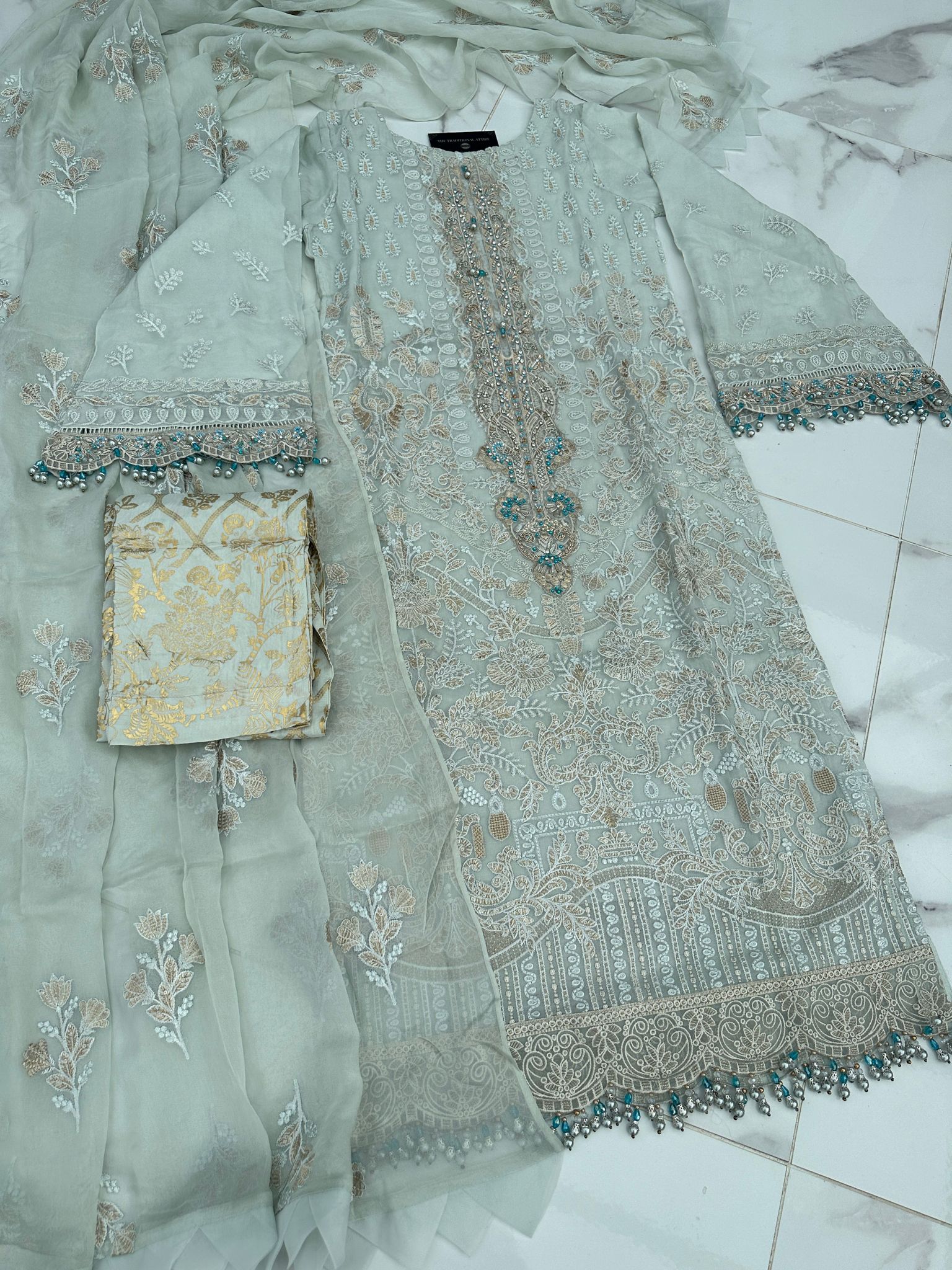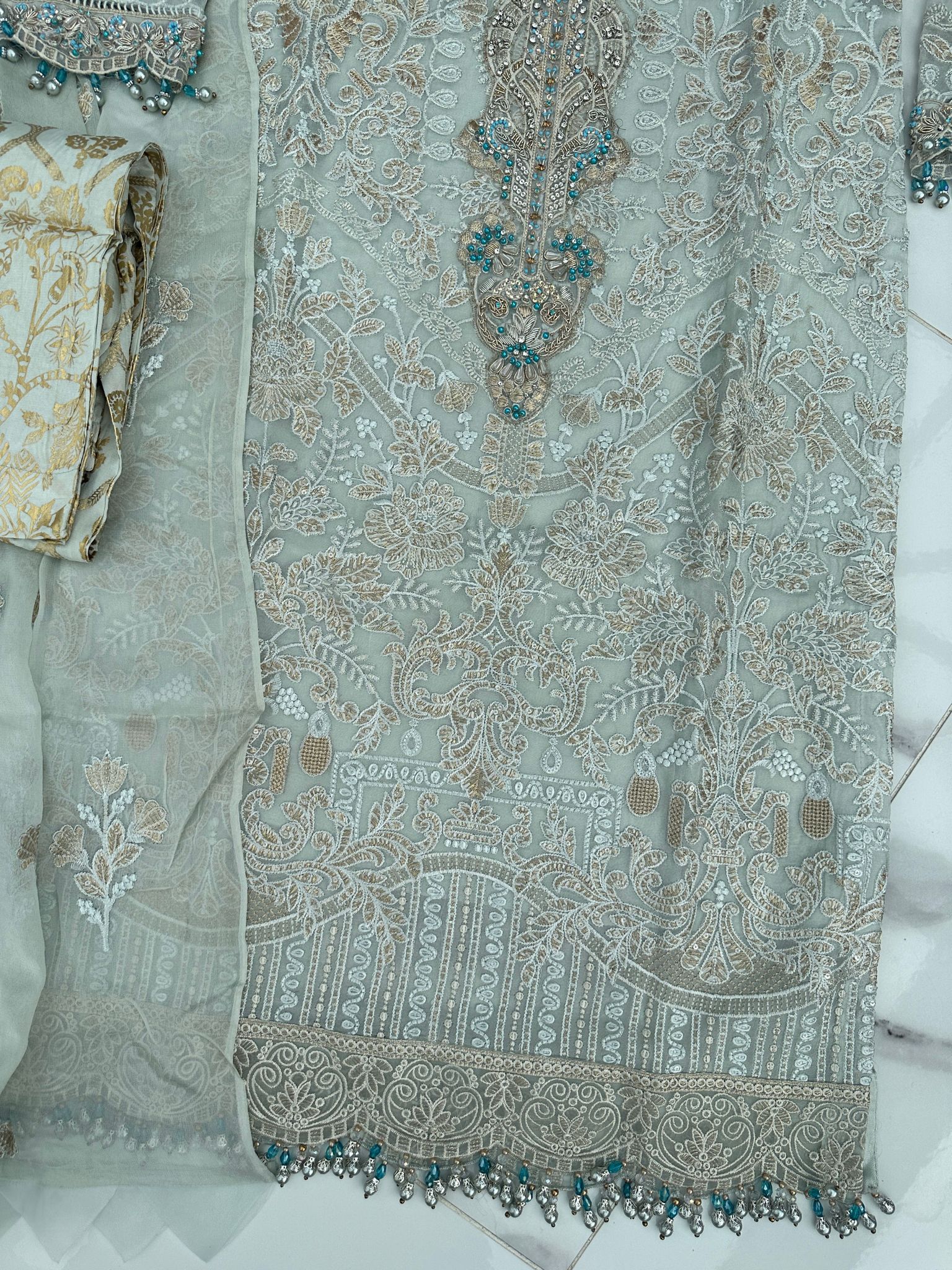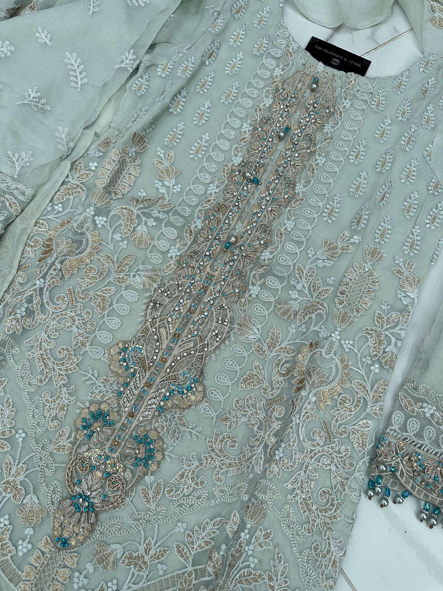 • Fully embroidered luxury chiffon outfit with neckline handwork, embroidered sleeves and tassels